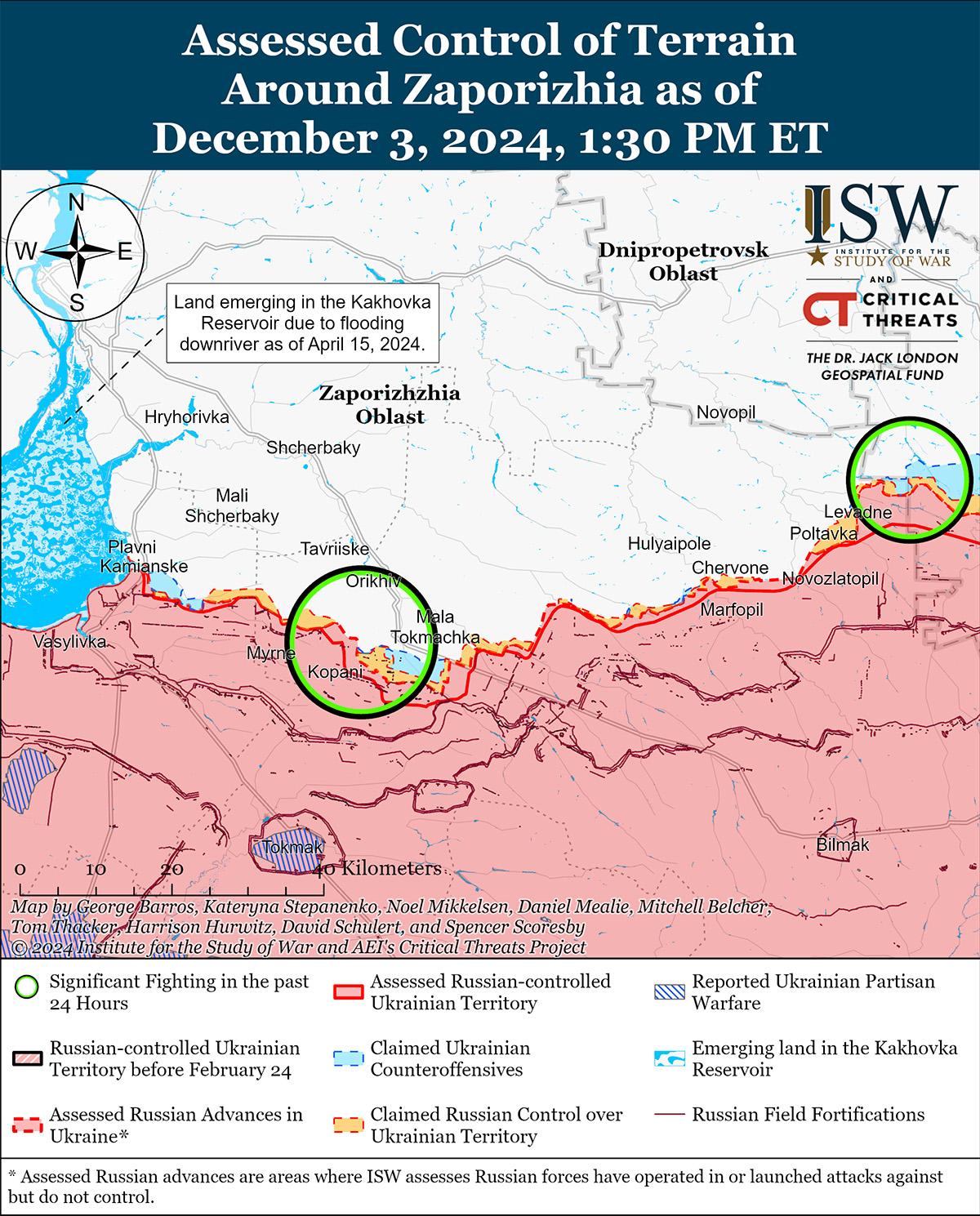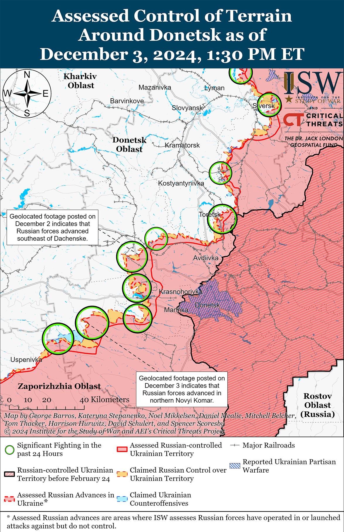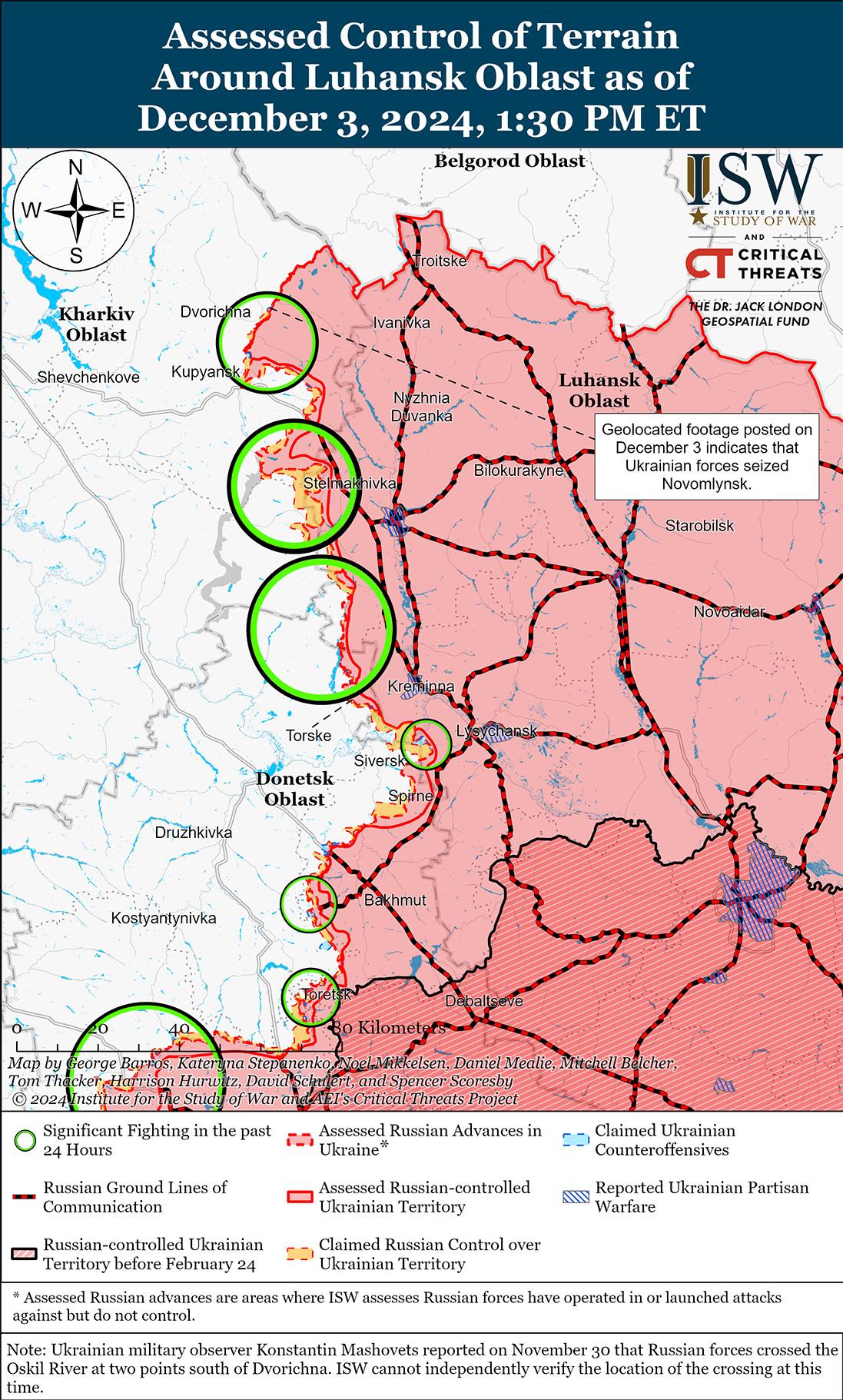 3 декабря российские войска продвинулись к северу от Великой Новоселки на фоне продолжающихся наступательных действий в приграничье Донецкой и Запорожской областей. Геолоцированные кадры, опубликованные 3 декабря, указывают на то, что российские войска недавно продвинулись на севере Нового Комара (к северу от Великой Новоселки)[51] Российское продвижение в Новом Комаре поддерживает несколько вариантов действий (ВД), которые, по недавним прогнозам ISW, может предпринять российское военное командование, включая окружение или обход Великой Новоселки для перекрытия трассы Т0518 Великая Новоселка — Богатырь и продвижения в Днепропетровскую область и наступлением на Андреевку (западнее Курахово) с юга. Минобороны РФ заявило, что российские войска захватили Новодаровку (к юго-западу от Великой Новоселки) 3 декабря, но ISW пока не зафиксировал подтверждения этого заявления. Спикер Таврийской группировки войск полковник Владислав Волошин отметил, что на Времовском направлении (приграничье Донецкой и Запорожской областей) враг ежедневно проводит от 20 до 25 атак с использованием малой штурмовой техники и пытается выйти на границу Донецкой и Днепропетровской областей. Волошин добавил, что российские войска продолжают медленно, но постепенно продвигаться в районе Великой Новоселки и что украинские войска контратакуют в этом районе. Российские войска вели наступательные действия в районе Великой Новоселки; к северу от Великой Новоселки в районе Нового Комара; к северо-востоку от Великой Новоселки возле Раздольное; к западу от Великой Новоселки возле Новоселки; и к юго-западу от Великой Новоселки в районе Новодаровки и Новополя 2 и 3 декабря.