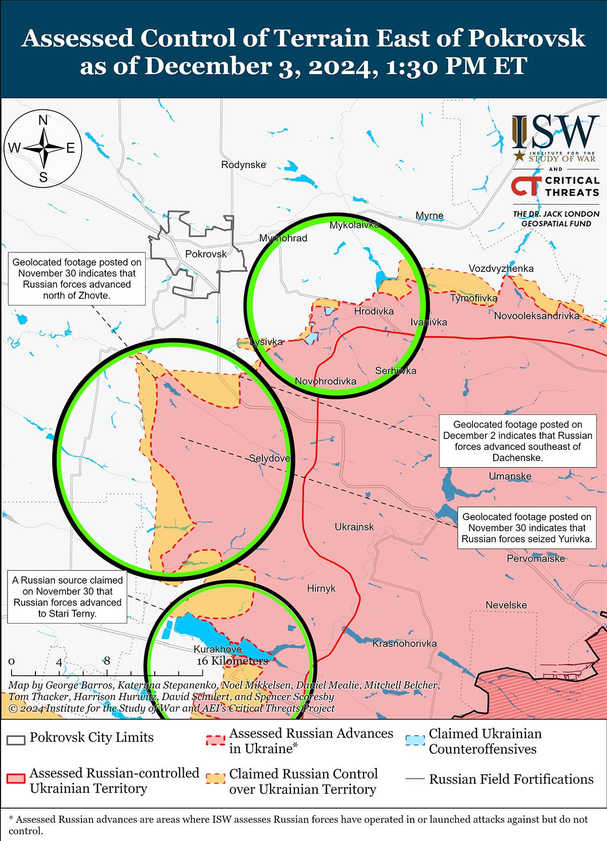 Российские войска недавно продвинулись к югу от Покровска на фоне продолжающихся наступательных операций 3 декабря. Геолоцированные кадры, опубликованные 2 декабря, указывают на то, что российские войска недавно продвинулись к юго-востоку от Даченского (к югу от Покровска), а российский военный блогер заявил, что российские войска продвинулись дальше к юго-востоку от Даченского. [40] Российские источники утверждали, что российские войска продвинулись к западу от Николаевки (к востоку от Покровска), к югу от Лысовки (к юго-востоку от Покровска), к северу от Петровки, к северу и юго-западу от Желтого (оба к югу от Покровска) и к северу от Новопустынки (к юго-западу от Покровска). [41] Однако ISW не обнаружил подтверждения этих заявлений. Враг продолжил наземные атаки к востоку от Покровска в районе Миролюбовки и Проминя; юго-восточнее Покровска в районе Лысовки и Красного Яра; южнее Покровска в районе Даченского, Пушкино, Желтого и Нового Труда; и юго-западнее Покровска в районе Новопустынки 2 и 3 декабря. [42] Представитель украинской бригады, действующей на Покровском направлении, 3 декабря отметил, что российские войска регулярно выделяли 50 военнослужащих для штурма украинских позиций, но с тех пор стали развертывать значительно меньше войск, вероятно, из-за высоких потерь россиян на Покровском направлении. [43]