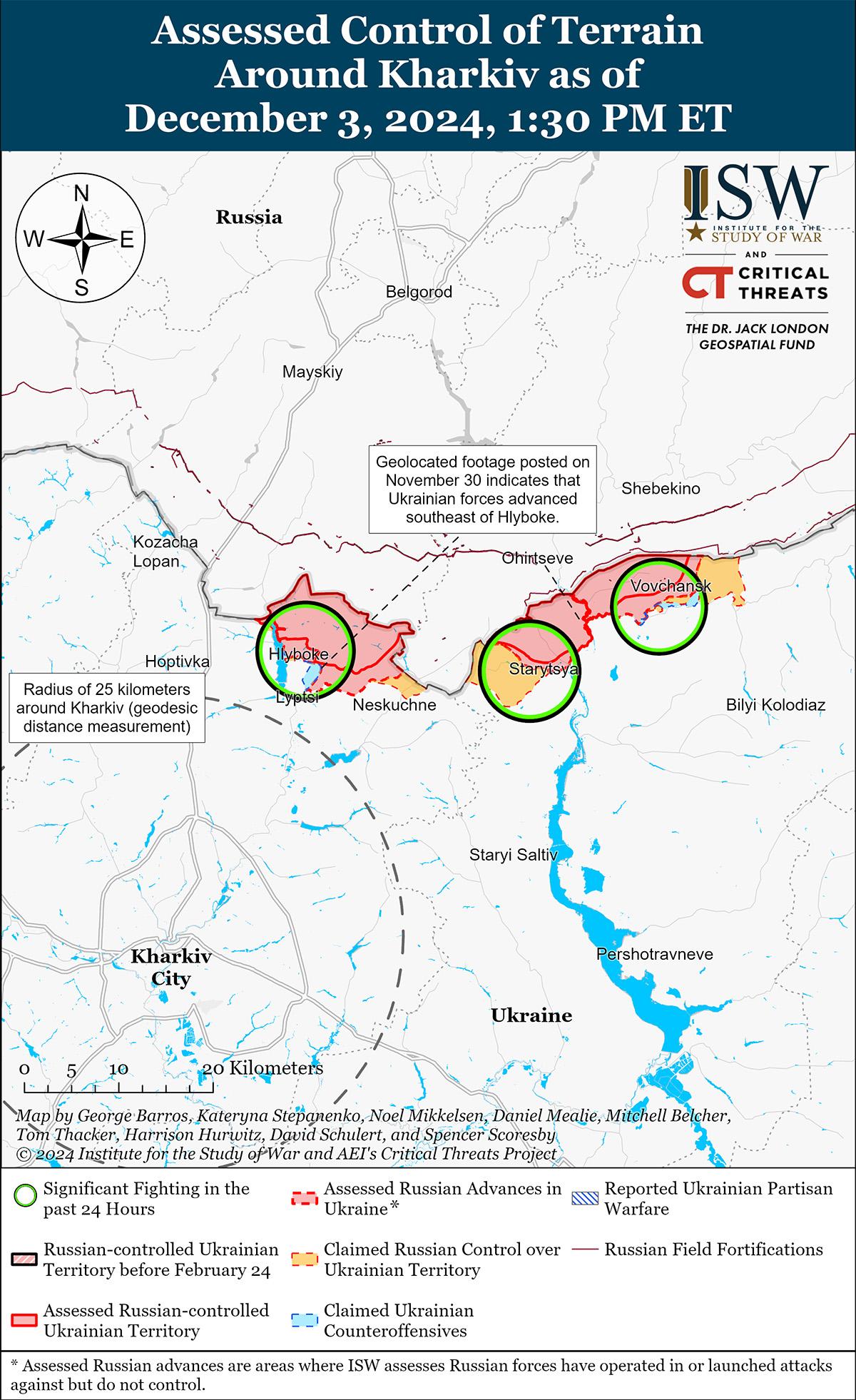 2 и 3 декабря российские войска вели наступательные действия вдоль международной границы к северу от Харькова в направлении Казачьей Лопани, к северу от Харькова в районе Глубокого и к северо-востоку от Харькова в районе Старицы и Волчанска, но не добились подтвержденных успехов. [21] 2 декабря российский военный блогер заявил, что украинские войска провели контратаки к юго-западу от Глубокого. [22]