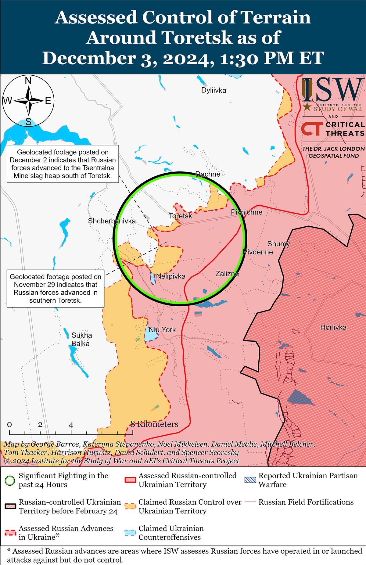 В последнее время российские войска продвинулись к югу от Торецка на фоне продолжающихся наступательных действий на этом направлении 3 декабря. Геолоцированные кадры, опубликованные 2 декабря, указывают на то, что российские войска недавно продвинулись в районе терриконов шахты «Центральная» к юго-западу от Торецка. [35] Российские войска атаковали под самим Торецком; южнее Торецка в районе Нелиповки; и к западу от Торецка в районе Щербиновки 2 и 3 декабря. [36] 3 декабря российский военный блогер заявил, что украинские войска контратакуют в районе шахты «Центральная». [37] Российский военный блогер утверждал, что российские войска пытаются продвинуться между двумя отвалами на шахте «Центральная» и что схема линии фронта в близлежащем микрорайоне Забалка (южный Торецк) неясна даже российским военным источникам на местах, вероятно, из-за нестабильной ситуации на линии фронта. [38] Сообщается, что в Торецке действуют подразделения российского отдельного разведывательного батальона «Спарта» (51-я ОА). [39]