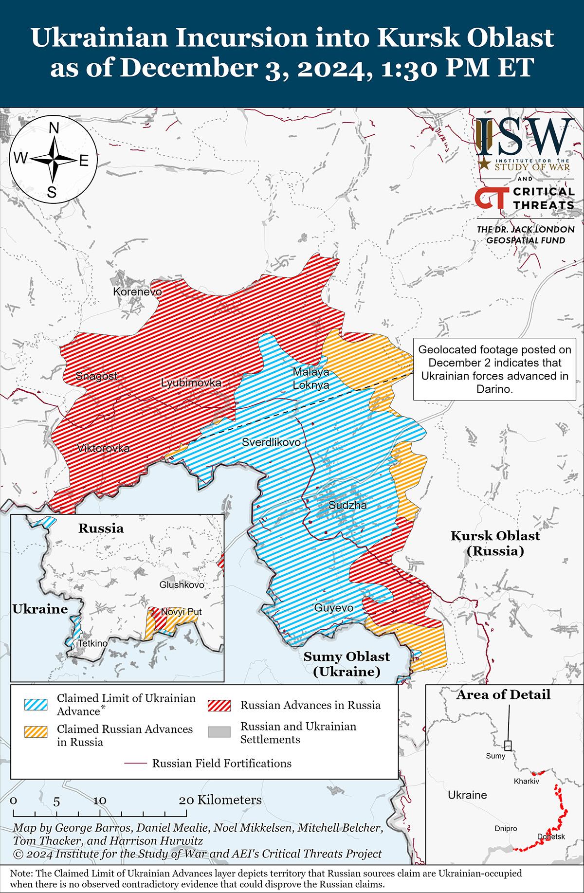 Недавно украинские войска продвинулись на главном украинском выступе в Курской области на фоне продолжающихся боев в этом районе 3 декабря. Геолоцированные кадры, опубликованные 2 декабря, свидетельствуют о том, что украинские войска в последнее время продвинулись в южном Дарьино (к юго-востоку от Коренево). [16] Российские военные блогеры утверждали, что российские войска продвинулись в Новоивановке (к юго-востоку от Коренево) и в районе Малой Локни (к северу от Суджи). [17] Однако ISW не обнаружил подтверждения этих заявлений. Российские источники утверждали, что украинские войска безуспешно контратаковали в районах населенных пунктов Дарьино, Николаево-Дарьино (к юго-востоку от Коренево), Новоивановки и Погребки (к северо-западу от Суджи). [18] Командир украинского подразделения, действующего в Курской области, сообщил 3 декабря, что российские войска испытывают трудности с снабжением передовых подразделений, переброской бронетехники на передовую и накоплением сил для широкомасштабных атак из-за плохого материально-технического обеспечения. [19] Сообщается, что в Курской области действуют подразделения российской 106-й воздушно-десантной дивизии (ВДВ), а на Суджанском направлении – подразделения чеченского спецназа «Ахмат». [20]