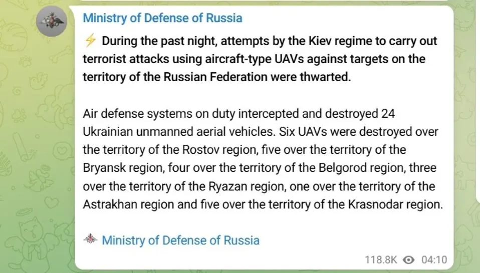 В то время как наиболее впечатляющими доказательствами ударов украинских беспилотников являются изображения горящих нефтеперерабатывающих заводов и авиабаз, услужливо размещенные в российских социальных сетях, самые подробные сообщения поступают из официального аккаунта Министерства обороны России в Telegram. В нем подробно описываются все заявления о сбитии украинского беспилотника, когда и где это произошло.