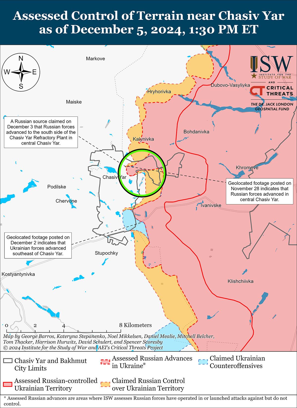 5 декабря враг продолжил наступательные действия на направлении Часов Яр, подтвержденных успехов не имел. [34] 4 и 5 декабря российские военные блогеры утверждали, что подразделения 98-й воздушно-десантной дивизии (ВДВ) РФ продвинулись на северо-восточные окраины Часова Яра, на Огнеупорный завод в центре Часова Яра, далее в Новый микрорайон (восток Часова Яра), на полях к югу от Нового Микрорайона, к западу от Калиновки (северо-восток от Часова Яра) и к северо-востоку и юго-востоку от Часова Яра. [35] Однако ISW не обнаружил подтверждения этих заявлений. Унтер-офицер украинской роты, действующей на направлении Часов Яр, 5 декабря сообщил, что российские войска направляют небольшие группы пехоты для прощупывания украинских оборонительных рубежей на предмет слабых мест, чтобы проникнуть в украинские оборонительные рубежи и нарушить украинские логистические сети в Часовом Яру. [36]