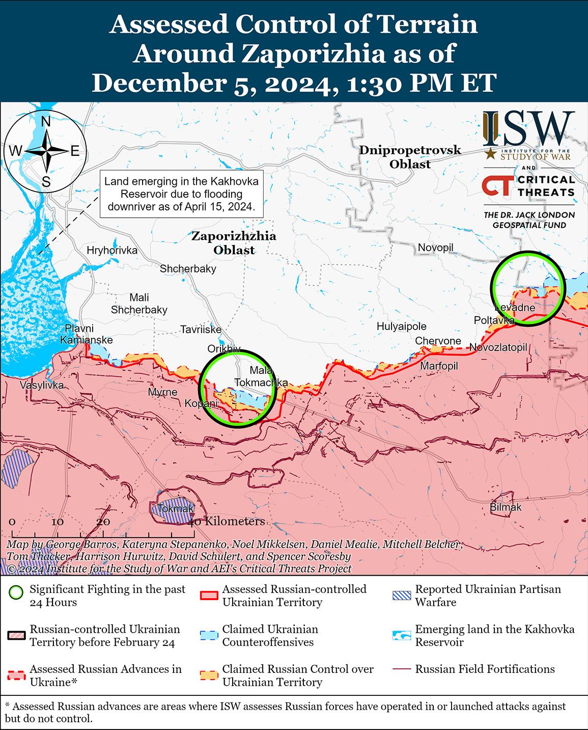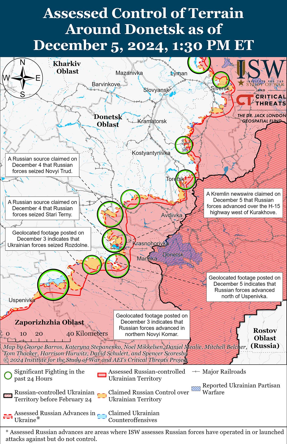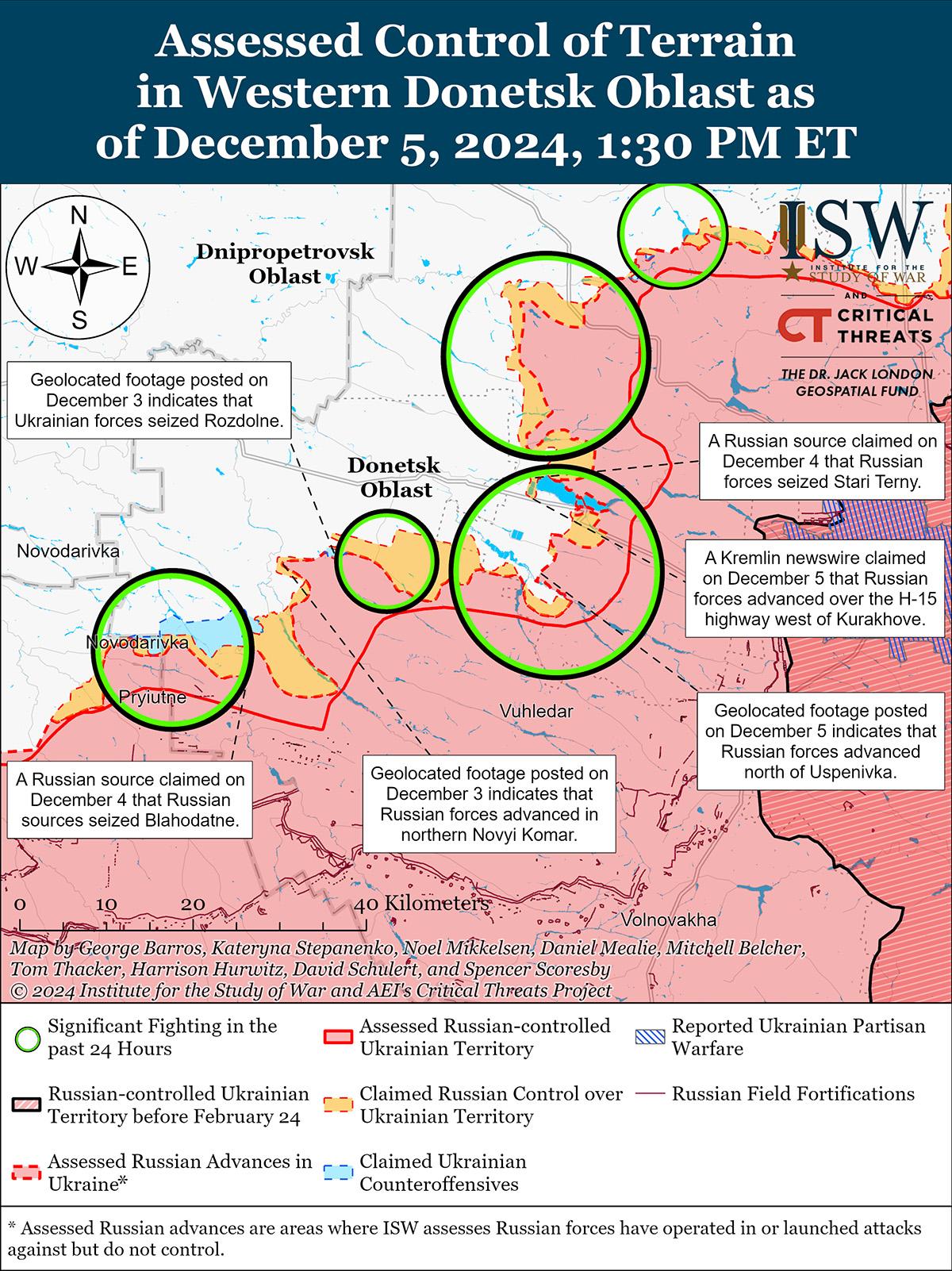 В последнее время российские войска незначительно продвинулись на Кураховском направлении на фоне продолжающихся наступательных действий в этом районе 5 декабря. Геолоцированные кадры, опубликованные 5 декабря, указывают на то, что российские войска в последнее время незначительно продвинулись в южной части Сонцовки (к северо-западу от Курахово). [46] Российские военные блогеры утверждали, что российские войска продвинулись в полях к востоку от Сонцовки и в районе Старых Терн (к северо-западу от Курахово) и перехватили трассу H-15 Курахово – Константинополь (к западу от Курахово и к югу от Старых Терн). [47] Российские войска продолжали атаки в самом Курахово; северо-западнее Курахово в районе Сонцовки, Зари и Новодмитровки; севернее Курахово в районе Берестки; к западу от Курахово у Дачного; и южнее Курахово в районе Дальнего 4 и 5 декабря. [48]