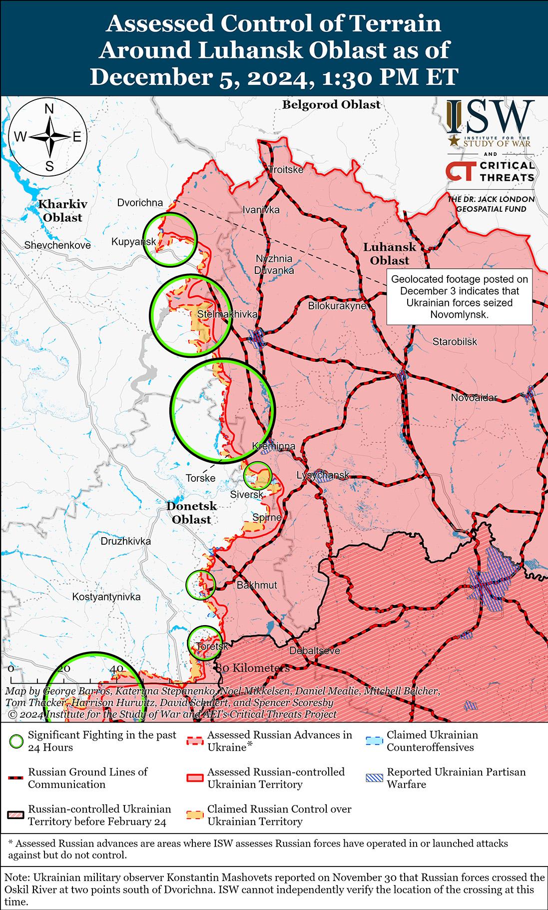 Российские войска продолжали наступательные операции вдоль линии Купянск-Сватово-Кременная 4 и 5 декабря, но не добились никаких подтвержденных успехов. Российский военблогер утверждал, что российские войска продвинулись до одного километра к востоку от Кругляковки (юго-восток от Купянска), к западу от Сватово около Копанок, до четырех километров около Зеленого Гая и на северо-восточных подступах к Лозовой.[25] Однако ISW не обнаружил подтверждения этих заявлений. Российские военблогеры признали недавние украинские сообщения о том, что украинские войска недавно захватили Новомлынск (севернее Купянска) и сделали аналогичные заявления.[26] Один военблогер утверждал, что украинские войска сначала захватили тактическую высоту на западной окраине Новомлынска, прежде чем атаковать поселок с запада и юга.[27] Российские войска продолжали наступление к северо-востоку от Купянска около Синьковки; к северу от Купянска около Двуречной; к востоку от Купянска в районе Петропавловки и Кучеровки; к юго-востоку от Купянска в районе Новой Кругляковки; к западу от Сватово в районе Лозовой, Первомайского и Зеленого Гая; к юго-западу от Сватово в районе Грековки, Новоегоровки и Дружелюбовки; к северо-западу от Кременной в районе Макеевки и Терн; к юго-западу от Кременной в районе Серебрянского леса; и к западу от Кременной в районе Ямполовки, Заречного и Торского 4 и 5 декабря.[28] Представитель украинской бригады сообщил 5 декабря, что российское военное командование использует свое превосходство в живой силе в атаках на Купянском направлении, чтобы компенсировать плохую подготовку российского персонала.[29] Сообщается, что операторы беспилотников 16-й бригады специального назначения ВС РФ (Главное управление Генерального штаба ВС РФ [ГРУ]) продолжают действовать в районе Заречного.[30]