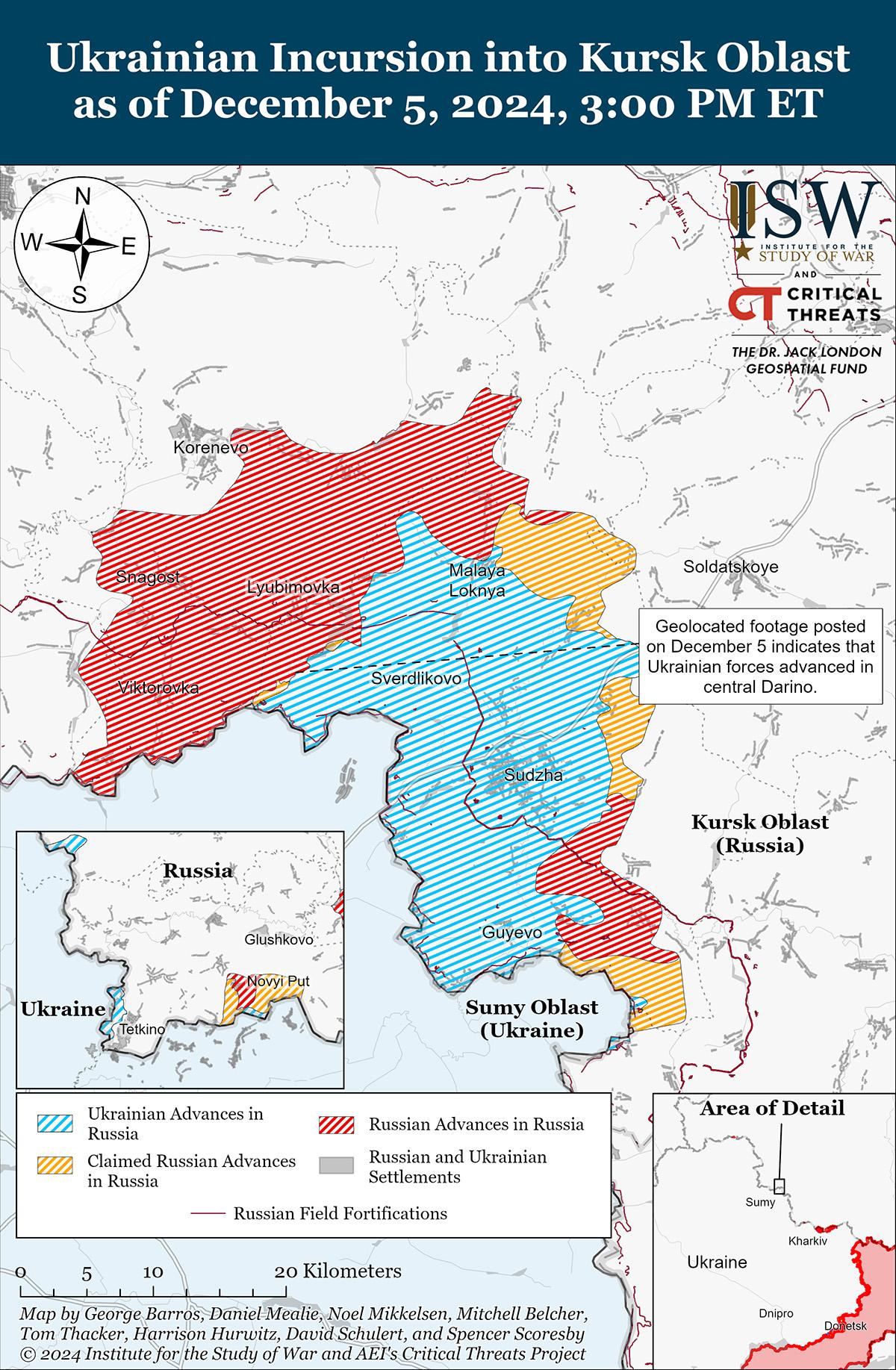 В последнее время украинские войска продвинулись в районе Курской области. Геолоцированные кадры, опубликованные 4 декабря, свидетельствуют о том, что украинские войска недавно продвинулись в центр Дарьино (к юго-востоку от Коренево). [19] 4 декабря российский военный блогер заявил, что российские войска продвинулись в районе Малой Локни (к северу от Суджи) и зачищают этот район на фоне продолжающихся наступательных действий на севере Суджанского района. [20] Тем не менее, ISW пока не обнаружил подтверждения недавних российских достижений к северу от Суджи. Российские источники заявили 5 декабря, что украинские войска контратакуют к юго-востоку от Коренево в районе Новоивановки и Николаево-Дарьино. [21] По сообщениям, подразделения российского 56-го полка ВДВ (7-я дивизия ВДВ) и отряды беспилотников 106-й дивизии ВДВ продолжают действовать на всей территории Курской области; а также подразделения 51-го полка ВДВ (106-я дивизия ВДВ) и 104-го полка ВДВ (76-я дивизия ВДВ) удерживают позиции в районе Николаево-Дарьино и Дарьино на фоне продолжающихся боев. [22]