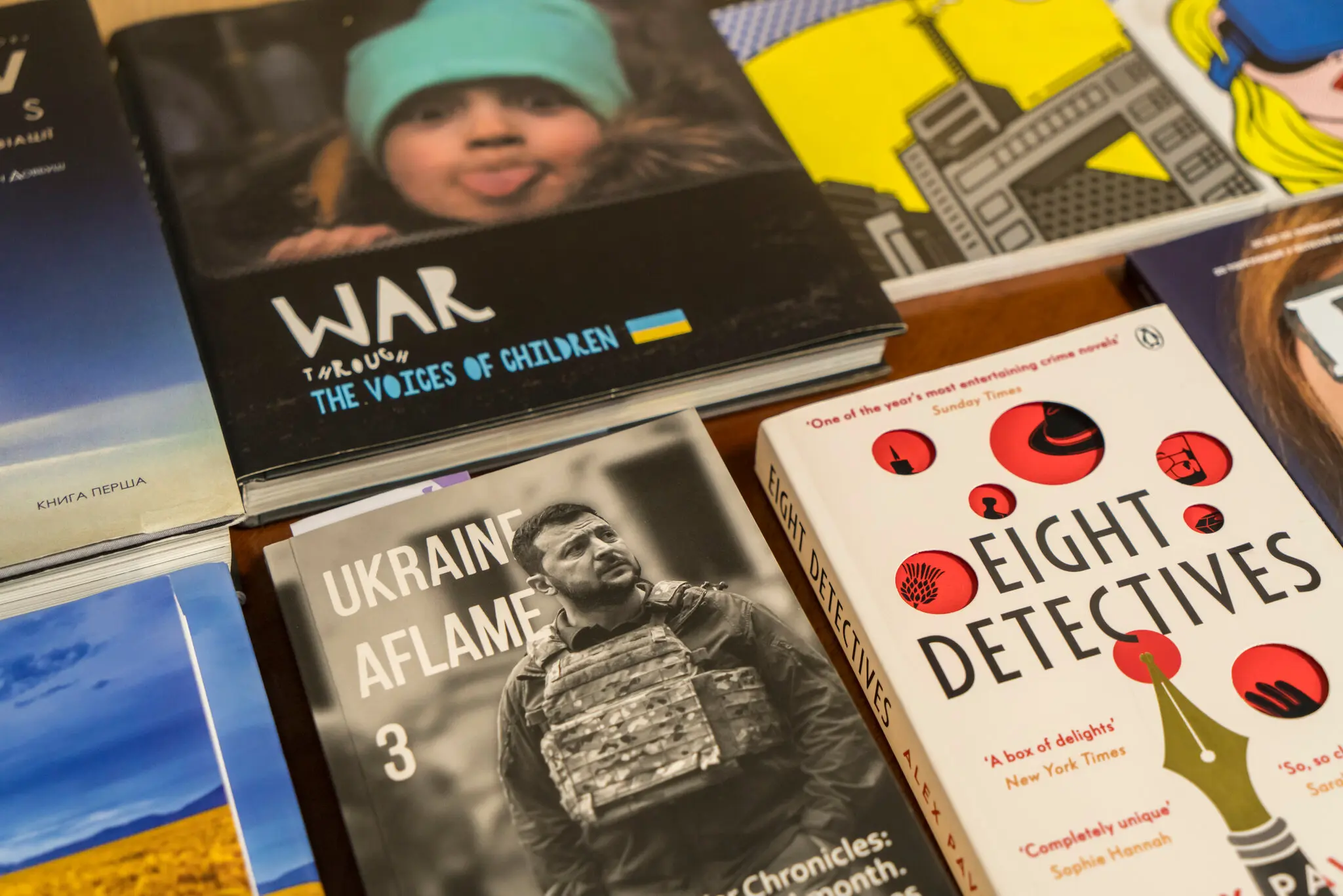 На приставном столике г-на Баффета ждали книги, которые, по-видимому, были выбраны для того, чтобы вызвать сочувствие к бедственному положению Украины: сборник речей г-на Зеленского военного времени и рассказ о детском опыте во время войны.