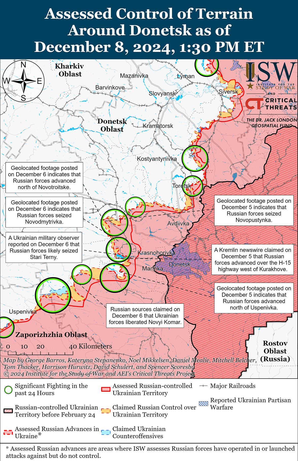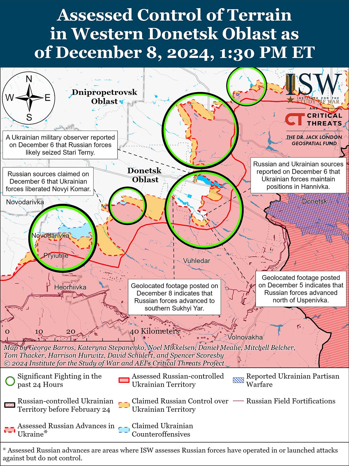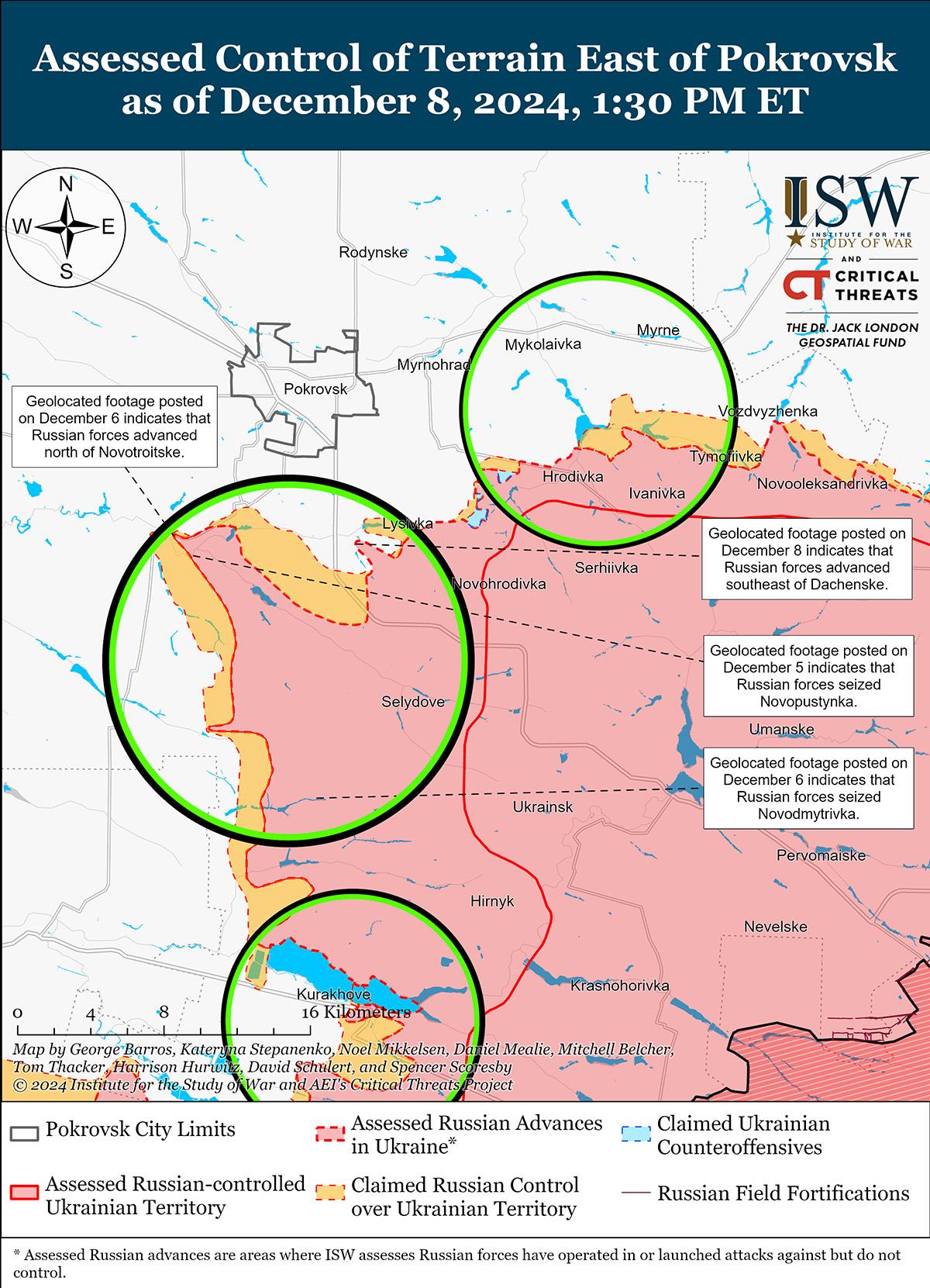 В последнее время российские войска продвинулись на Покровском направлении на фоне продолжающихся российских наступательных действий в этом районе 8 декабря. Геолоцированные кадры, опубликованные 7 и 8 декабря, свидетельствуют о том, что российские войска в последнее время продвинулись к востоку от Украинки (к юго-западу от Покровска) и к юго-востоку от Даченского (к юго-востоку от Покровска). [52] Российские военные блогеры утверждали, что российские войска захватили Новотроицкое (к юго-западу от Покровска) и продвинулись в районах населенных пунктов Шевченко и Зеленое (оба к югу от Покровска) и к юго-востоку от Новотроицкого. [53] ISW не обнаружила подтверждения этих заявлений. Враг продолжил атаки к востоку от Покровска в районах населенных пунктов Миролюбовка, Мирноград, Гродовка и Проминь; юго-восточнее Покровска в районе Лысовки и Сухого Яра; южнее Покровска в районе Желтого, Даченского, Пушкино, Шевченко, Нового Труда и Зеленого; и юго-западнее Покровска в районе Новотроицкого 7 и 8 декабря. [54]