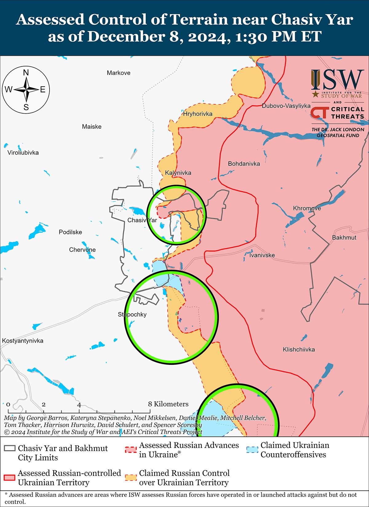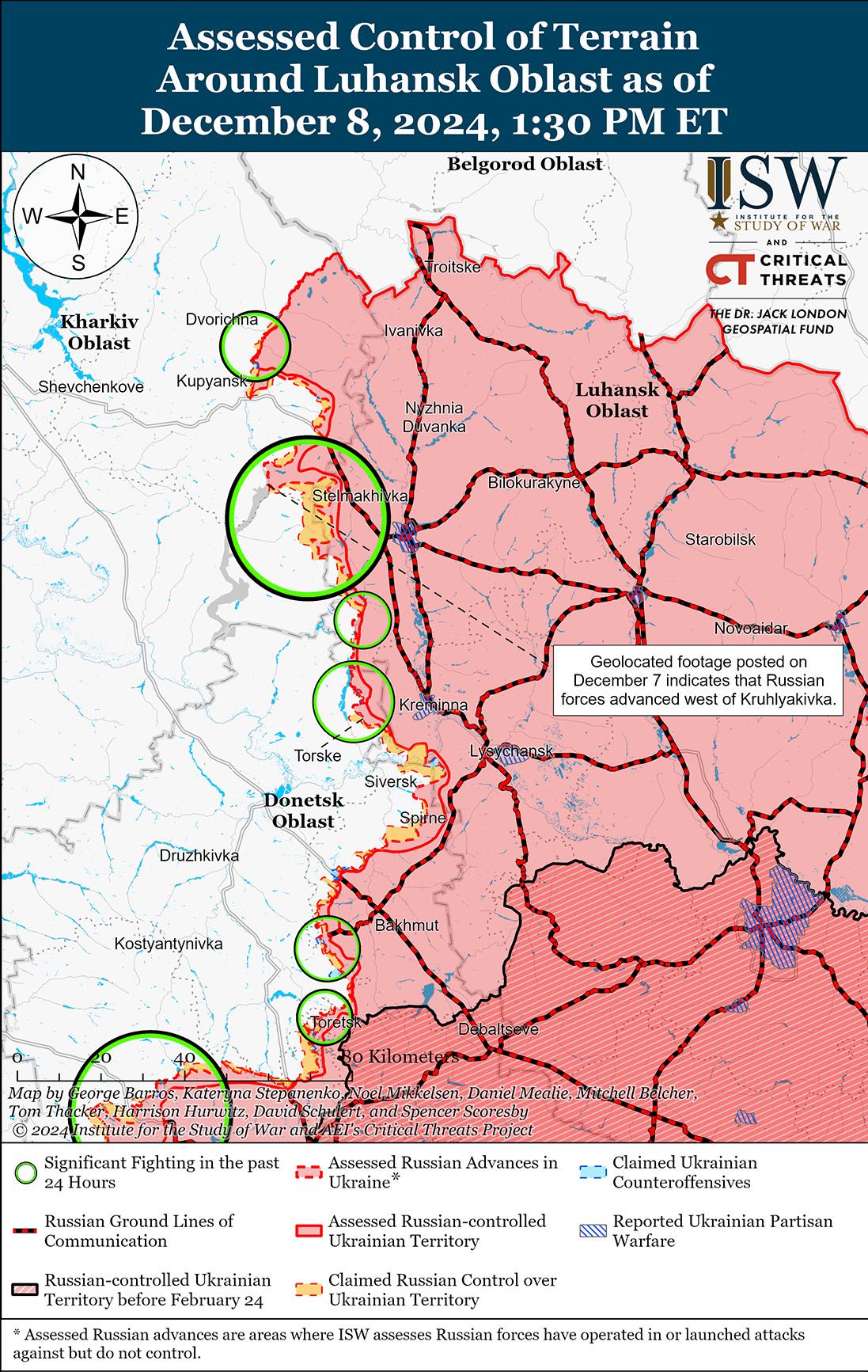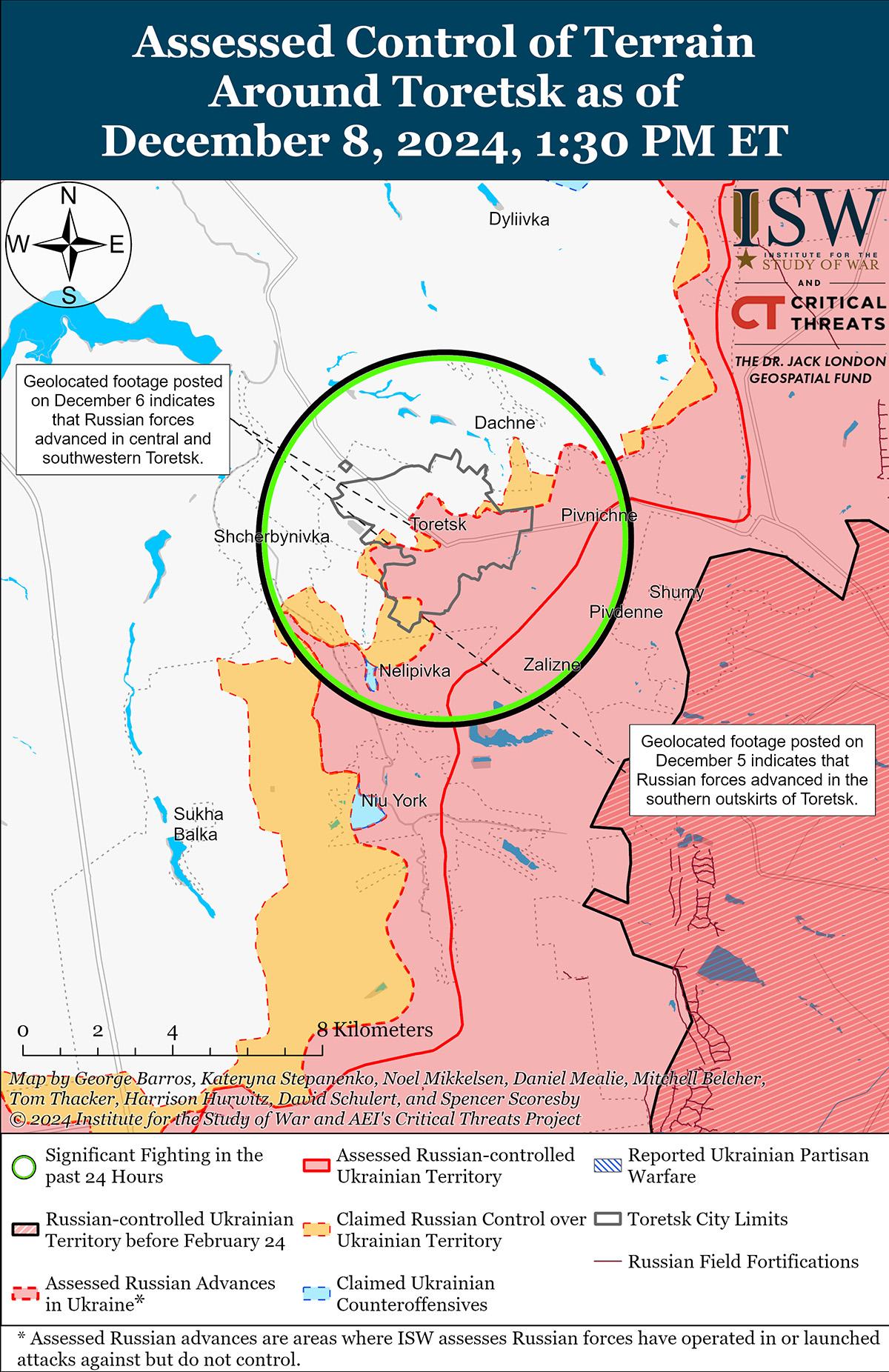 В последнее время российские войска продвинулись на Покровском направлении на фоне продолжающихся российских наступательных действий в этом районе 8 декабря. Геолоцированные кадры, опубликованные 7 и 8 декабря, свидетельствуют о том, что российские войска в последнее время продвинулись к востоку от Украинки (к юго-западу от Покровска) и к юго-востоку от Даченского (к юго-востоку от Покровска). [52] Российские военные блогеры утверждали, что российские войска захватили Новотроицкое (к юго-западу от Покровска) и продвинулись в районах населенных пунктов Шевченко и Зеленое (оба к югу от Покровска) и к юго-востоку от Новотроицкого. [53] ISW не обнаружила подтверждения этих заявлений. Враг продолжил атаки к востоку от Покровска в районах населенных пунктов Миролюбовка, Мирноград, Гродовка и Проминь; юго-восточнее Покровска в районе Лысовки и Сухого Яра; южнее Покровска в районе Желтого, Даченского, Пушкино, Шевченко, Нового Труда и Зеленого; и юго-западнее Покровска в районе Новотроицкого 7 и 8 декабря. [54]
