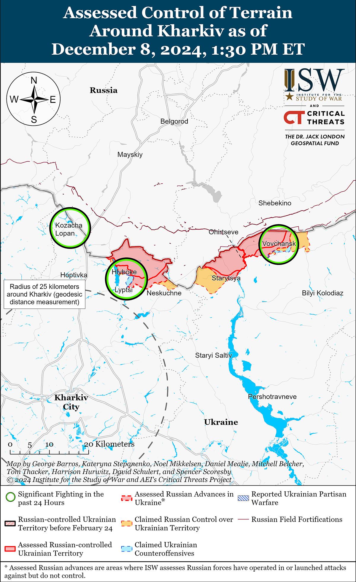 В последнее время российские войска продвинулись на главном украинском выступе в Курской области на фоне продолжающихся боев в этом районе 8 декабря. Геолоцированные кадры, опубликованные 8 декабря, указывают на то, что российские войска недавно продвинулись на южных окраинах Новоивановки (к юго-востоку от Коренево). [32] Российские военные блогеры утверждали, что российские войска отбили Плехово (к юго-востоку от Суджи), продвинулись в направлении Куриловки (к югу от Суджи) и Гуево (к югу от Суджи), а также продвинулись в районе Нижнего Клина (к юго-востоку от Коренево). [33] Российский источник утверждал, что линия фронта проходит вдоль реки Псел (к западу от Плехово). [34] Однако ISW не обнаружил подтверждения этих заявлений. 7 и 8 декабря бои продолжались юго-восточнее Коренево в районе Новоивановки, к юго-востоку от Суджи в районе Плехово и к югу от Суджи в районе Гуево. [35] Российский военный блогер заявил, что украинские войска атакуют с применением бронетехники, чтобы закрепиться на южных окраинах Дарьино (к юго-востоку от Коренево). [36] Военный блогер утверждал, что украинские войска действуют в Погребках (к северо-западу от Суджи) после неудачных российских атак на Новую Сорочину и Старую Сорочину (оба к югу от Погребок), которые вынудили российские войска отойти на окраины Погребок. 8 декабря спикер украинской бригады, действующей в Курской области, сообщил, что после периода относительного затишья российские войска активизировали наступательные действия в Курской области. [37] Пресс-секретарь заявил, что подразделения российской 155-й бригады морской пехоты (Тихоокеанский флот, Восточный военный округ [ВВО]), которые хорошо обучены и оснащены, являются основной силой, ведущей штурмовые действия, и что российские войска используют бронетранспортеры и боевые бронированные машины после того, как в течение последних двух-трех недель (примерно с 17 по 24 ноября) тяжелая техника не использовалась. Сообщается, что операторы беспилотников российской 83-й воздушно-десантной бригады (ВДВ) действуют в районе Дарьино. [38]