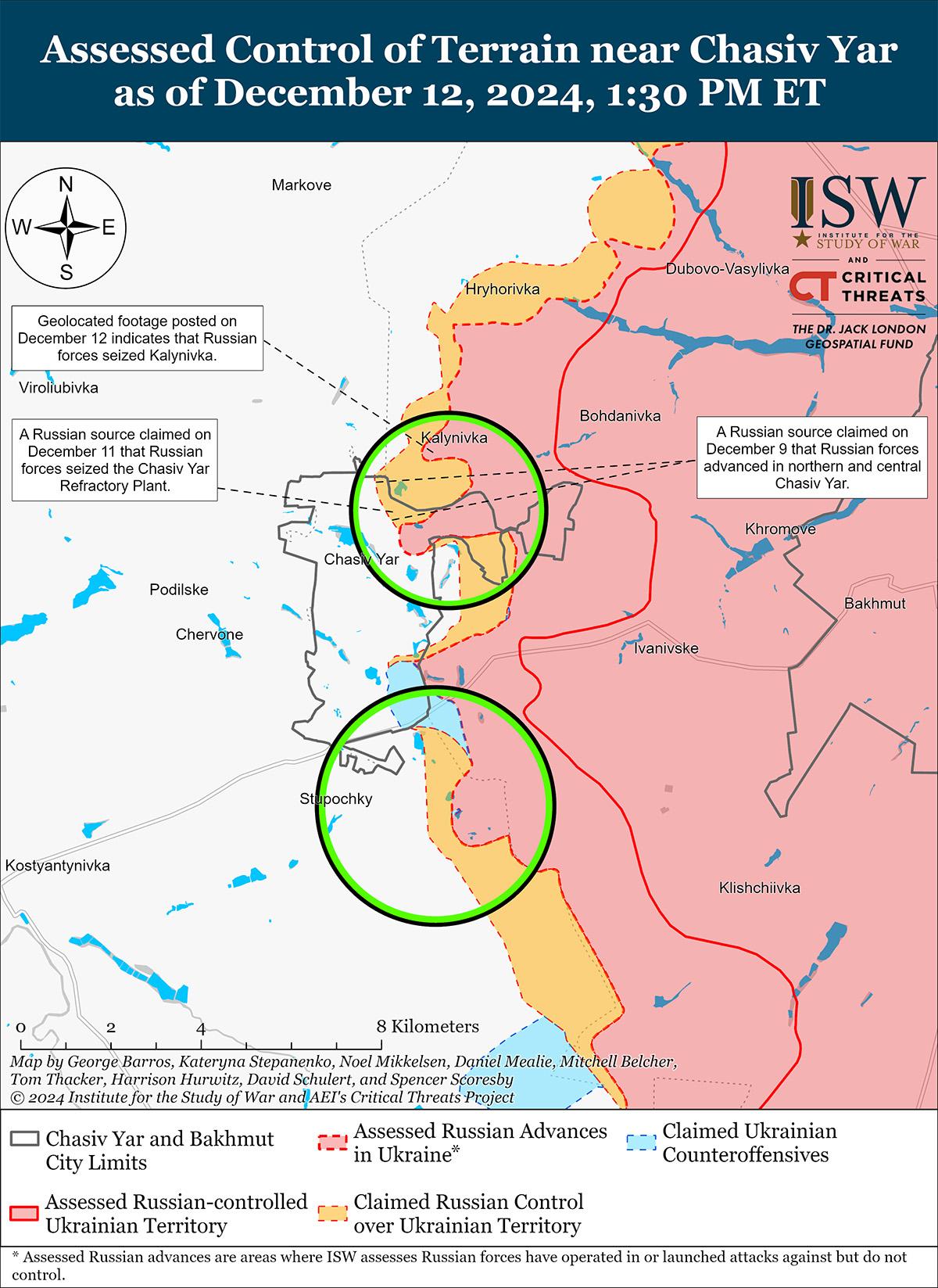 В последнее время российские войска незначительно продвинулись в направлении Часова Яра на фоне продолжающихся наступательных действий в этом районе 12 декабря. Геолоцированные кадры, опубликованные 12 декабря, свидетельствуют о том, что в последнее время российские войска продвинулись вдоль улицы Лесной на западной окраине Калиновки (к северу от Часова Яра) и захватили населенный пункт. [48] Один из российских военных блогеров утверждал, что российские войска проводят операции по зачистке огнеупорного завода в Часовом Яру, в то время как другие военные утверждали, что на заводе и рядом с ним продолжаются бои и что российские войска еще не установили полный контроль над этим районом. [49] ISW не обнаружил подтверждений того, что российские войска захватили весь огнеупорный завод. В украинском Генштабе сообщили, что 11 и 12 декабря российские войска вели наступательные действия в районе самого Часова Яра и к югу от Часова Яра в районе Белой Горы и Ступочек. [50]