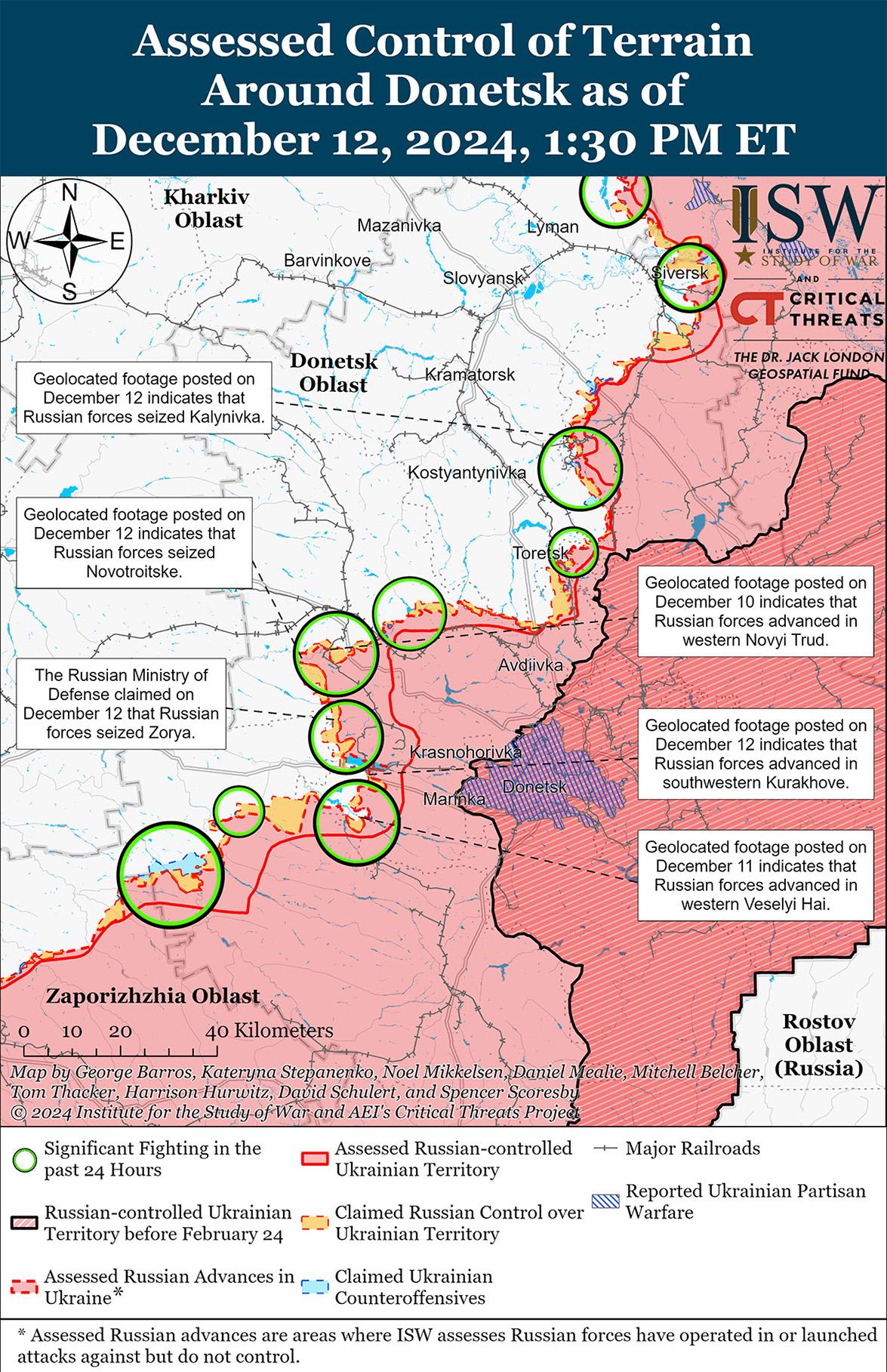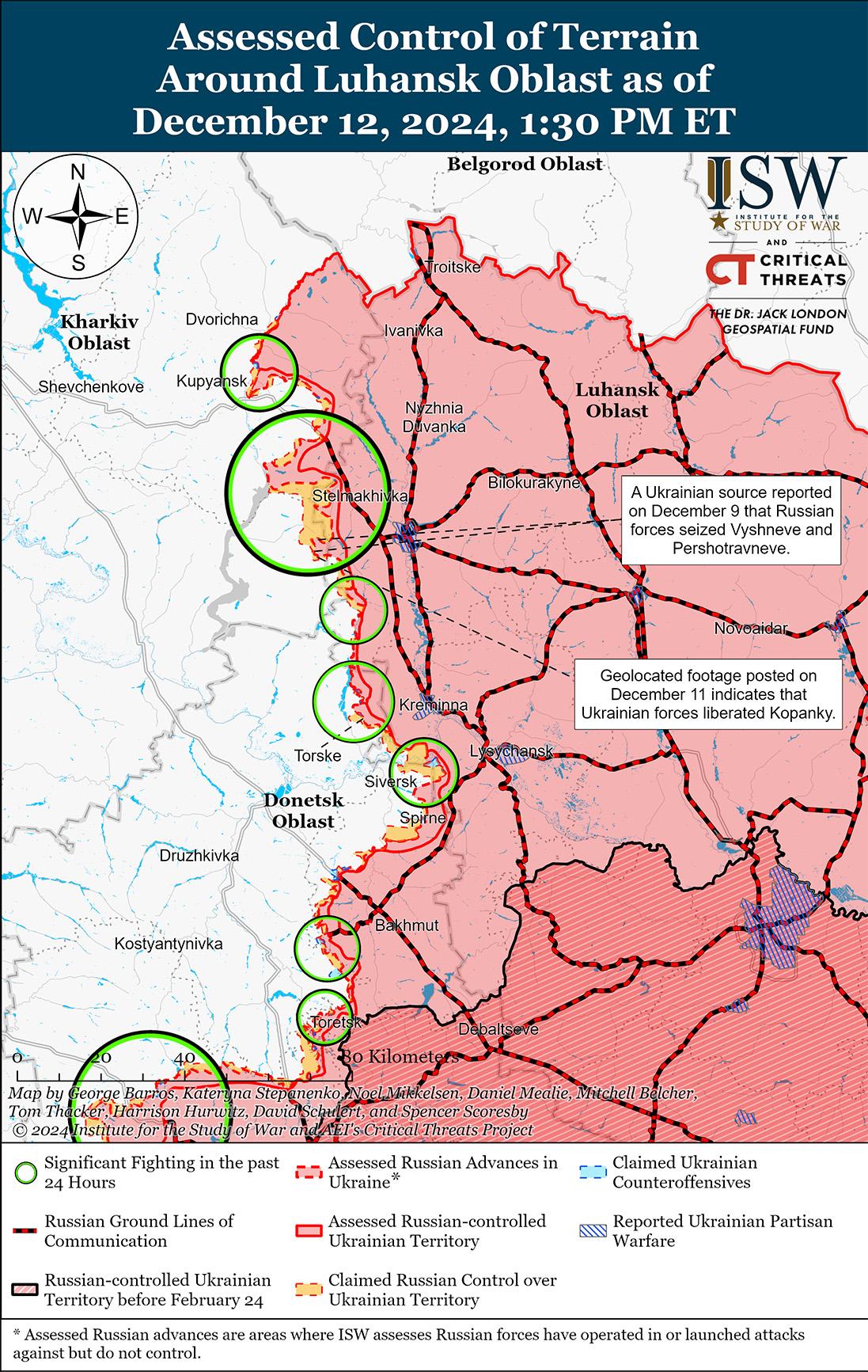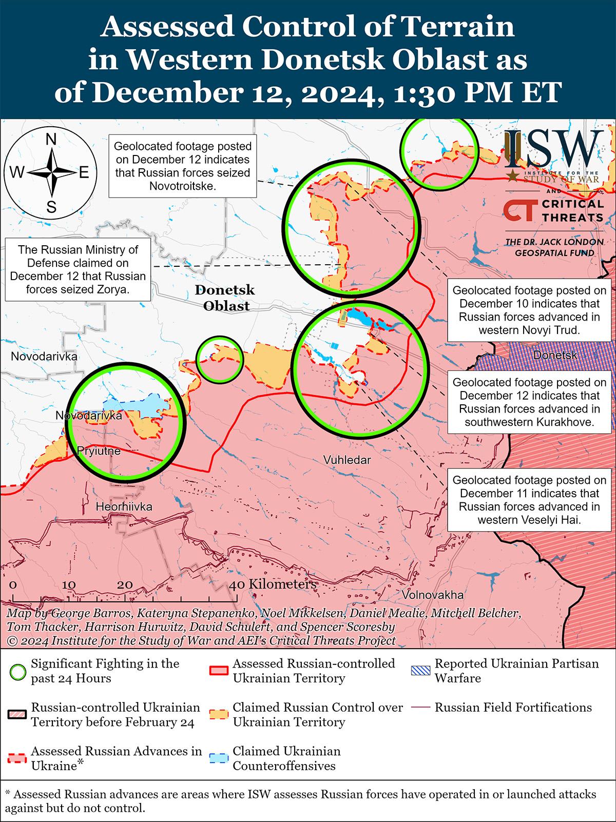 Российские войска недавно продвинулись к югу от Покровска на фоне продолжающихся наступательных действий в этом районе 12 декабря. На геолоцированных кадрах, опубликованных 11 декабря, указано, что российские войска недавно захватили Новотроицкое (к юго-западу от Покровска) и продвинулись к лесопосадке к западу от населенного пункта. [53] Дополнительные геолоцированные кадры, опубликованные 10 и 11 декабря, указывают на то, что российские войска в последнее время продвинулись на север вдоль Донецкой железной дороги к западу от Нового Труда (к северо-востоку от Новотроицкого и к югу от Покровска), вдоль улицы Сосновой на западе Шевченко (к юго-западу от Покровска) и на северо-запад вдоль лесопосадки к западу от Шевченко. [54] Российский военный блогер утверждал, что российские войска захватили Пушкино (к югу от Шевченко), но ISW пока не обнаружил подтверждений действий российских войск в населенном пункте. [55] Несколько российских военных блогеров утверждали, что небольшие российские диверсионно-разведывательные группы проникли на южные окраины Покровска и что российские войска продвинулись к северо-востоку от Новоеленовки (к юго-востоку от Покровска) и к юго-западу от Новотроицкого, но ISW не обнаружил подтверждения этих заявлений. [56] По словам одного из военных блогеров, продолжаются тяжелые бои в районе Шевченко и в районе Новотроицкого, где украинские войска контратаковали, и что российские войска закрепляют новые позиции в районе Нового Труда. [57] Представитель украинской бригады, действовавший на Покровском направлении, отметил, что в последнее время российские войска находятся на расстоянии от шести до десяти километров от окраин Покровска, и заявил, что российские войска пытаются прорваться к Покровску через левый и правый фланги, чтобы избежать прямого штурма города. [58] Другой представитель украинской бригады заявил, что российские войска под Покровском используют легкую небронированную технику для проведения ротации личного состава, а российские войска передвигаются группами по два-три человека (меньше стандартной огневой группы). [59] Генеральный штаб Украины сообщал, что российские войска проводили наземные атаки в районе Покровска; восточнее Покровска в районе Миролюбовки и Промина; юго-восточнее Покровска в районе Лысовки, Нового Труда и Даченского; южнее Покровска в районе Шевченко и Пушкино; и юго-западнее Покровска в районе Песчаного и Новотроицкого 11 и 12 декабря. [60]