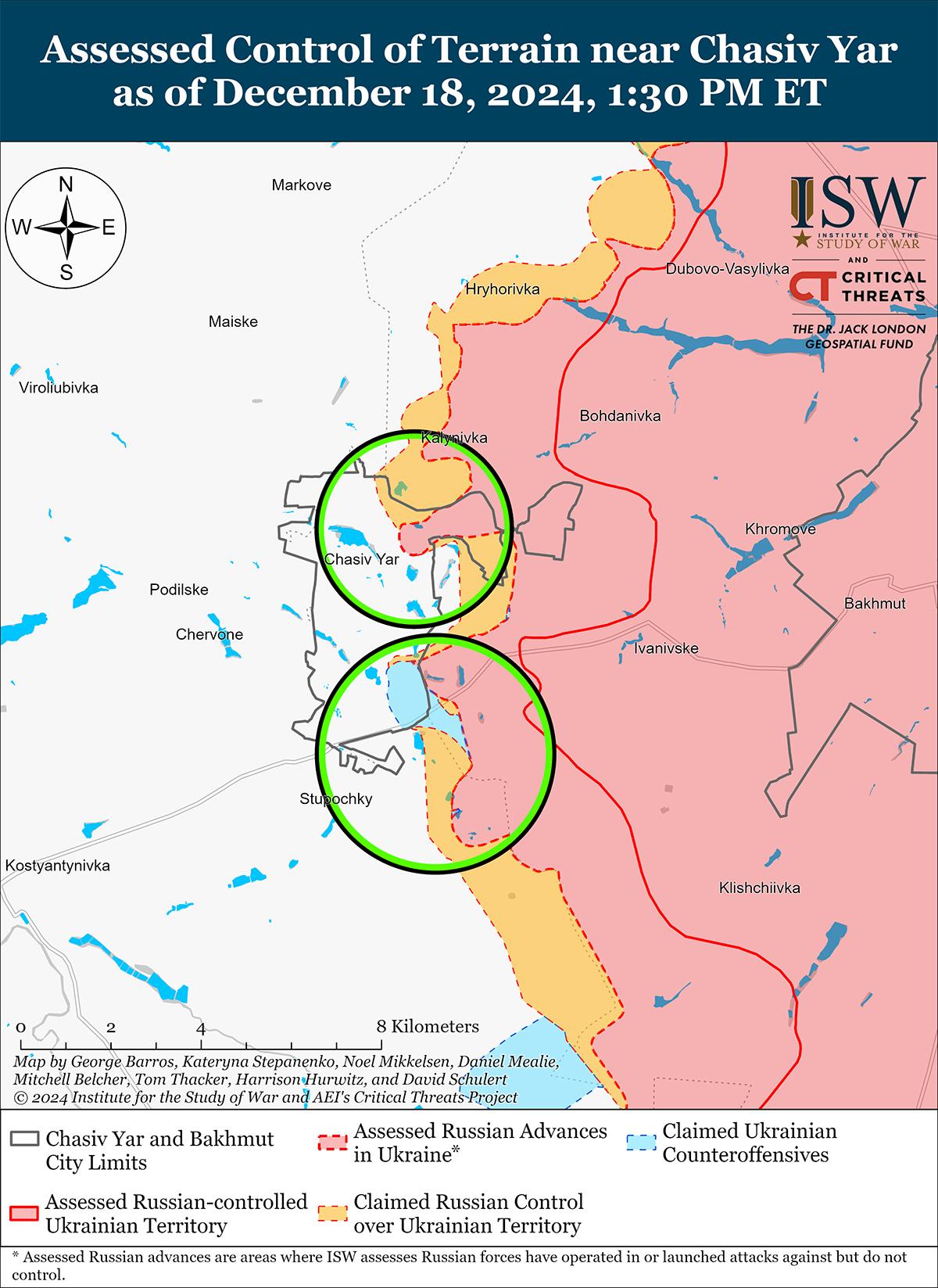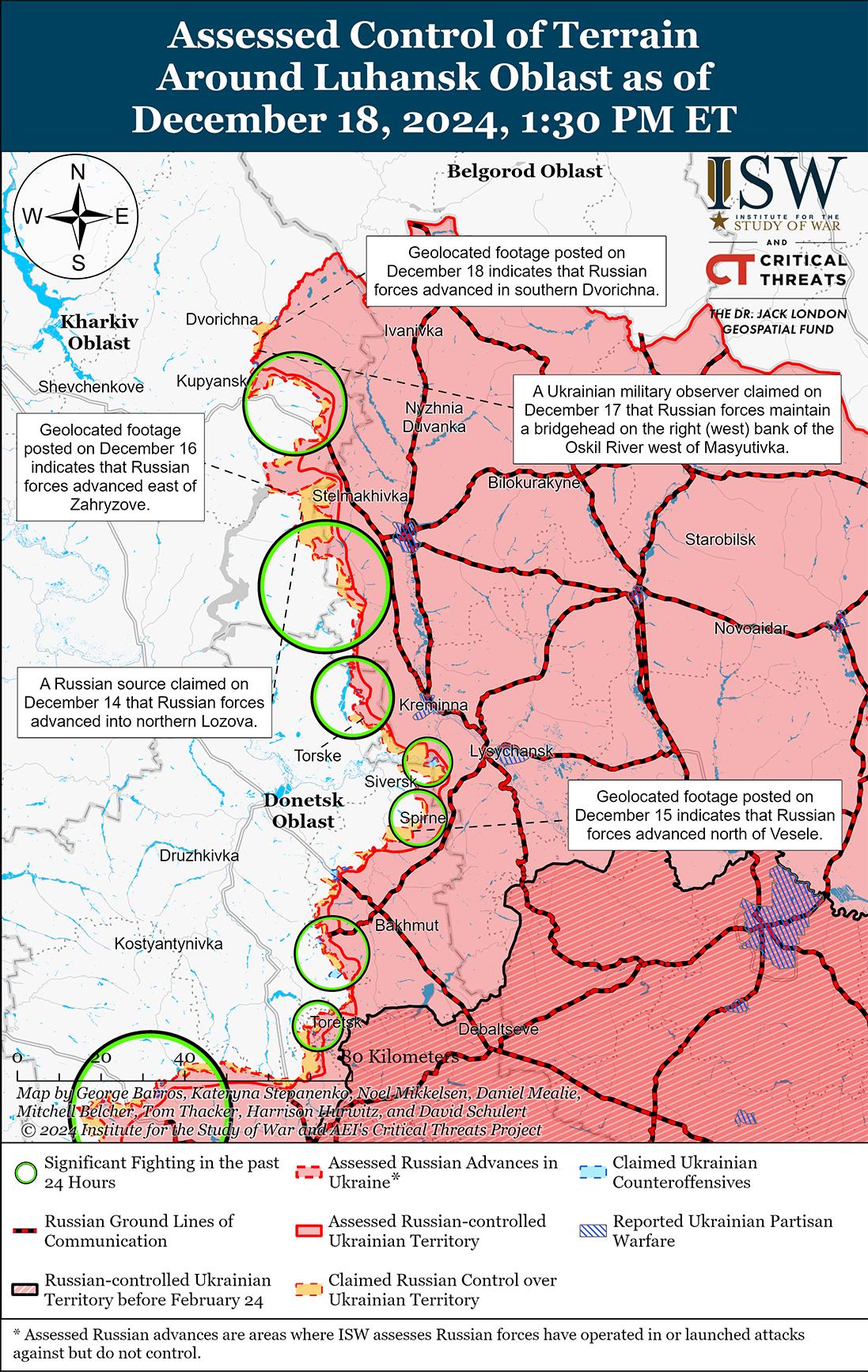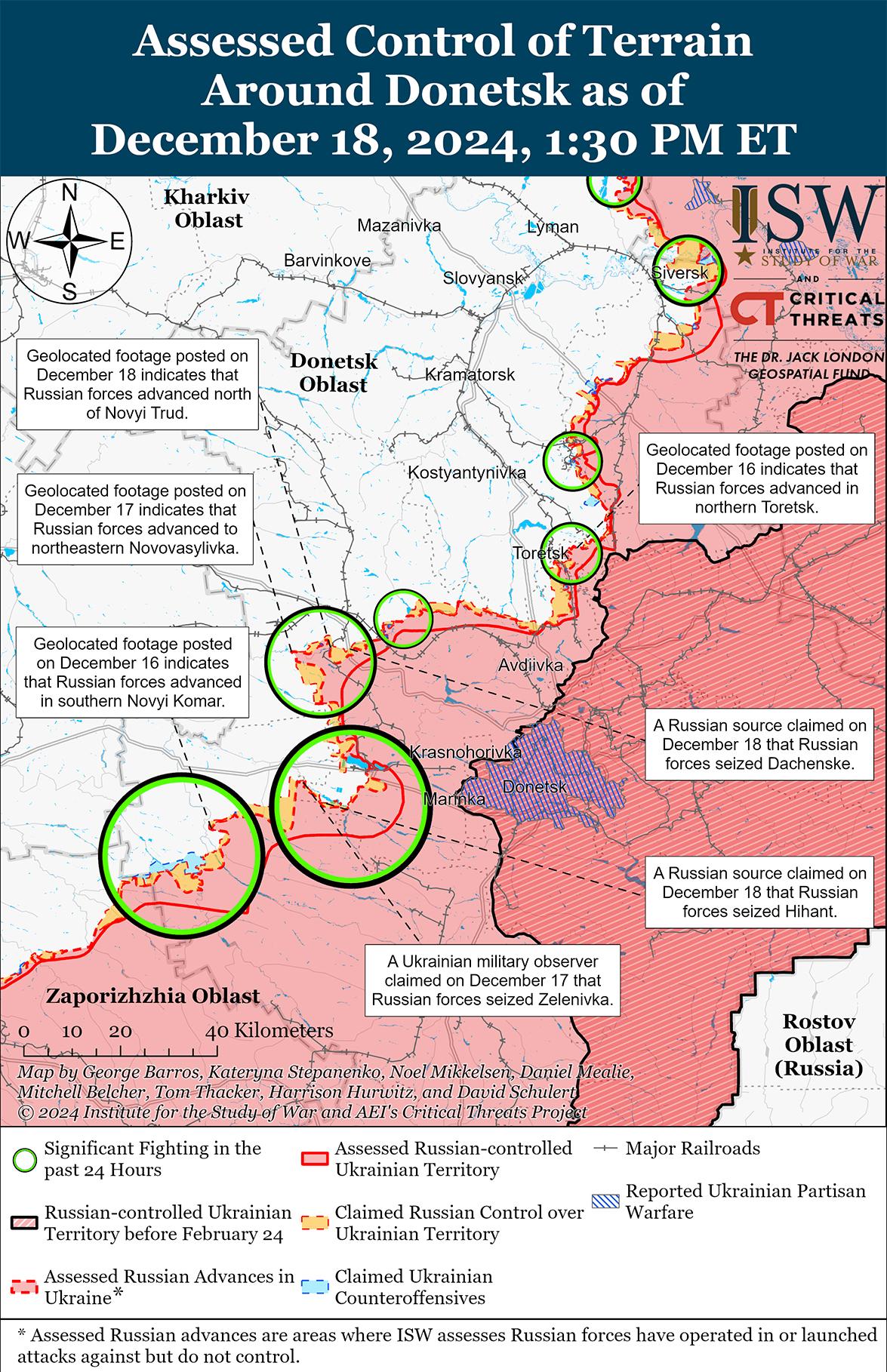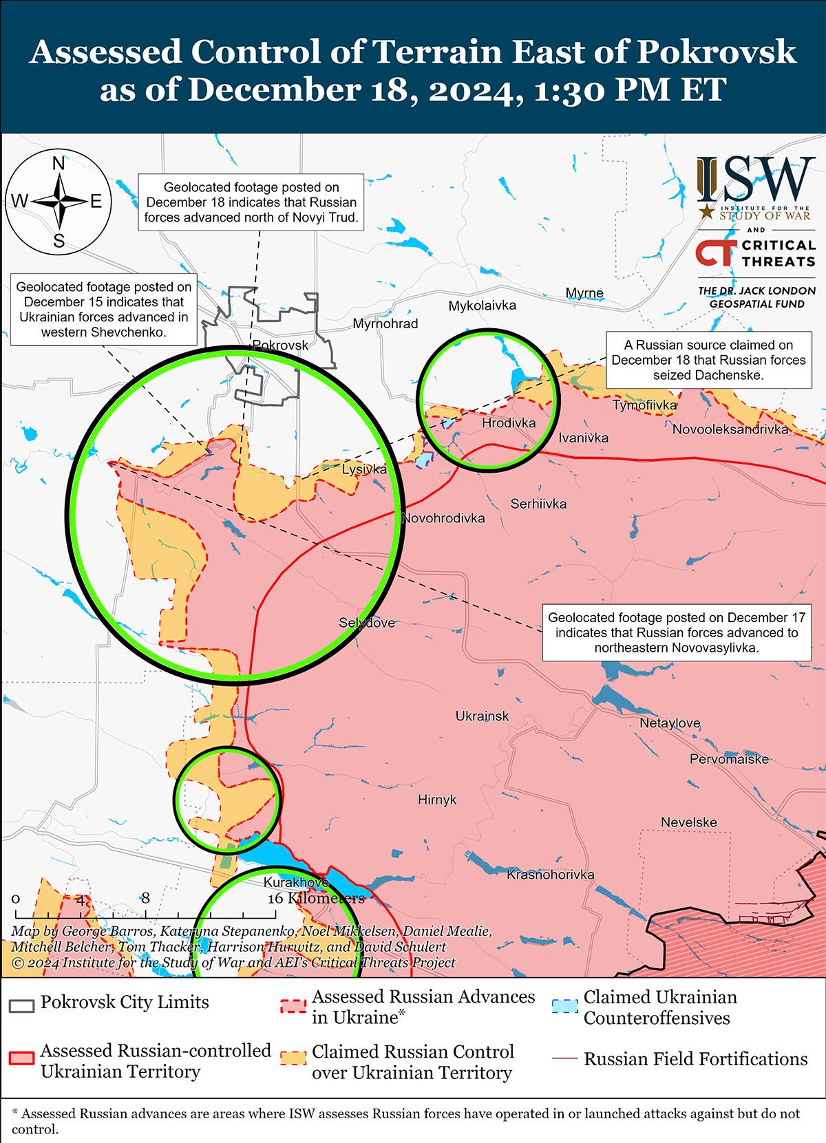 В последнее время российские войска продвинулись под Покровском на фоне продолжающихся наступательных действий в этом районе 18 декабря. Геолоцированные кадры, опубликованные 18 декабря, указывают на то, что российские войска недавно продвинулись в районе железнодорожной линии к северу от Нового Труда (к югу от Покровска). [46] Российские военные блогеры утверждали, что российские войска захватили половину Даченского (к югу от Покровска) и продвинулись в районе Новооленовки (к югу от Покровска) на участке шириной 2,3 км и глубиной 1,35 км в районе Украинки (к югу от Покровска), вдоль фронта шириной до 800 м к западу от Новотроицкого (к юго-западу от Покровска) и до Вовково (к юго-западу от Покровска). [47] Однако ISW не обнаружил подтверждения этих заявлений. Российский источник заявил, что российские войска продвигаются из Новотроицкого (к юго-западу от Покровска) в сторону Нововасильевки (к западу от Новотроицкого), но неясно, смогли ли российские войска закрепиться. [48] Некоторые российские источники утверждали, что российские войска начали наступление на Песчаное (к юго-западу от Покровска и к северо-западу от Шевченко) и продвинулись к окраинам населенного пункта, в то время как другой российский источник утверждал, что информация о российских позициях в Песчаном не подтверждена. [49] Один из российских военных блогеров заявил 18 декабря, что украинские войска контратаковали под Шевченко. [50] Враг продолжал наступательные действия к востоку от Покровска в районе Миролюбовки и Проминя; юго-восточнее Покровска в районе Лысовки и Сухого Яра; южнее Покровска в районе Даченского, Зеленого, Нового Труда, Новоалексеевки и Пушкино; и к юго-западу от Покровска в районах Новооленовки, Нововасильевки, Новопустинки, Песчаного, Новотроицкого, Соленого, Шевченко, Новоелизаветовки и Украинки 17 и 18 декабря. [51] Глава Донецкой областной военной администрации Украины Вадим Филашкин сообщил 18 декабря, что российские войска находятся примерно в трех километрах от Покровска и что украинские власти эвакуировали всех детей и их семьи из города. [52]