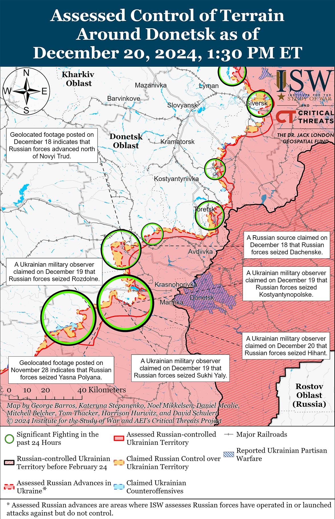 В последнее время российские войска продвинулись на севере и юге Торецка на фоне продолжающихся наступательных операций в этом районе 19 и 20 декабря. На геолоцированных кадрах, опубликованных 18 и 20 декабря, видно, что российские войска незначительно продвинулись к улице Украинской на севере Торецка и к улице Гагарина на юго-востоке Торецка. [40] Российский военный блогер утверждал, что российские войска продвинулись на 500 метров в микрорайоне Забалка (юго-восток Торецка), что в целом согласуется с имеющимися геолоцированными кадрами российских завоеваний вдоль улицы Гагарина. [41] Другой российский военный блогер заявил, что украинские войска контратакуют к северу от отвала шахты «Центральная» в центре Торецка. [42] Бои продолжались и в самом Торецке; к западу от Торецка в районе Щербиновки; и юго-западнее Торецка в районе Леонидовки 19 и 20 декабря. [43]