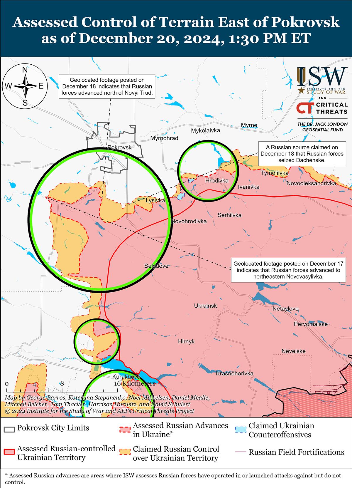 20 декабря враг продолжил наступательные действия на Покровском направлении, но подтвержденных успехов не достиг. Российские военные блогеры утверждают, что российские войска продвинулись к юго-западу от Покровска к востоку от Соленого, северу Новооленовки и востоку Украинки. [44] Однако ISW не обнаружил визуального подтверждения этих заявлений. Бои продолжались восточнее Покровска в районе Миролюбовки и Проминя; юго-восточнее Покровска в районе Лысовки; южнее Покровска в районе Зеленого, Даченского и Нового Труда; и к юго-западу от Покровска в районе Соленого, Нововасильевки, Новоалексеевки, Волково, Песчаного, Сухой Балки и Украинки 19 и 20 декабря. [45] Министерство обороны Российской Федерации приписало участие в захвате населенного пункта Новопустинка (к юго-западу от Покровска), который, по оценкам ISW, был захвачен российскими войсками по состоянию на 5 декабря. [46]