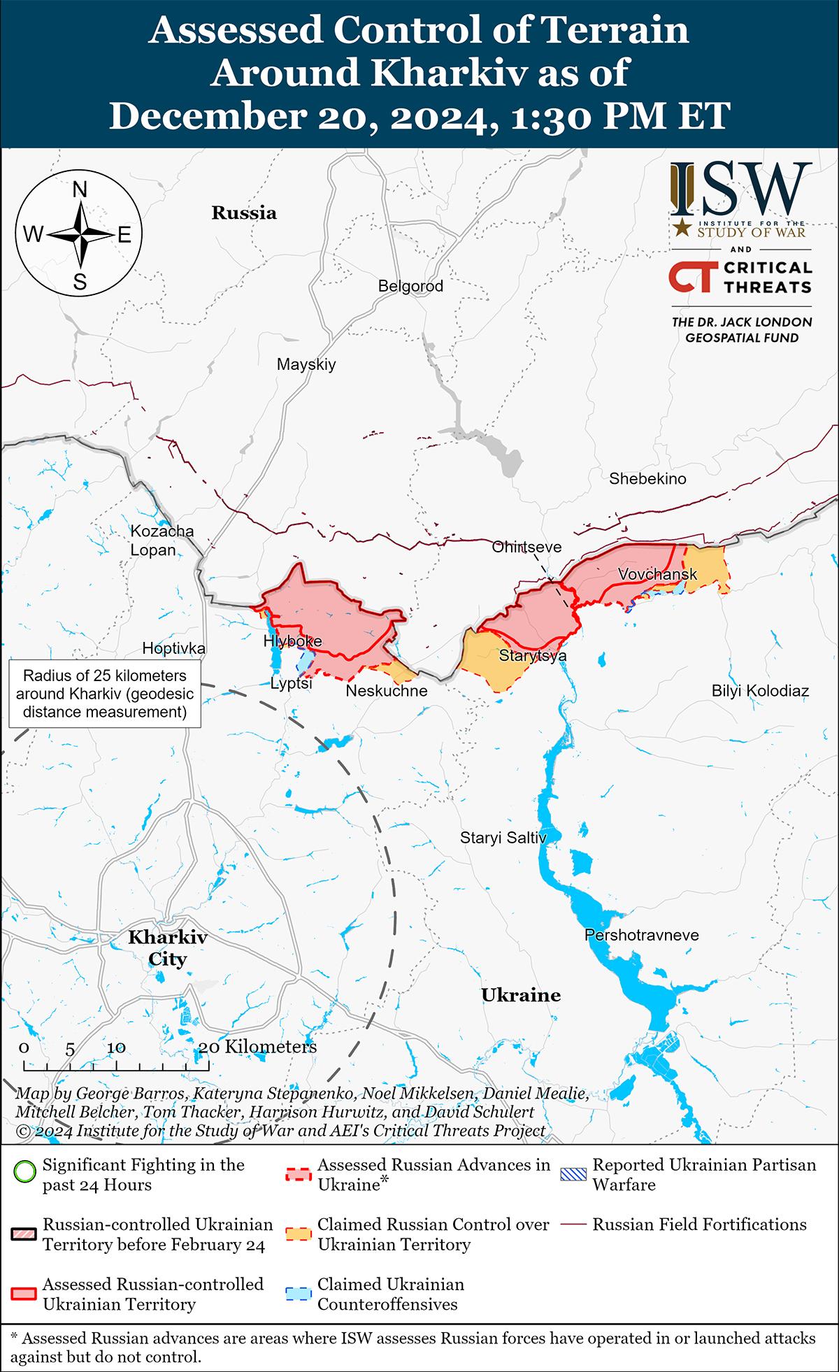 Ни российские, ни украинские источники не сообщали о наземных действиях на севере Харьковской области 20 декабря. Командир украинского подразделения, действующего на Харьковском направлении, заявил, что российские войска продолжают вести пехотные атаки и что погодные условия не позволяют российским войскам вести механизированные атаки в этом районе. [29] Командир подразделения добавил, что сильный дождь не позволяет украинским и российским силам использовать разведывательные беспилотники.