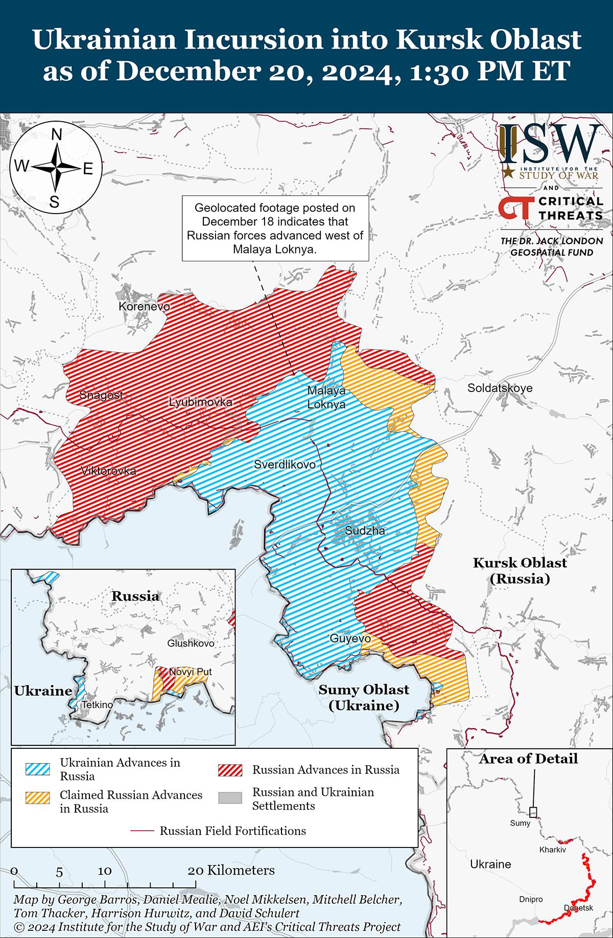 В последнее время российские войска продвинулись в пределах Курской области на фоне продолжающихся наступательных действий 20 декабря. На геолоцированных кадрах, опубликованных 18 декабря, видно, как украинские войска наносят удары по предполагаемым северокорейским позициям под российским командованием к западу от Малой Локни (к северу от Суджи), что указывает на то, что российские войска недавно продвинулись к западу от Малой Локни. [19] Российский военный блогер утверждал, что российские войска продвинулись к юго-востоку от Суджи в районе Черкасской Конопелки, но ISW не обнаружил подтверждения этому заявлению. [20] Российский военный блогер утверждал, что украинские войска контратаковали в районе Новоивановки и Дарьино (оба к юго-востоку от Коренево). [21] Сообщается, что части российской 106-й воздушно-десантной дивизии (ВДВ) продолжают действовать в Курской области. [22] Российский военный блогер 20 декабря заявил, что в районе Малой Локни действует расчет беспилотников 34-й мотострелковой бригады ВС РФ (49-я общевойсковая армия, Южный военный округ). [23] По состоянию на 12 декабря в ISW поступили сообщения о том, что подразделения российской 34-й мотострелковой бригады действуют в районе Великой Новоселки, а в течение 2024 года наблюдались сообщения о том, что подразделения этой бригады действовали в районе Великой Новоселки. [24]