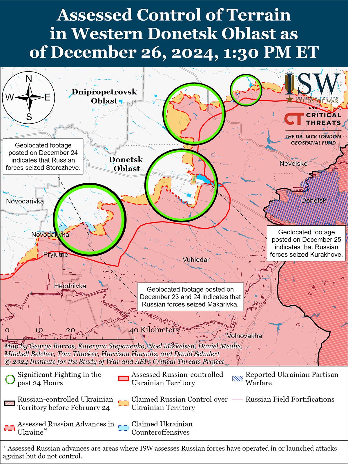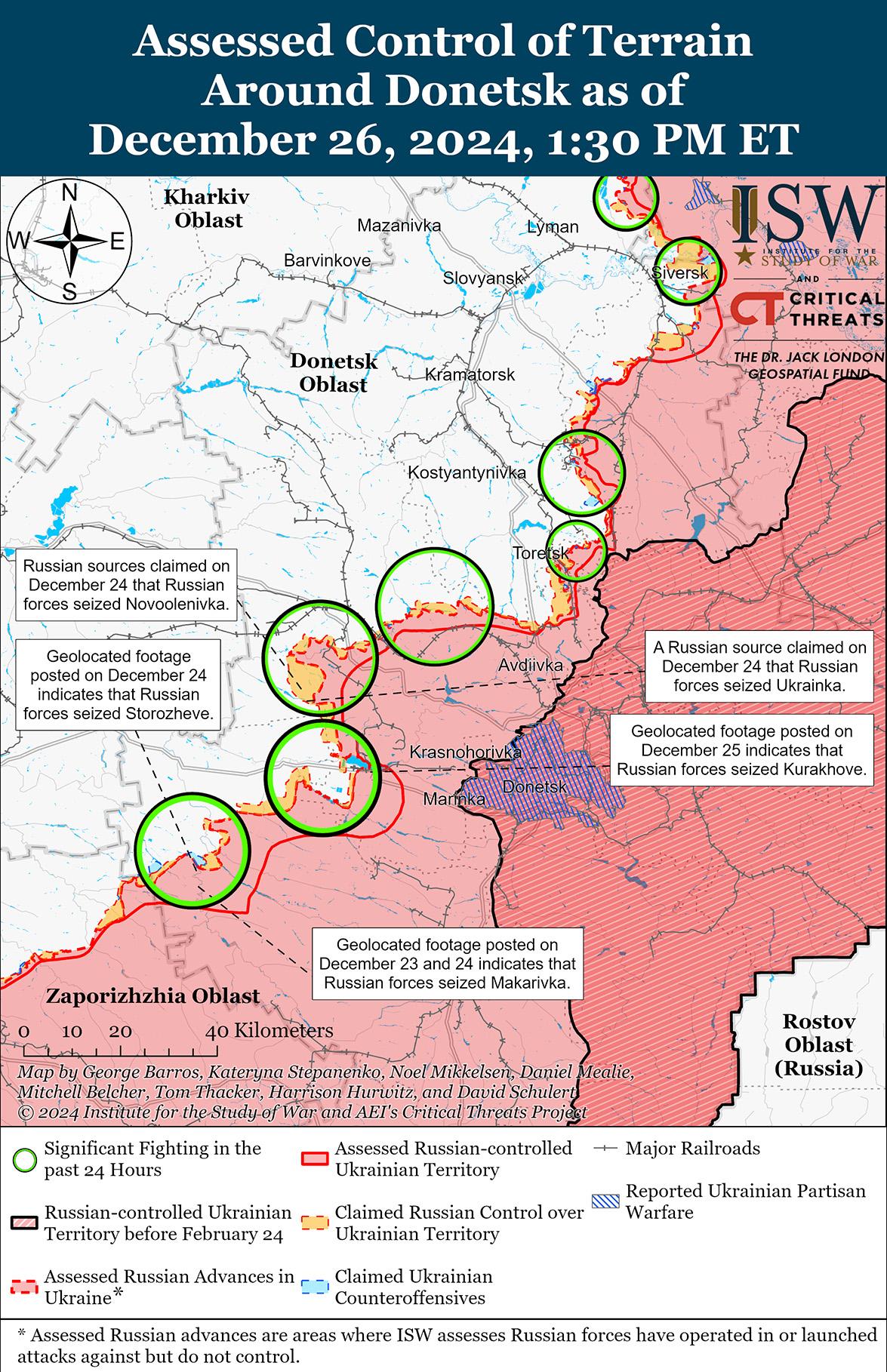 В последнее время российские войска продвинулись на Покровском направлении на фоне продолжающихся наступательных действий в этом районе 25 и 26 декабря. Геолоцированные кадры, опубликованные 24 и 25 декабря, указывают на то, что российские войска недавно продвинулись к западу от Пушкино и в центральной части Нового Труда (оба к югу от Покровска). [68] Дополнительные геолоцированные кадры, опубликованные 18 декабря, указывают на то, что российские войска продвинулись к востоку от Украинки (к юго-западу от Пушкино). [69] Российские военные блогеры утверждали, что российские войска почти захватили Нововасильевку (к юго-востоку от Покровска) и продвинулись к югу от Нововасильевки, к Успеновке (к западу от Нововасильевки) на фронте до шести километров и глубиной до 1,8 километра между Нововасильевкой и Новоелизаветовкой (к югу от Нововасильевки), на фронте до 5,6 километра и глубиной до 1,5 километра к югу от Волково (к юго-западу от Покровска), к западу от Песчаного (к юго-западу от Покровска и к востоку от Волково), по Донецкой железной дороге к северо-востоку от Шевченко (к югу от Покровска) и к востоку от Сухого Яра (к юго-востоку от Покровска), а также к северу и северо-западу от Гровки (к востоку от Покровска). [70] 25 декабря Министерство обороны России заявило, что российские войска захватили Новый Труд (к югу от Покровска). [71] Российский источник утверждал, что российские войска форсировали реку Казенный Торец к востоку от Миролюбовки (к востоку от Покровска). [72] Однако ISW не обнаружил подтверждения этих заявлений. Российский военный блогер утверждал, что российские войска находятся менее чем в 2,5 километрах от трассы Т-0406 к юго-западу от Покровска, но ISW обнаружил только подтверждение того, что российские войска находятся примерно в 3,5 километрах от дороги. [73] Российские войска вели наступательные действия в районе Покровска; восточнее Покровска в районе Зеленого Поля, Воздвиженки, Миролюбовки и Проминя; юго-восточнее Покровска в районе Лысовки; южнее Покровска в районе Даченского, Нового Труда, Зеленого и Шевченко; и юго-западнее Покровска в районе Новотроицкого, Вовково, Нововасильевки, Песчаного, Новоелизаветовки и Новооленовки 24-26 декабря. [74] Российские военные блогеры утверждали, что украинские войска контратаковали вблизи Песчаного, Нововасильевки и Новотроицкого и вернули утраченные позиции на северо-восточных окраинах Вовково. [75] Военнослужащий украинской бригады, действовавшей на Покровском направлении, заявил 26 декабря, что российские войска продвигаются к западу от Покровска в рамках усилий по выходу на трассу М-30 Покровск – Павлоград. [76] По его словам, в течение последних двух недель российские войска атаковали только небольшими группами пехоты в составе двух-пяти человек и не применяли тяжелую технику. Сообщается, что части российских 15-й и 30-й мотострелковых бригад (обе входят в состав 2-й ОА Центрального военного округа) действуют вблизи Новооленовки, Вовково, Песчаного и Соленого (к юго-западу от Покровска); сообщается, что на Покровском направлении действуют операторы беспилотников 38-й мотострелковой бригады (35-я ОА, Восточный военный округ [ВВО]) и подразделения отряда спецназа «Вега» (24-я бригада спецназа, Главное разведывательное управление Генерального штаба России [ГРУ]). [77]