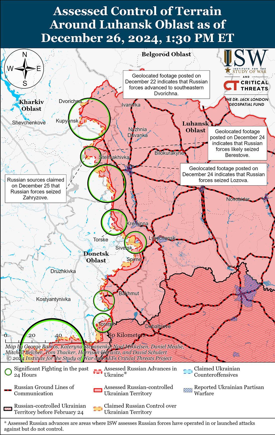 В последнее время российские войска продвинулись к юго-востоку и юго-западу от Купянска на фоне продолжающихся наступательных операций вдоль линии Купянск-Сватово-Кременная 25 и 26 декабря. Геолоцированные кадры, опубликованные 24, 25 и 26 декабря, свидетельствуют о том, что российские войска недавно захватили Лозовую (к юго-востоку от Купянска) и Берестовое (к северо-востоку от Лозовой) и продвинулись вдоль улицы Степной на юге Загрызово (к юго-востоку от Купянска) и на востоке Новоегоровки (к юго-западу от Сватово). [53] Российские военные блогеры утверждали, что российские войска захватили Загрызово (к юго-востоку от Купянска) и продвинулись вдоль трассы Р-79 между Двуречной и Западным (оба к северу от Купянска); в восточную Ивановку после форсирования реки Жеребец; к западу от Макеевки; и севернее Невского (все северо-западнее Кременной). [54] Однако ISW не обнаружил подтверждения этих утверждений. Враг продолжил наступательные действия к северу от Купянска в районе Доброшовки; северо-восточнее Купянска в районе Двуречной; северо-западнее Купянска в районе Ольшаны; восточнее Купянска в районе Петропавловки; к юго-востоку от Купянска в районах населенных пунктов Колесниковка, Загрызово, Стельмаховка и Лозовая; к юго-западу от Сватово в районах населенных пунктов Чернещина, Грековка, Новоегоровка, Макеевка, Твердохлебово, Сергеевка и Новосергиевка; к западу от Сватово в районе Копанки, Новой Крутяковки и Зеленого Гая; северо-западнее Кременной в районе Ямполовки, Терны и Дружелюбовки; к западу от Кременной у Торского; и юго-западнее Кременной в районе Серебрянского лесничества и Григорьевки с 24 по 26 декабря. [55] Сообщается, что части российской 27-й мотострелковой бригады (1-я гвардейская танковая армия, Московский военный округ) действуют в районе Купянска и Лозовой; сообщается, что подразделения 3-й мотострелковой дивизии (20-я общевойсковая армия, МВО) действуют в районе Лозовой; по сообщениям, подразделения 423-го мотострелкового полка и 12-го танкового полка (оба входят в состав 4-й танковой дивизии 1-й ГТА, МВО) действуют в районе Зеленого Гая; на Купянском направлении действуют подразделения 375-го отдельного противотанкового артиллерийского дивизиона (47-я танковая дивизия, 1-я ГТА, МВО). [56]