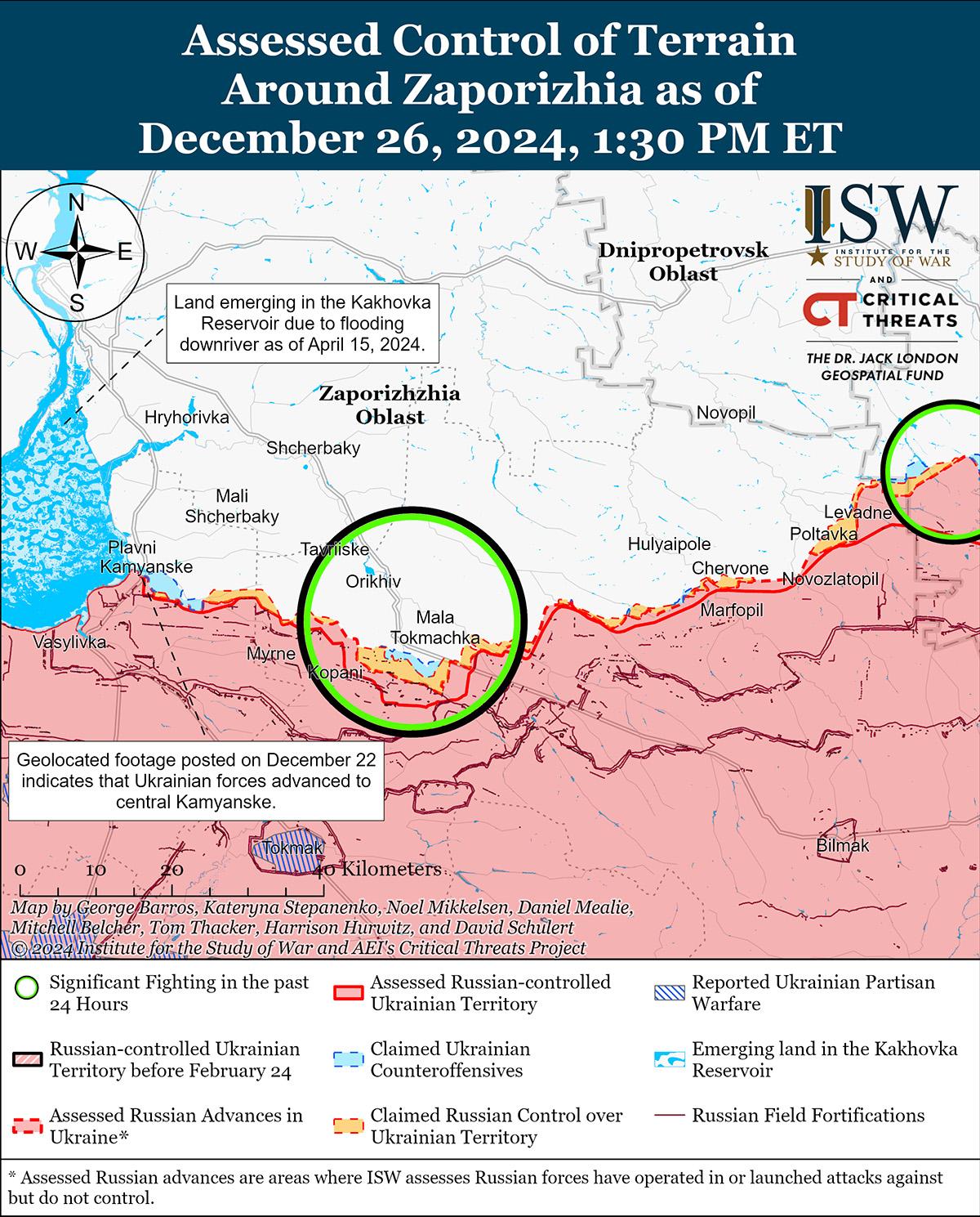 25 и 26 декабря враг продолжал наступательные действия на западе Запорожской области, но подтвержденных успехов не достиг. 25 декабря российские военные блогеры заявили, что российские войска продвинулись к югу и юго-западу от Новоданиловки (к северу от Работино) и к Каменскому (к северо-западу от Работино и к югу от Запорожья). [91] Однако ISW не обнаружил подтверждения этих заявлений. 24-26 декабря враг вел наступательные действия к северо-западу от Работино в районе Новоандреевки и к северу от Работино в районе Новоданиловки. [92] Российский военный блогер утверждал, что украинские войска контратаковали на Каменском направлении. [93] Другие российские военные блогеры утверждали, что украинские войска не ведут наступательных действий вблизи Каменского. [94] Сообщается, что на запорожском направлении действуют снайперские подразделения 14-й гвардейской бригады спецназа России (Главное управление Генерального штаба России [ГРУ]) и подразделения 247-го воздушно-десантного полка (7-я дивизия ВДВ). [95]