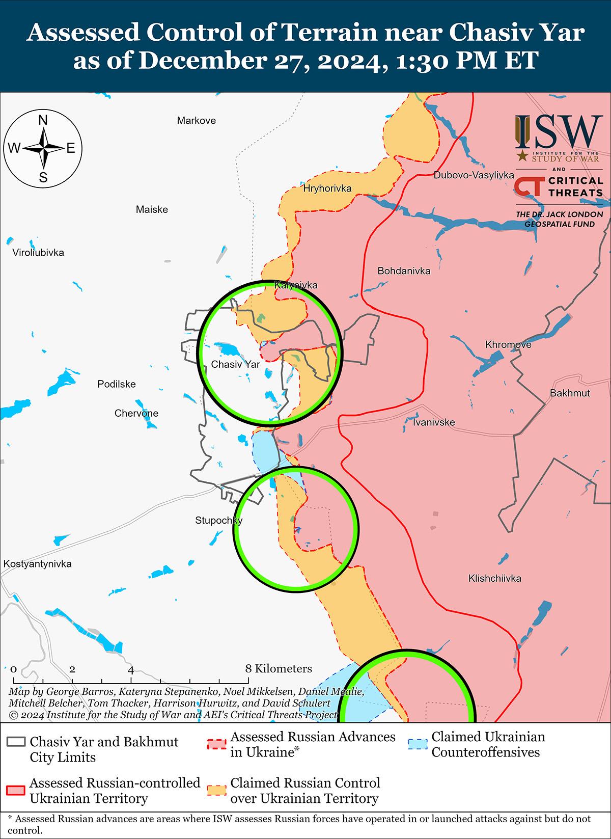 Противник продолжал наступательные действия на направлении Часова Яра, но 27 декабря не добился подтвержденных успехов. Российский военный блогер заявил, что российские войска очистили от украинских войск район возле озера в микрорайоне Пивничный (север Часова Яра) и продвигаются в центральную часть микрорайона. [50] Однако ISW не обнаружил подтверждения этого заявления. Российские войска продолжили наступление в самом Часовом Яру; к северу от Часова Яра в районе Григорьевки; восточнее Часова Яра в районе Ивановского; к юго-востоку от Часова Яра в районе Курдюмовки и Клещеевки; и южнее Часова Яра в районе Ступочки, Александро-Шультино и Белой Горы. [51] 27 декабря действующая в этом районе украинская бригада опубликовала кадры, на которых видно, как украинские войска наносят удары по российской бронетехнике в районе Курдюмовки, и сообщали, что украинские войска отразили небольшую танковую атаку вблизи населенного пункта. [52] Другая украинская бригада, действующая на направлении Часова Яра, 27 декабря опубликовала кадры, на которых украинские войска отбивают взводный механизированный штурм в районе Ивановского и Клещеевки. [53] Российские военные блогеры утверждают, что бои за огнеупорный завод в центре Часова Яра продолжаются. [54] Сообщается, что в Часовом Яру действуют подразделения российской 98-й воздушно-десантной дивизии (ВДВ), а вблизи Ивановского – беспилотники 112-го стрелкового полка (114-я мотострелковая бригада, 51-я ОА, бывший 1-й армейский корпус Донецкой Народной Республики [АК ДНР]). [55]