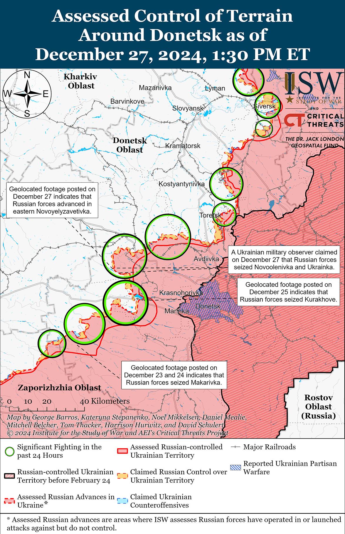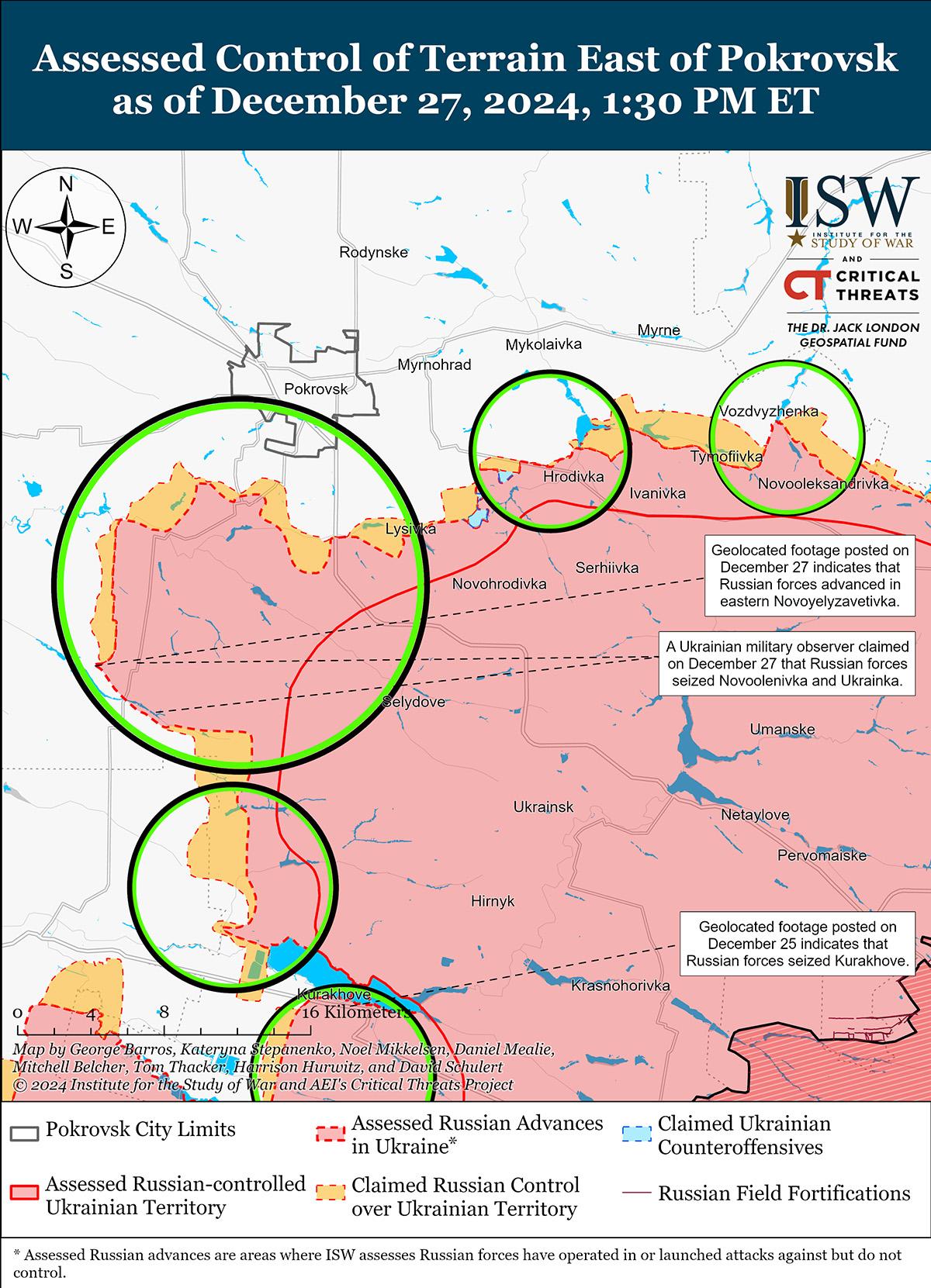 В последнее время российские войска продвинулись к югу от Покровска на фоне продолжающихся наступательных действий на Покровском направлении 27 декабря. Геолоцированные кадры, опубликованные 27 декабря, свидетельствуют о том, что российские войска недавно продвинулись в восточную часть Новоелизаветовки (к югу от Покровска). [60] Украинский военный обозреватель Константин Машовец заявил, что части 238-го и 80-го танковых полков и 428-го мотострелкового полка 90-й танковой дивизии (41-я ОА, Центральный военный округ) и 428-го мотострелкового полка недавно продвинулись к Новоелизаветовке и захватили Украинку и Новооленовку (к востоку от Новоелзаветовки и к югу от Покровска). [61] Российские военные блогеры также утверждали, что российские войска захватили Украинку и Новооленовку и продвинулись в районе Лысовки (к юго-востоку от Покровска) и в километре от Ученского (к юго-западу от Лысовки). [62] Российский военный блогер утверждал, что в захвате Новооленовки также участвовали подразделения 30-й мотострелковой бригады ВС РФ. [63] Машовец заявил, что части 239-го танкового полка и 433-го мотострелкового полка (27-я моторизованная дивизия Рифе, 2-я САА, СМД), вероятно, при поддержке недавно сформированных частей 74-й мотострелковой бригады (41-я САА) недавно продвинулись в районе Песчаного и до Нововасильевки (как к северу от Новоелизаветовки, так и к юго-западу от Покровска). [64] Один из украинских батальонов опубликовал кадры, на которых, как утверждается, российские войска ведут моторизованное наступление с использованием одной бронированной машины и семи гражданских автомобилей якобы в неуказанном районе Покровского направления. [65] Российские войска продолжали наступательные действия в районе Покровска; северо-восточнее Покровска в районе Воздвиженки и Миролюбовки; восточнее Покровска в районе Проминя; юго-восточнее Покровска в районе Лысовки; южнее Покровска в районе Зеленого, Даченского, Нового Труда, Шевченко и Песчаного; и юго-западнее Покровска в районе Волково, Новооленовки, Новотроицкого, Нововасильевки и Новоелизаветовки 26 и 27 декабря. [66] Российский военный блогер утверждал, что украинские войска контратаковали под Шевченко. [67]