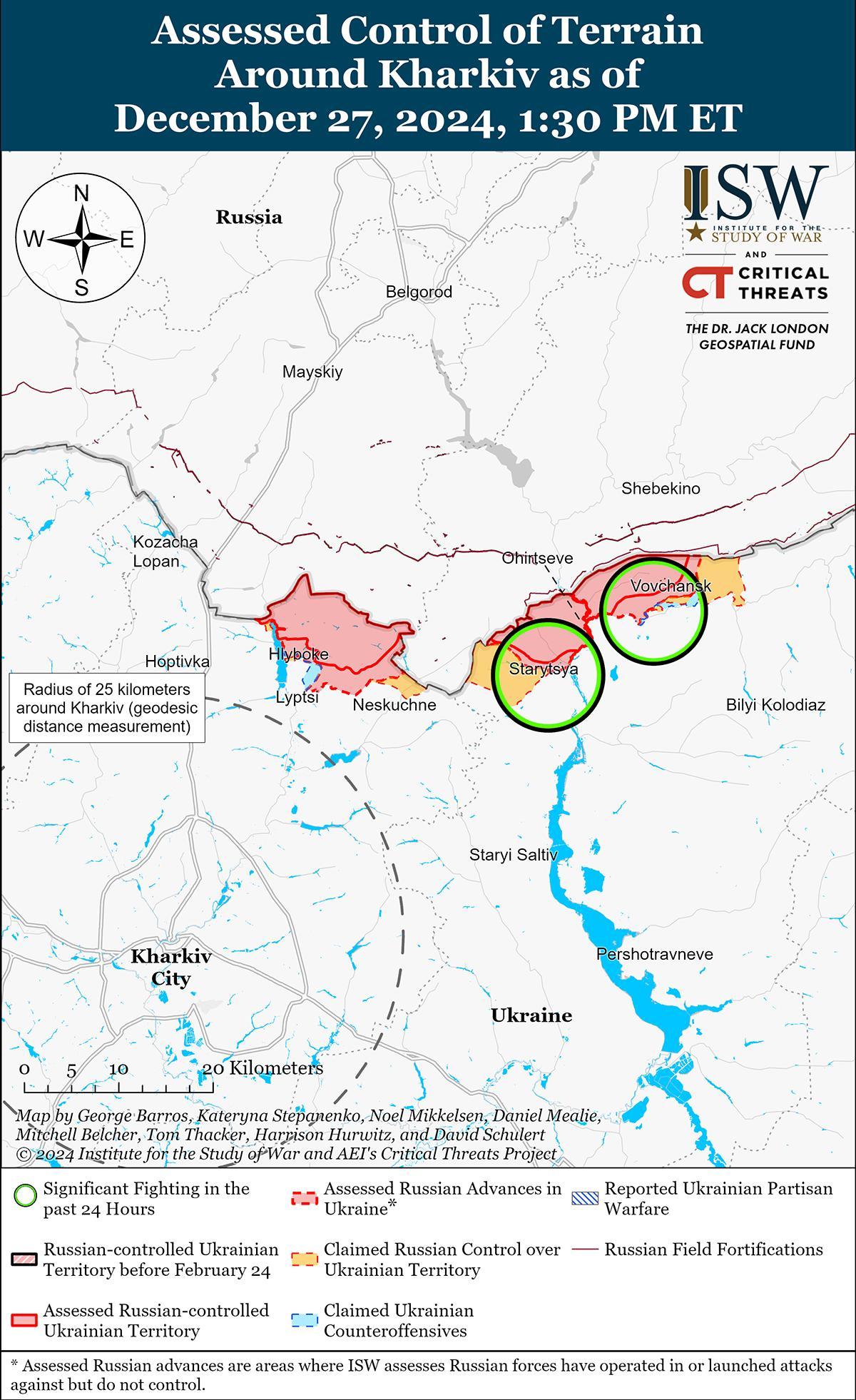 27 декабря враг продолжил наземные атаки на Харьковском направлении, но подтвержденных успехов не имел. 26 и 27 декабря российские источники сообщили, что российские войска продвинулись к северо-востоку от Харькова в Старице, форсировали реку Волчья, продвинулись на 80 метров в Волчанске и пытаются подготовить плацдарм для дальнейших действий в этом районе. [32] Однако ISW не обнаружил подтверждения этих заявлений. 26 и 27 декабря враг вел наступательные действия к северу от Харькова в районе населенных пунктов Липцы и к северо-востоку от Харькова в районе Станицы и Волчанска. [33] 27 декабря российский военный блогер заявил, что украинские войска провели две контратаки пехоты численностью до взвода под Волчанском. [34]