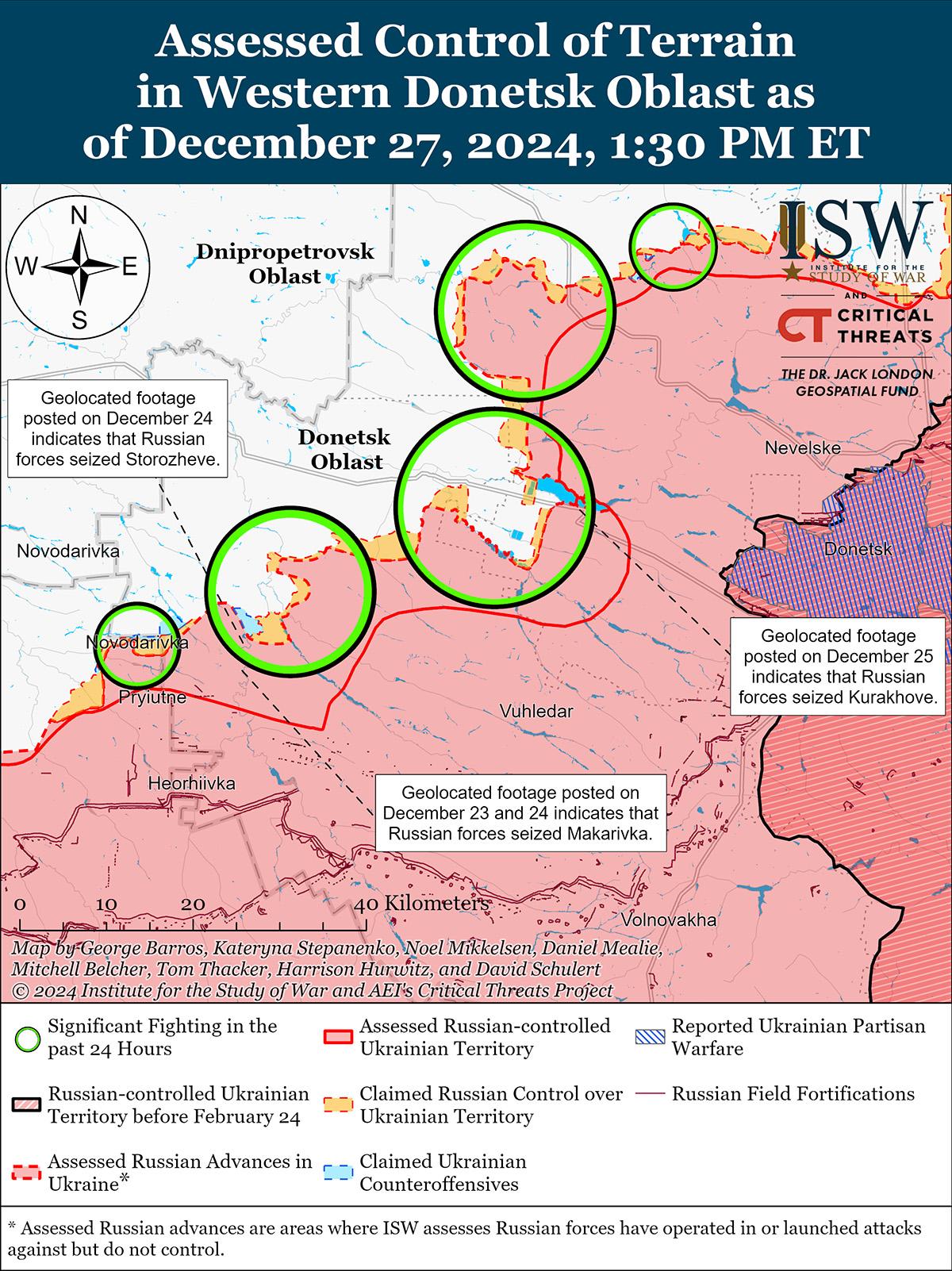 Бои на главном украинском выступе в Курской области продолжались 27 декабря, но подтвержденных успехов не было. Украинский батальон, действующий в Курской области, сообщил, что украинские войска захватили неуказанную позицию в этом районе. [26] Российский военный блогер утверждал, что российские войска продвигаются к северу от Русского Поречного и от Нечаева (оба к северу от Суджи), но ISW не обнаружил подтверждения этому заявлению. [27] Российские войска вели наступательные действия к югу от Кругленького (к юго-востоку от Коренево), к северу от Мартыновки (к северо-востоку от Суджи) и в лесных массивах вблизи Суджи. [28] На геолоцированных кадрах, опубликованных 26 декабря, видно, что украинские войска отразили российскую механизированную атаку численностью примерно до взвода к западу от Малой Локни (к северу от Суджи). [29] 26 и 27 декабря российские военные блогеры утверждали, что украинские войска контратаковали на всем своем выступе от юго-востока Коренево до юга от Суджи вдоль линии Леонидово-Гуево и в лесных массивах Суджинского района. [30] Сообщается, что в Курской области действуют операторы беспилотников 76-й воздушно-десантной дивизии (ВДВ), подразделения 34-й мотострелковой бригады (49-я общевойсковая армия, Южный военный округ) и подразделения 80-й арктической мотострелковой бригады (14-й армейский корпус, Ленинградский военный округ). [31]