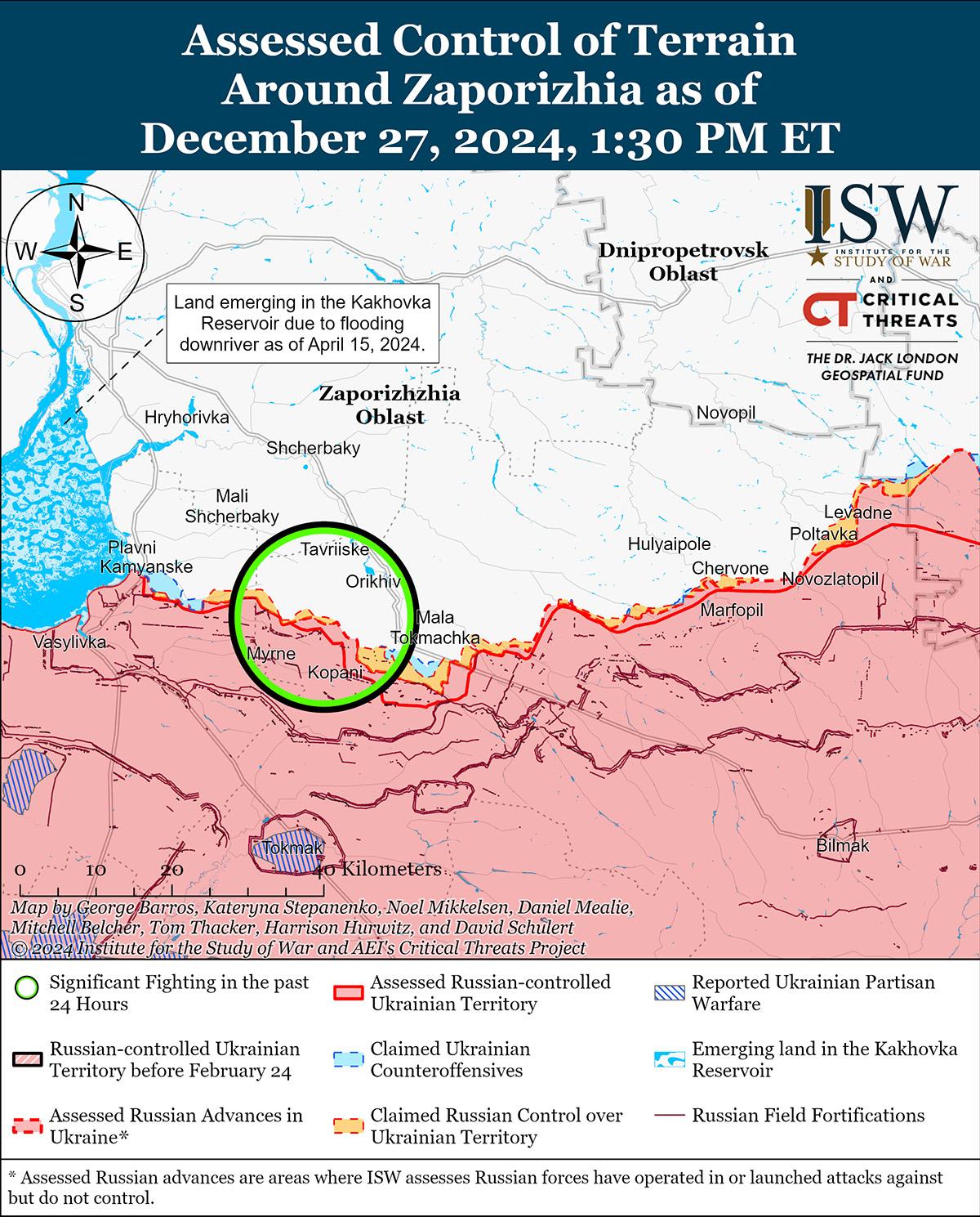 27 декабря российские войска продолжили наступательные действия в западной части Запорожья, но не добились подтвержденных успехов. 26 и 27 декабря враг продолжил атаки к северо-западу от Работино в районах Новоандреевки и Каменского (к северо-западу от Работино и к югу от Запорожья). [84] Представитель Таврийской группировки войск полковник Владислав Волошин 27 декабря заявил, что российские войска развертывают на Запорожском направлении беспилотники, подключенные к оптоволоконным кабелям, которые обладают высокой устойчивостью к украинским помехам радиоэлектронной борьбы (РЭБ). [85]