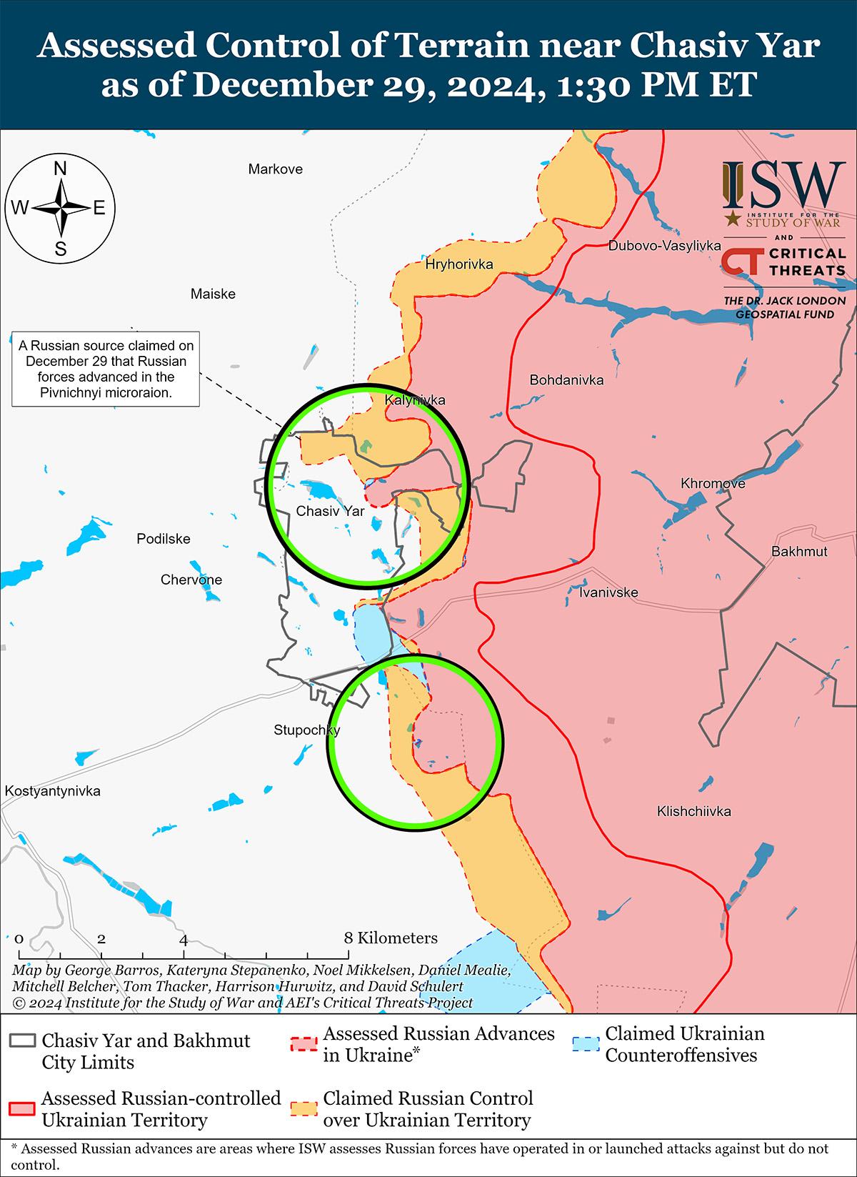 29 декабря враг продолжил наступательные действия на направлении Часов Яр, подтвержденных успехов не имел. Российские военные блогеры утверждали, что российские войска продвинулись к улице Чернышевского и к железнодорожной станции в западном Часовом Яру. [38] Однако ISW не обнаружил подтверждения этих заявлений. 28 и 29 декабря враг продолжил атаки в районах Часова Яра и к югу от Часова Яра в районе Ступочки. [39] Российские военные блогеры утверждали, что бои продолжались в районе Огнеупорного завода в центре Часова Яра и что украинские войска контратаковали в районе канала Северский Донец – Донбасс к югу от Нового микрорайона на юге Часова Яра. [40] Подразделения российской бригады «Север-В» (Российский добровольческий корпус), 98-й воздушно-десантной дивизии (ВДВ), 4-й мотострелковой бригады (3-й ОА), 200-й мотострелковой бригады (14-й АК Ленинградского военного округа), мотоштурмового батальона «Питбуля» добровольческой бригады «Эспаньола» (Российский добровольческий корпус), отряда «Шустрый» чеченского спецназа «Ахмат» и 1194-го мотострелкового полка (по сообщениям, 7-й военной базы), 49-я ОА, Южный военный округ [ЮВО]), как сообщается, действуют в направлении Часова Яра. [41]