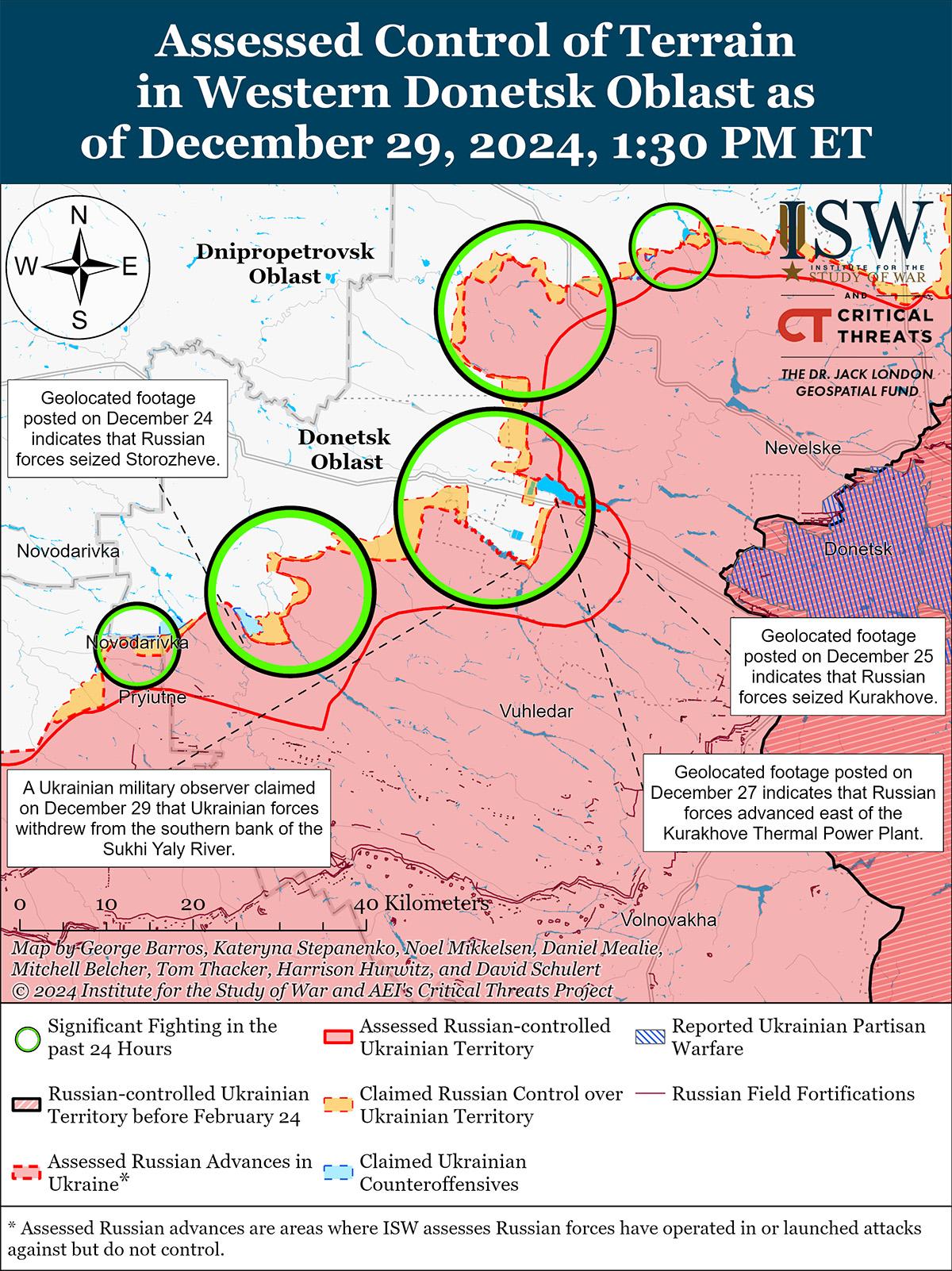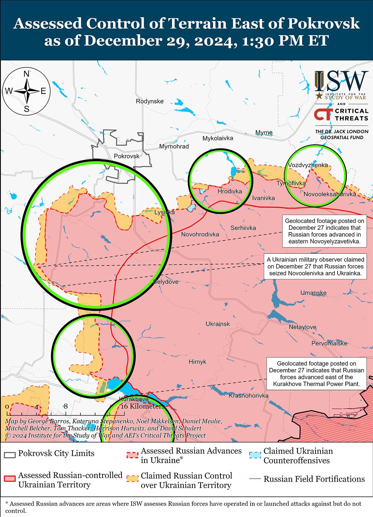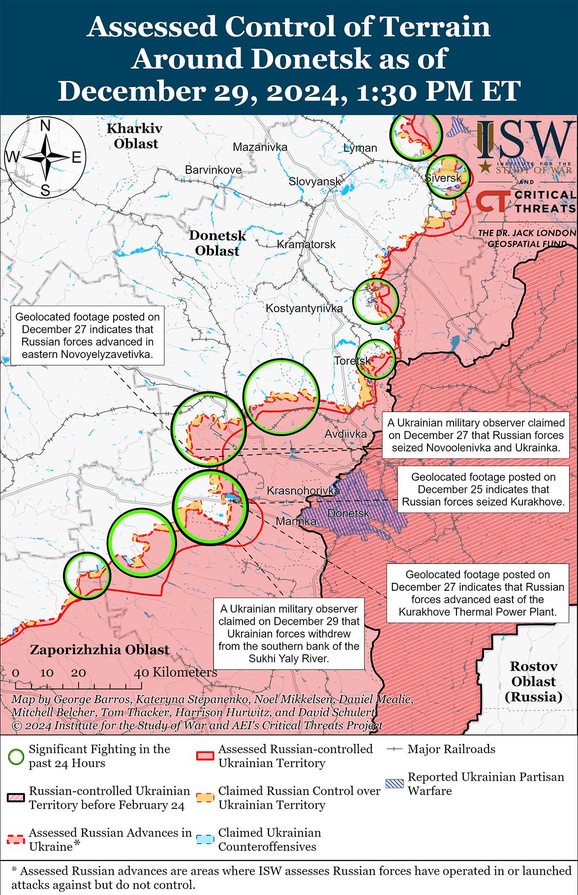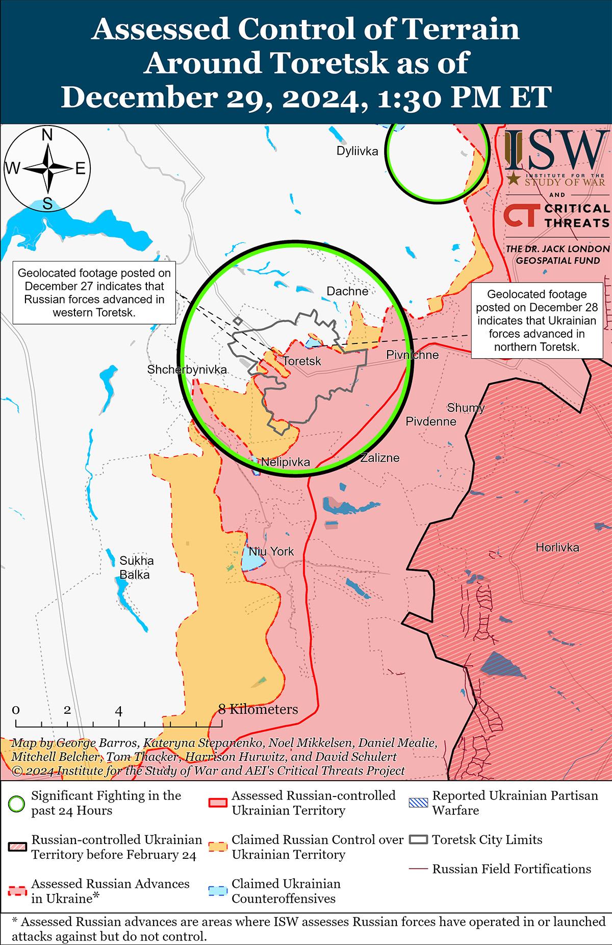 В последнее время российские войска продвинулись на Покровском направлении на фоне продолжающихся наступательных действий в этом районе 29 декабря. Геолоцированные кадры, опубликованные 28 и 29 декабря, свидетельствуют о том, что в последнее время российские войска продвинулись в промышленном секторе на восточной окраине Песчаного и в восточной части Новоелизаветовки (оба к юго-западу от Покровска). [45] Российские военные блогеры утверждали, что российские войска захватили Песчаное и Новоелизаветовку и продвинулись к северу и югу от Новоелизаветовки, между Новоелизаветовкой и Нововасильевкой (к северу от Новоелизаветовки), а также возле Проминя и Миролюбовки (оба к востоку от Покровска). [46] Однако ISW не обнаружил подтверждения этих заявлений. Министерство обороны России заявило 29 декабря, что российские войска захватили Новотроицкое, но, по оценкам ISW, российские войска захватили населенный пункт по состоянию на 12 декабря. [47] Российские войска вели наступательные действия в районе Покровска; восточнее Покровска в районе Зеленого Поля, Воздвиженки, Миролюбовки, Проминя и Калиново; юго-восточнее Покровска в районе Лысовки; южнее Покровска в районе Даченского, Нового Труда и Шевченко; и к юго-западу от Покровска в районе Первого Травня, Волково, Соленого, Новооленовки, Нововасильевки, Новоелизаветовки и Успеновки 28 и 29 декабря. [48] Российские источники утверждали, что украинские войска контратаковали в районе Песчаного и Успеновки. [49] Российский военный блогер заявил, что на Мирноградском направлении к востоку от Покровска активизировались бои. [50] Представитель украинской бригады, действующей на Покровском направлении, заявил, что российские войска почти не используют технику, особенно бронетехнику, и постоянно проводят пехотные атаки группами различной численности. [51] Украинский военный обозреватель Константин Машовец заявил, что подразделения российской 35-й мотострелковой бригады (41-я ОА, Центральный военный округ) ведут атаки к востоку от Даченского; что подразделения 74-й мотострелковой бригады (41-я ОА, ЦВО) ведут наступление в районе Шевченко; что подразделения 433-го и 506-го мотострелковых полков (оба из состава 27-й мотострелковой дивизии, 2-й ОА, ЦВО) при поддержке частей 74-й мотострелковой бригады (41-я ОА, ЦВО) атакуют в направлении линии Песчаное-Котлино и Звирово (все юго-западнее Покровска); и что части 90-й танковой дивизии (41-я ОА, ЦВО) атакуют по линиям Новотроицкое — Нововасильвика, Новотроицкое — Соленое, Новооленовка — Новоелизаветовка и Украинка — Ясеново (южнее Покровска). [52] Сообщается, что подразделения российской 15-й мотострелковой бригады (2-я ОА, ЦВО) захватили Новотроицкое, а операторы беспилотников подразделения «Бросок Кобры» 55-й мотострелковой бригады (41-й ОА, ЦВО) и подразделения батальона «Струна» действуют на Покровском направлении.[53]
