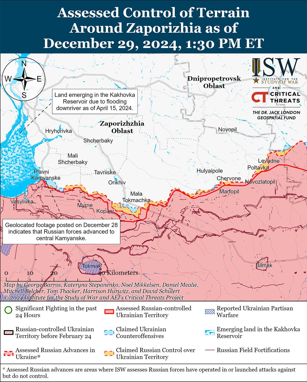 В последнее время российские войска продвинулись на западе Запорожской области на фоне продолжающихся наступательных действий в этом районе 29 декабря. Геолоцированные кадры, опубликованные 28 декабря, указывают на то, что российские войска недавно незначительно продвинулись в центре Каменского (к северо-западу от Работино и к югу от Запорожья), а российский военный блогер также заявил, что российские войска продвинулись в центре Каменского. [66] 29 декабря оккупационный чиновник Запорожской области Владимир Рогов заявил, что российские войска отразили украинские контратаки под Каменском и продолжают продвигаться вблизи населенного пункта. [67] В Генштабе Украины сообщили, что 28 и 29 декабря российские войска не вели наступательных действий на Ореховском (севернее Работино) и Гуляйполе (северо-восточнее Работино). [68] 29 декабря российский военный блогер заявил, что российские войска, действующие на Каменском направлении, не имеют достаточного количества беспилотников. [69] Сообщается, что на Запорожском направлении действуют подразделения российского 1429-го ремонтного батальона. [70]