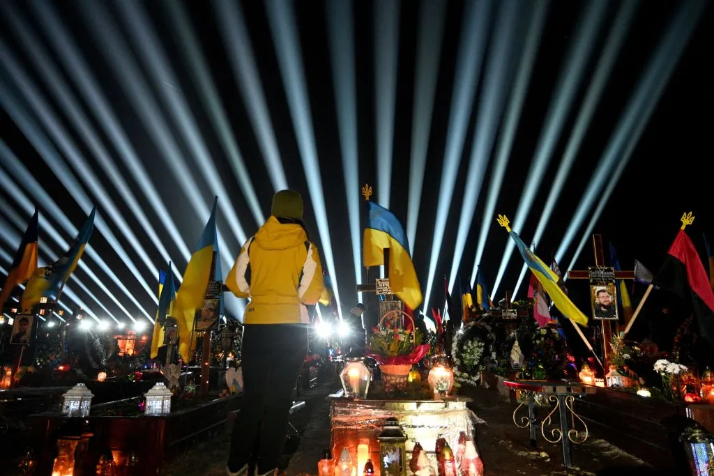 На этой фотографии изображена символическая иллюминация под названием «луч памяти» над могилами украинских солдат накануне первой годовщины вторжения России. Фотограф: ЮРИЙ ДЯЧИШИН/AFP