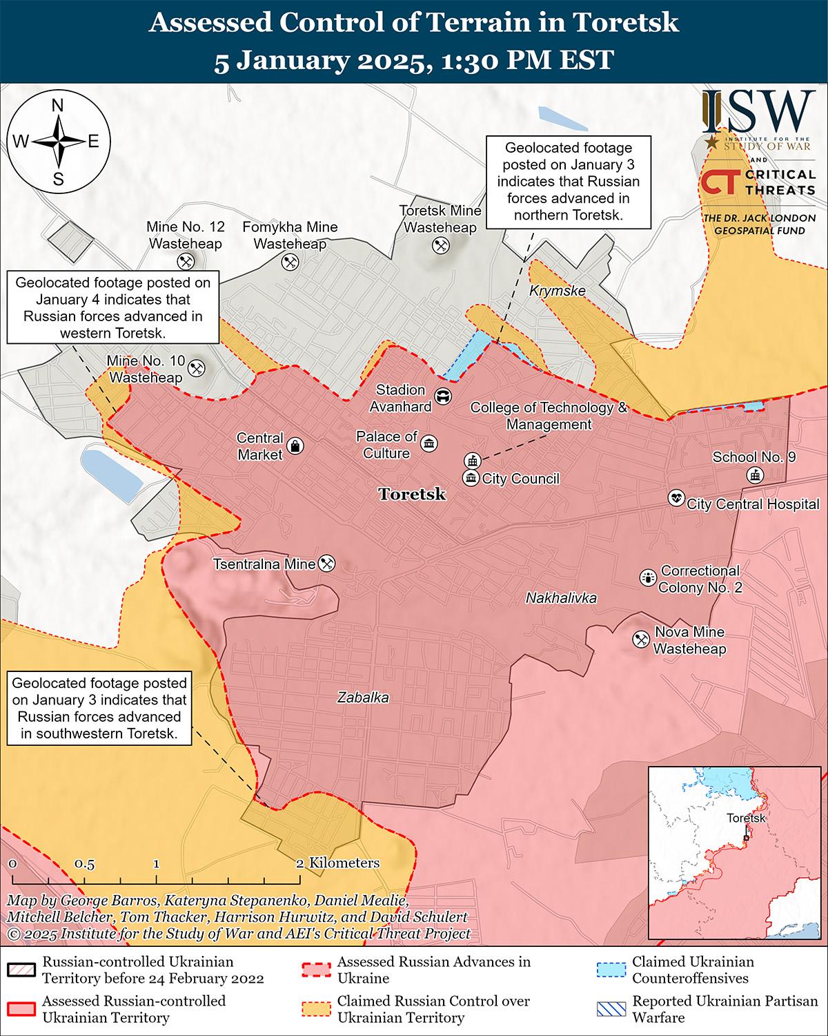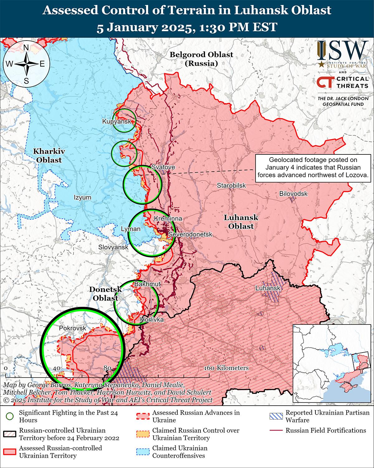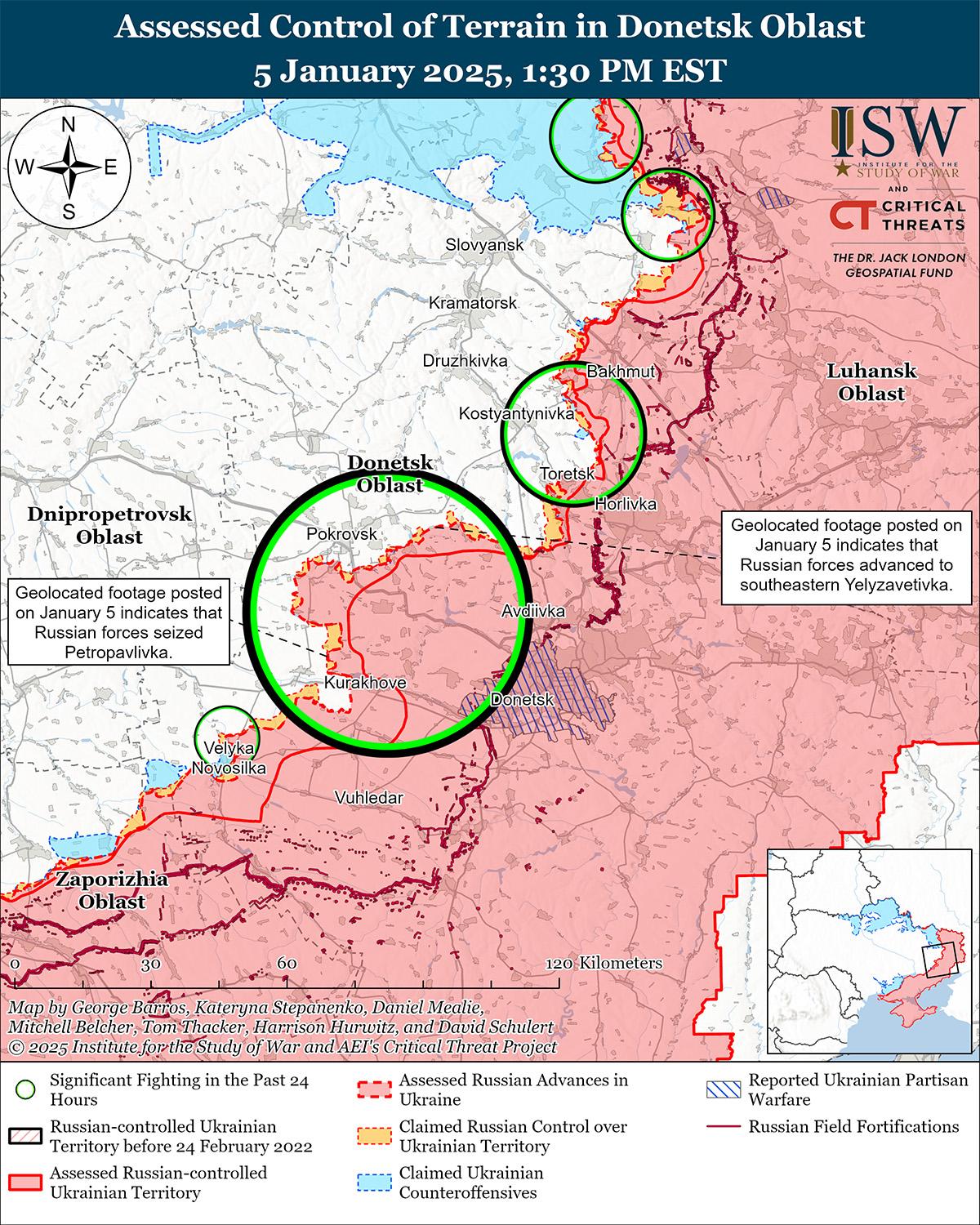 5 января российские войска продолжили наступательные действия к югу от Покровска. Российский военный блогер заявил, что российские войска продвигаются к юго-западу от Покровска в сторону Новоалександровки, вдоль линии Срибное-Новоандреевка от Новоелизаветовки и к Ясеново со стороны Украинки. [53] Однако ISW не обнаружил визуального подтверждения этого утверждения. Украинский военный обозреватель Константин Машовец заявил, что российские войска продвинулись в километре от Котлино (юго-западнее Покровска) и пытаются перекрыть трассу Т-04-06 Покровск-Межово. [54] Бои продолжались под самим Покровском; к северо-востоку от Покровска в районах населенных пунктов Барановка, Мирное, Елизаветовка и Тимофеевка; восточнее Покровска в районе Промина, Новоалександровки, Воздвиженки и Миролюбовки; юго-восточнее Покровска в районе Лысовки; южнее Покровска в районе Зеленого, Нового Труда, Шевченко и Песчаного; и к юго-западу от Покровска в районах Соленого, Новооленовки, Котлино, Успеновки, Нововасильевки и Новоелизаветовки 4 и 5 января. [55] Офицер украинской разведки, служащий в бригаде Национальной гвардии Украины, действующей на Покровском направлении, заявил, что российские войска теряют до 400 человек в сутки на Покровском направлении, но не снижают темп штурмов, отметив, что российские войска ведут эти атаки с личным составом, прошедшим подготовку всего несколько недель. [56] Украинский офицер заявил, что российские войска наносят удары из тяжелой артиллерии и авиации по объектам инфраструктуры и жилым домам в Покровске и Мирнограде (непосредственно к востоку от Покровска). [57] Представитель украинской бригады, действующей на Покровском направлении, заявил 5 января, что ветреная и снежная погода осложняет работу российских беспилотников и что российские войска активно используют в этом районе оптоволоконные беспилотники. [58]