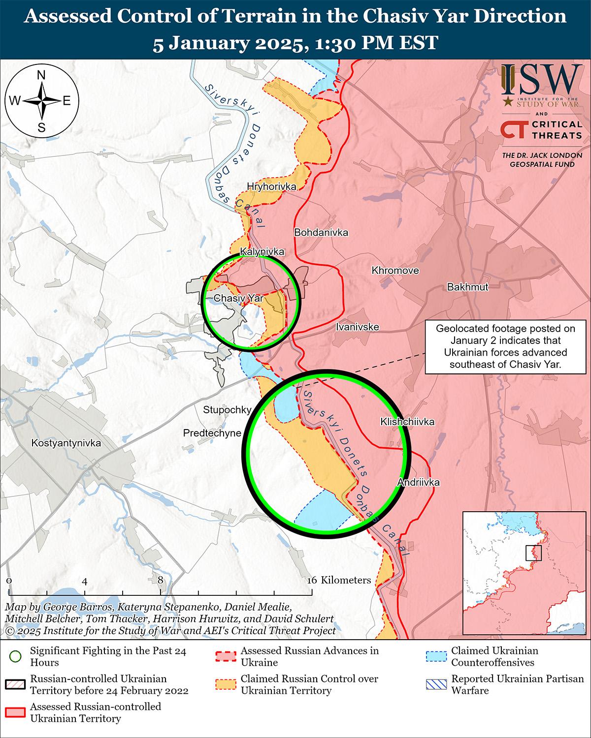 Недавно украинские войска отбили позиции в районе Часова Яра на фоне продолжающихся российских наступательных действий в этом районе 5 января. На геолоцированных кадрах, опубликованных 2 января, видно, что украинские силовики отбили позиции вдоль участка канала Северский Донец-Донбасс к юго-востоку от Часова Яра. [46] 4 и 5 января враг вел наступательные действия в районе Часова Яра, к юго-востоку от Часова Яра в районе Клещеевки и к югу от Часова Яра в районе Белой Горы и Ступочки. [47] 5 января российский военный блогер заявил, что в ближайшие дни российские войска могут активизировать усилия по вытеснению украинских войск с огнеупорного завода «Часов Яр» в центре Часова Яра. [48] Сообщается, что подразделения 98-й воздушно-десантной дивизии (ВДВ) продолжают действовать в Часовом Яру. [49]