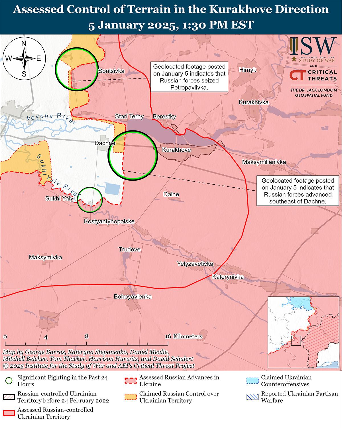 В последнее время российские войска продвинулись на Кураховском направлении на фоне продолжающихся наступательных действий в этом районе 5 января. Опубликованные 5 января геолоцированные кадры, на которых военнослужащие российской 114-й мотострелковой бригады (51-й ОА) поднимают флаг в центре Петропавловки (к северо-западу от Курахово), указывают на то, что российские войска, вероятно, недавно захватили населенный пункт. [59] Дополнительные геолоцированные кадры, опубликованные 5 января, указывают на то, что российские войска продвинулись в полях к юго-востоку от Дачного (к западу от Курахово). [60] 4 и 5 января российские войска продолжили наступательные действия вблизи самого Курахово, к северо-западу от Курахово в районе Петропавловки и Словянки, к западу от Курахово в районе Дачного и в направлении Константинополя, к югу от Курахово в направлении Янтарного и к юго-западу от Курахово в районе Константинопольского и Зеленовки. [61] 5 января пресс-секретарь группировки войск «Хортица» майор Виктор Трегубов заявил, что российские войска используют бронетехнику только на Угледарском и Кураховском направлениях для перевозки пехоты и не используют ее в штурмовых операциях или для огневой поддержки. [62] Представитель украинской бригады, действующей на Кураховском направлении, заявил, что российские войска используют в этом районе оптоволоконные беспилотники. [63] Сообщается, что подразделения российской 346-й бригады спецназа (Главное управление Генерального штаба России [ГРУ]) и 5-й мотострелковой бригады (51-я ОА) зачищают самые западные окраины Курахово. [64] Сообщается, что на Кураховском направлении действуют подразделения 255-го мотострелкового полка России (20-я мотострелковая дивизия, 8-я ОА, Южный военный округ). [65]