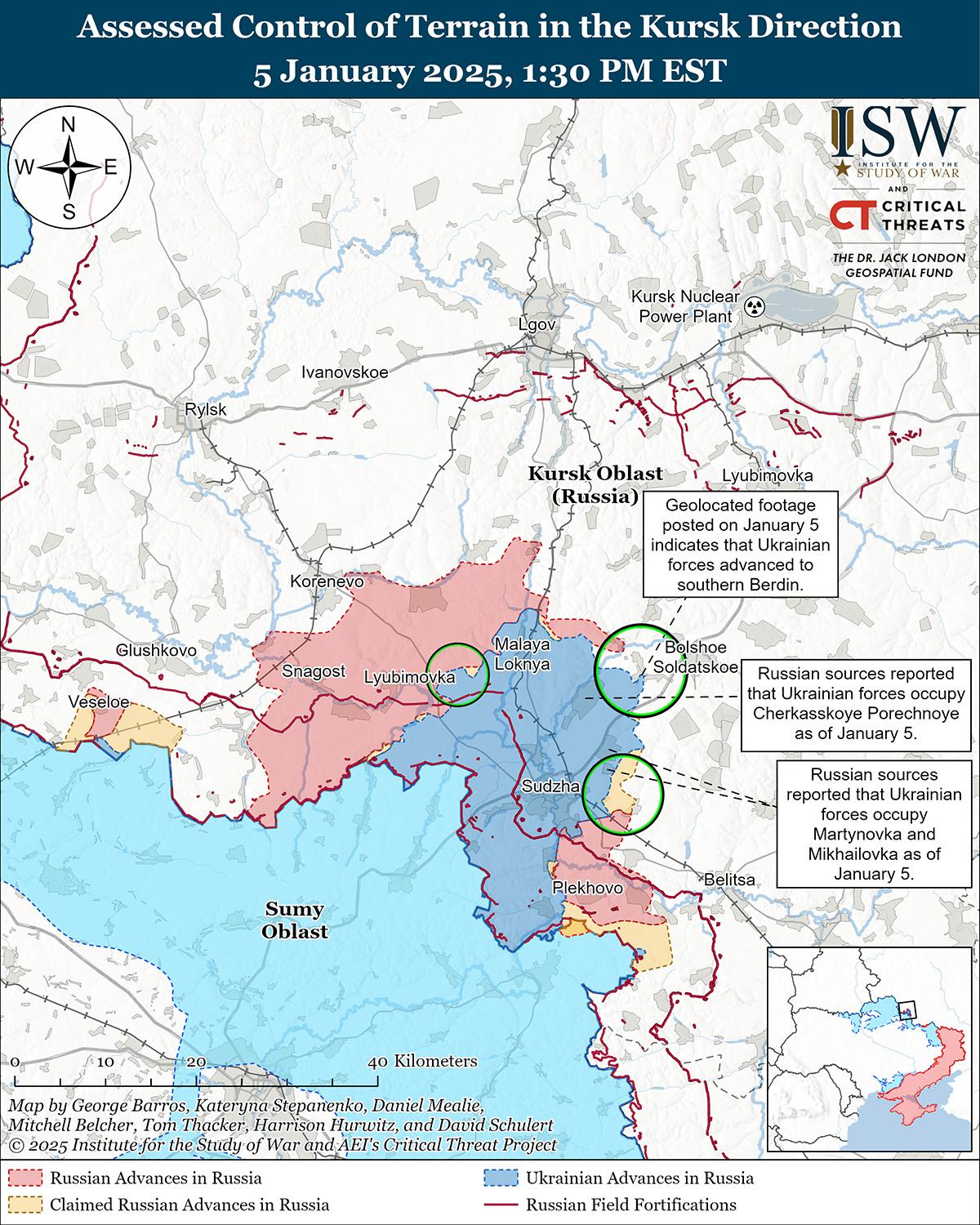 5 января украинские войска возобновили наступательные действия как минимум на трех участках в пределах Курской области и добились тактических успехов. Российские источники утверждали, что украинские войска провели несколько механизированных штурмов силой примерно до роты на Бердин-Новосотницком направлении (к северо-востоку от Суджи) в три волны с использованием бронетехники численностью примерно в батальон. [1] Российские источники утверждали, что украинские войска также активизировали наступательные действия в направлении Леонидово (к юго-востоку от Коренево) и провели усиленный взводный механизированный штурм в районе Пушкарного (к востоку от Суджи). [2] На геолоцированных кадрах, опубликованных 5 января, видно, что украинские войска продвинулись в полях к юго-западу и югу от Бердина и вошли в южную часть населенного пункта. [3] Российские военные блогеры опубликовали обновленные карты района боевых действий на Курской дуге, на которых указано, что по состоянию на 5 января украинские войска также заняли Черкасское Поречное, Мартыновку и Михайловку (все к северо-востоку от Суджи и к юго-западу от Бердина), а также сообщили, что украинские войска недавно вошли в Новосотницкий (к востоку от Бердина); и продвинулись на полях западнее Ямской Степи (непосредственно к северо-западу от Бердина) и западнее Новой Сорочины (севернее Суджи и северо-западнее Бердина). [4] Российские военные блогеры сообщали, что украинские войска также вели наступательные действия вблизи Никольского и Александрии (к востоку и юго-востоку от Леонидово соответственно) и к северу от Русской Конопелки (к востоку от Суджи) в направлении Пушкарного небольшими группами пехоты, но не сообщали подробностей о масштабах возможного украинского наступления в этих районах. [5] Российские военные блогеры в основном выражали обеспокоенность тем, что возобновление украинских усилий в Курской области может быть отвлекающим маневром, и утверждали, что еще слишком рано определять, могут ли эти операции в Курске быть частью будущих основных усилий. [6]