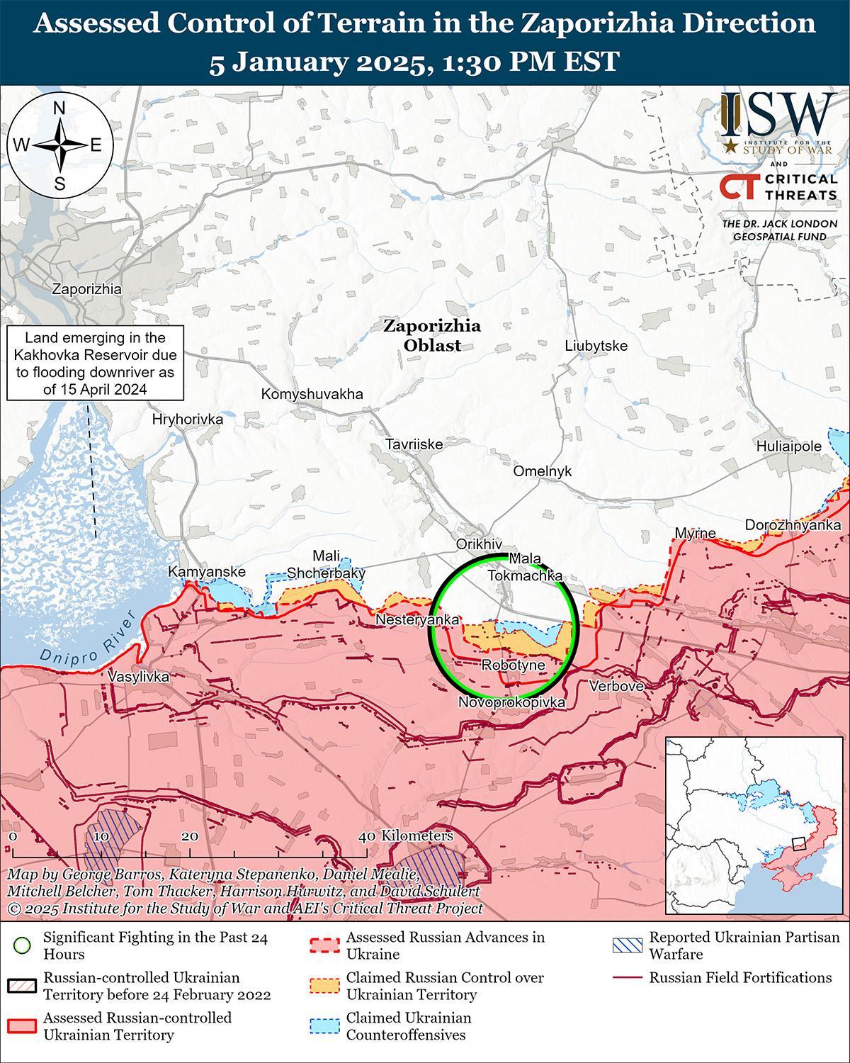 5 января российские войска продолжили наземные атаки на западе Запорожской области, но не добились подтвержденных успехов. Российский военный блогер заявил, что российские войска незначительно продвинулись в районе Новоданиловки (к северу от Работино), но ISW не обнаружил визуального подтверждения этого заявления. [69] 4 и 5 января российские войска также продолжили наземные атаки вблизи Белогорья (к северо-западу от Работино) и Малой Токмачки (к северо-востоку от Работино). [70] Главное управление военной разведки Украины (ГУР) сообщило 5 января, что в результате удара беспилотника ГУР во время движения по трассе Васильевка-Токмак 29 декабря 2024 года был убит Сергей Мельников, начальник штаба североосетинского добровольческого батальона «Штурм Осетия» (по имеющимся данным, 429-го мотострелкового полка, 19-й мотострелковой дивизии, 58-й общевойсковой армии [ОА], Южного военного округа [ЮВО]).[71] 30 декабря добровольческий батальон «Штурм Осетия» подтвердил, что Мельников был убит в бою.[72]