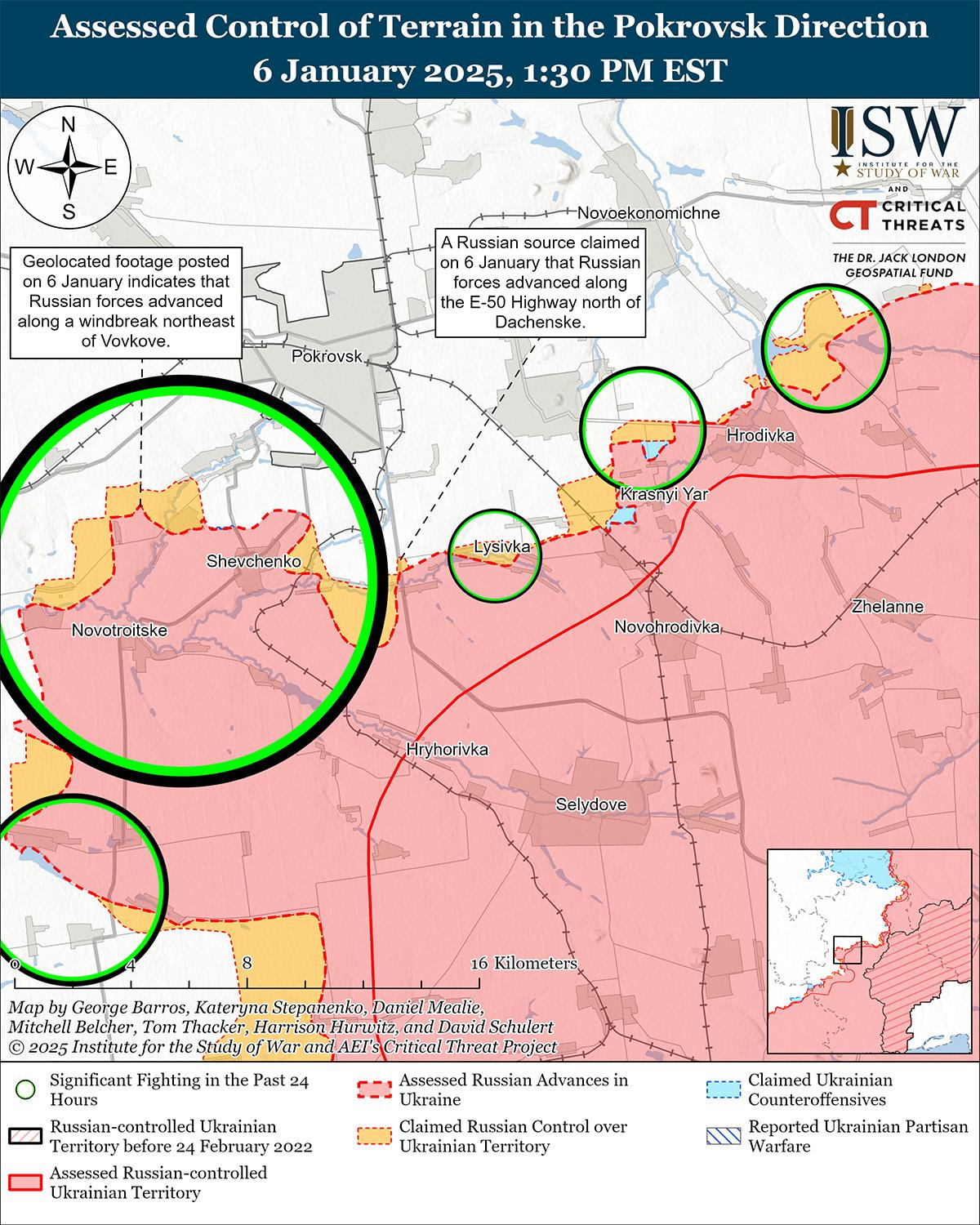 Украинские и российские войска недавно продвинулись на Покровском направлении на фоне продолжающихся российских наступательных действий в этом районе 6 января. Геолоцированные кадры, опубликованные 6 января, свидетельствуют о том, что украинские войска продвинулись на северо-западных окраинах Воздвиженки (к востоку от Покровска). [49] Дополнительные геолоцированные кадры, опубликованные 6 января, указывают на то, что российские войска недавно продвинулись к северо-востоку от Волково (к юго-западу от Покровска). [50] Министерство обороны России заявило 6 января, что российские войска захватили Даченское (к югу от Покровска), которое, по оценкам ISW, было захвачено российскими войсками по состоянию на 22 декабря. [51] Российские военные блогеры утверждали, что российские войска продвинулись к востоку от Воздвиженки, в Барановку (к северо-востоку от Воздвиженки), в районе Елизаветовки (к западу от Воздвиженки), в восточное Зеленое (к югу от Покровска), к югу от Звирово (к юго-западу от Покровска) и к северу от Волково, но ISW не зафиксировал подтверждения этих заявлений. [52] Российские войска вели наступательные действия в районе Покровска; к востоку от Покровска в районе Тарасовки, Елизаветовки, Воздвиженки, Миролюбовки и Проминя; юго-восточнее Покровска в районе Лысовки; южнее Покровска в районе Зеленого и Нового Труда; и к юго-западу от Покровска в районе Песчаного, Соленого, Нововасильевки, Новоелизаветовки и Ясеново 5 и 6 января. [53] Сообщается, что подразделения российской 5-й мотострелковой бригады (51-я общевойсковая армия [ОА], бывший 1-й АК Донецкой Народной Республики [ДНР]) продолжают действовать вблизи Воздвиженки, а на Покровском направлении действуют подразделения добровольческого отряда «Максим Кривонос», якобы сформированного из бывших военнослужащих ВСУ, перешедших воевать на сторону России. [54]