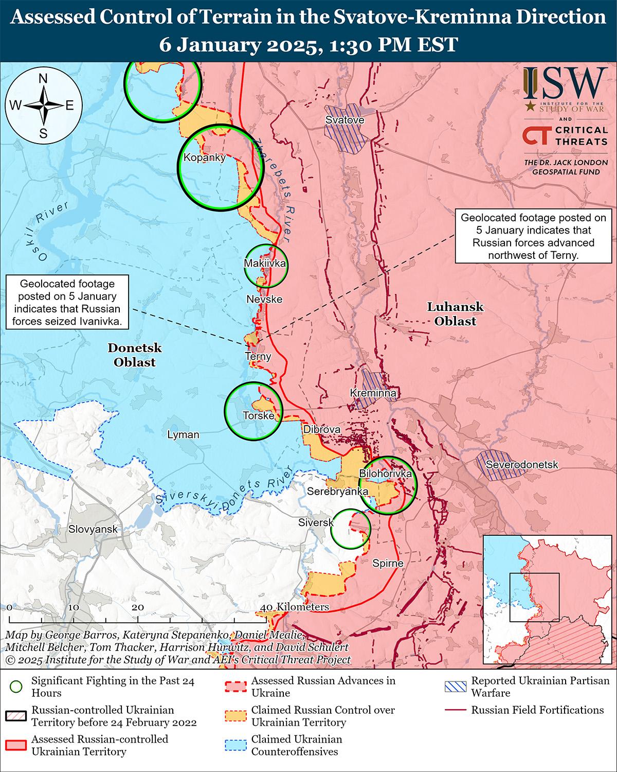 В последнее время российские войска продвинулись к северо-западу от Кременной на фоне продолжающихся наступательных действий на Лиманском направлении 6 января. Геолоцированные кадры, опубликованные 5 и 6 января, указывают на то, что российские войска, как сообщается, подразделения российской 144-й мотострелковой дивизии (20-я общевойсковая армия, Московский военный округ), вероятно, захватили Ивановку и продвинулись к юго-западу от населенного пункта, а также в полях к северо-западу от Терны (оба к северо-западу от Кременной). [34] 6 января российский военный блогер заявил, что российские войска продвинулись дальше в полях к юго-западу от Ивановки, но ISW не обнаружил визуальных подтверждений того, что российские войска продвинулись в таких масштабах, как утверждает военный блогер. [35] 5 и 6 января российские войска также продолжили наземные атаки к северо-западу от Кременной в районе Терны и к западу от Кременной в районе Заречного. [36]