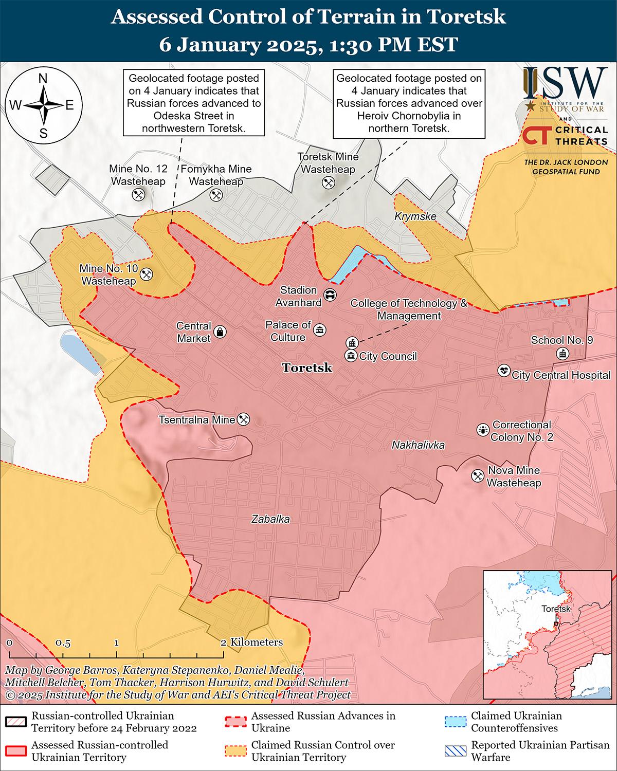 Российские войска недавно продвинулись в Торецке на фоне продолжающихся российских наступательных действий в этом районе 6 января. Геолоцированные кадры, опубликованные 4 января, свидетельствуют о том, что в последнее время российские войска продвинулись по улицам Героев Чернобытного и Даргомышского на северо-западе Торецка. [43] На дополнительных геолоцированных кадрах, опубликованных 6 января, видно, что в последнее время российские войска продвинулись вдоль улиц 3-й Горной и 4-й Горной на севере Торецка. [44] Российский военный блогер утверждал, что российские войска добились дополнительных успехов на севере, северо-востоке и юго-западе Торецка, а также к западу от Крымского (к северо-востоку от Торецка), однако в ISW не обнаружили визуального подтверждения этих заявлений. [45] Украинская группировка войск «Хортица» сообщила 6 января, что российские войска вели наступление с использованием неустановленного количества бронетехники в направлении Щербиновки (к юго-западу от Торецка). [46] Российский военный блогер заявил 6 января, что российские войска оккупировали 85% Торецка, хотя, по оценкам ISW, по состоянию на 6 января российские войска оккупировали 69,4% населенного пункта. [47] Российские войска продолжали наступление в самом Торецке и его окрестностях; северо-восточнее Торецка в районе Крымского; и юго-западнее Торецка в районе Щербиновки 5 и 6 января. [48]