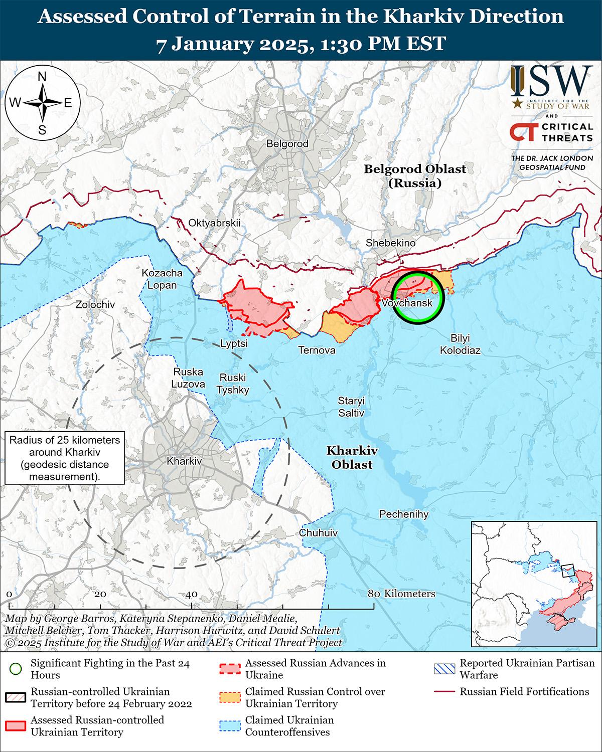 6 и 7 января российские войска продолжили ограниченные наземные атаки к северо-востоку от Харькова в районе Волчанска и Тихое, но не добились подтвержденных успехов. [31] Представитель украинской бригады, действующей на Харьковском направлении, сообщил 7 января, что российские войска проводят до пяти штурмов в день под Волчанском и что российские войска несколько увеличили использование планирующих бомб в этом районе. [32]