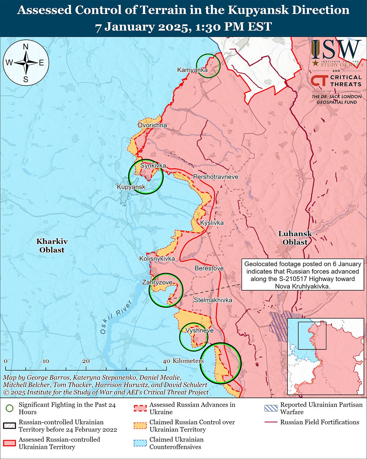 В последнее время российские войска продвинулись к северо-востоку от Боровой на фоне продолжающихся наступательных действий на Боровом направлении 7 января. На геолоцированных кадрах, опубликованных 6 января, видно, что российские войска, в том числе, как сообщается, подразделения 27-й мотострелковой бригады (1-я гвардейская танковая армия, Московский военный округ), продвинулись вдоль дороги С-210517 к северо-западу от Лозовой (к северо-востоку от Боровой) во время сокращенного механизированного штурма в составе роты. [38] Российские военные блогеры 6 и 7 января утверждали, что российские войска продвинулись на три километра от Лозовой и заняли позиции в направлении Новой Крутяковки (к северо-востоку от Боровой) и продвигаются в районе Макеевки (к юго-востоку от Боровой). [39] Российские войска атаковали северо-восточнее Боровой в районе Загрызово; к востоку от Боровой у Надежды и Першотравневого; и юго-восточнее Боровой в районе Новосергиевки, Чернещины и Макеевки 6 и 7 января. [40] Командир украинского батальона, действовавшего на Боровом направлении, 7 января заявил, что украинские войска отразили российские атаки в районе Лозовой, Загрызово и Колесниковки. [41] Трегубов заявил, что небольшие группы российских военнослужащих пытаются выйти к реке Оскол в направлении Боровой. [42] Командир украинского батальона, действовавшего на Боровом направлении, также заявил, что российские войска потеряли почти 100 единиц бронетехники и понесли значительные потери во время недавних попыток войти в Крутяковку (северо-восточнее Боровой). [43]
