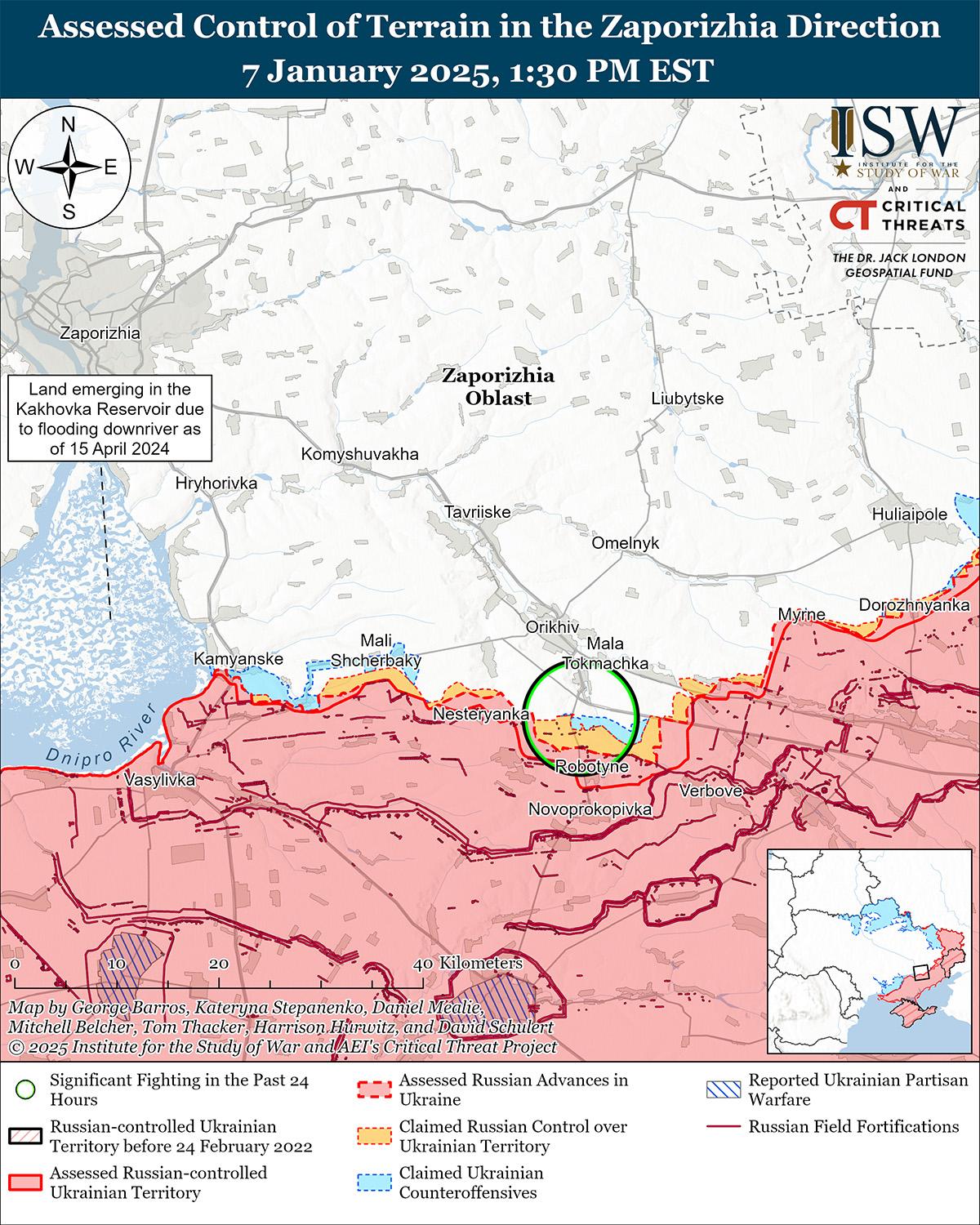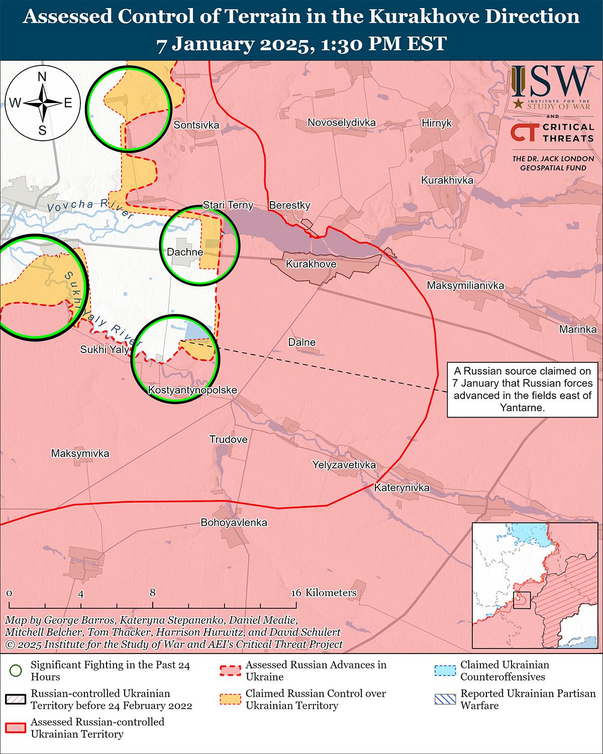 7 января враг продолжил наступательные действия на Кураховском направлении, но подтвержденных успехов не достиг. Спикер Хортицкой группировки войск майор Виктор Трегубов заявил, что украинские войска все еще ведут оборону на западных окраинах Курахово и удерживают позиции на Кураховской тепловой электростанции (ТЭС). [54] Трегубов отметил, что российские войска пытаются сравнять Курахово с землей. Спикер штаба украинской бригады, действующей на Кураховском направлении, заявил, что на Кураховском направлении сосредоточена самая крупная российская группировка войск и группировка постоянно пополняет передовые подразделения для поддержания темпа наступательных действий. [55] По словам пресс-секретаря, недавно развернутые российские войска часто проходят подготовку менее двух недель перед отправкой на линию фронта в районе Курахово. Пресс-секретарь заявил, что российские войска используют на этом направлении меньше бронетехники, чем в конце 2024 года. Российские военные блогеры 6 и 7 января утверждали, что российские войска захватили Шевченко (к западу от Курахово) и продвинулись на полях к западу от Петропавловки (к северо-западу от Курахово) и в двух километрах к западу от Сухих Ялов (к юго-западу от Курахово). [56] 7 января российский военный блогер заявил, что части российской 114-й мотострелковой бригады (51-я ОА) продвигаются в направлении Андреевки (к западу от Курахово) и недавно захватили украинские позиции возле Дачного вдоль реки Волчья (к западу от Курахово) после временного отдыха и восстановления на неопределенный период времени. [57] Однако ISW не обнаружил подтверждения этого заявления. Российские войска вели наступательные действия в районе самого Курахово; к северо-западу от Курахово в районе Петропавловки, Срибного и Словянки; к западу от Курахово в районе Андреевки, Дачного и Константинополя; и к юго-западу от Курахово в районе Константинопольского, Сухого Яра, Янтарного и Зеленовки 6 и 7 января. [58] Сообщается, что на Кураховском направлении действуют подразделения российского 33-го мотострелкового полка (20-я мотострелковая дивизия, 8-я ОА, Южный военный округ) и операторы беспилотников 57-го мотострелкового полка (20-я мотострелковая дивизия), а в западном Курахово – артиллеристы 238-й артиллерийской бригады (8-я ОА). [59]
