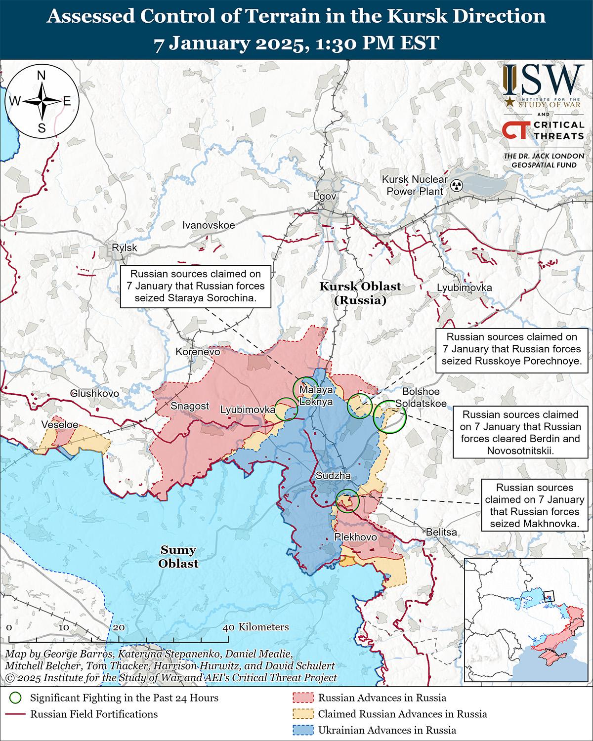Недавно украинские войска продвинулись на своем главном выступе в Курской области на фоне ограниченных наступательных операций в этом районе 7 января. Геолоцированные кадры, опубликованные 6 января, указывают на то, что украинские войска недавно продвинулись в северной части Погребки (к северо-западу от Суджи). [26] Российский военный блогер утверждал, что украинские войска удерживают позиции в оспариваемой «серой зоне» под Бердиным. [27] 7 января российский источник заявил, что российские войска вытеснили украинские войска из Погребок. [28] Российские источники утверждали, что украинские войска безуспешно атаковали в направлении Суджа – Большое Солдатское, в направлении Бердина и в районе Черкасского Поречного. [29]