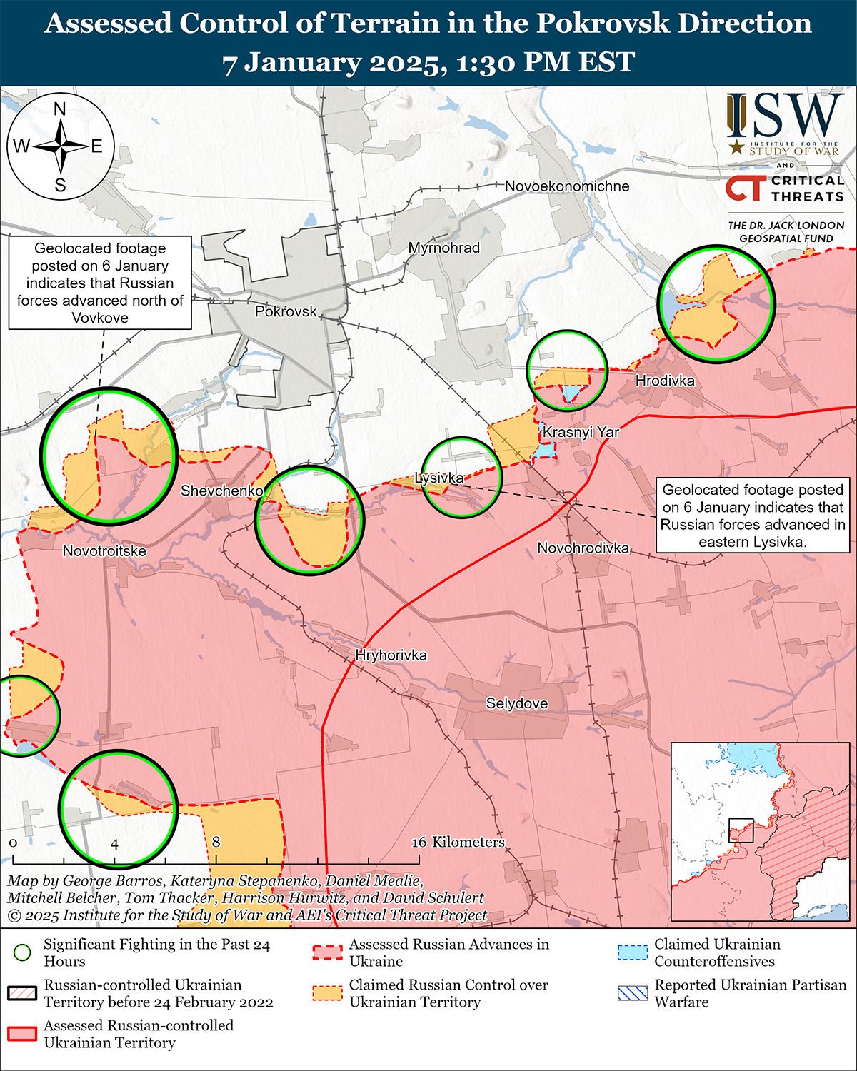 В последнее время российские войска продвинулись на Покровском направлении на фоне продолжающихся наступательных действий в этом районе 7 января. Геолоцированные кадры, опубликованные 6 и 7 января, свидетельствуют о том, что в последнее время российские войска продвинулись в восточной части Лысовки (к юго-востоку от Покровска), к северу от Волково (к юго-западу от Покровска) и к северо-западу от Воздвиженки (к востоку от Покровска). [50] Российский военный блогер утверждал, что российские войска добились дополнительных успехов к северо-западу от Волково, но ISW не обнаружил подтверждения этому заявлению. [51] Российские войска вели наступательные действия в районе Покровска; к востоку от Покровска в районе Водяного Второго, Тарасовки, Елизаветовки, Миролюбовки и Проминя; юго-восточнее Покровска в районе Лысовки; южнее Покровска в районе Шевченко, Зеленого и Нового Труда; и к юго-западу от Покровска в районах Новоелизаветовки, Украинки, Ясеново, Котлино и Песчаного 6 и 7 января. [52] Сообщается, что под Покровском действуют подразделения российской 35-й мотострелковой бригады (41-я общевойсковая армия, Центральный военный округ). [53]