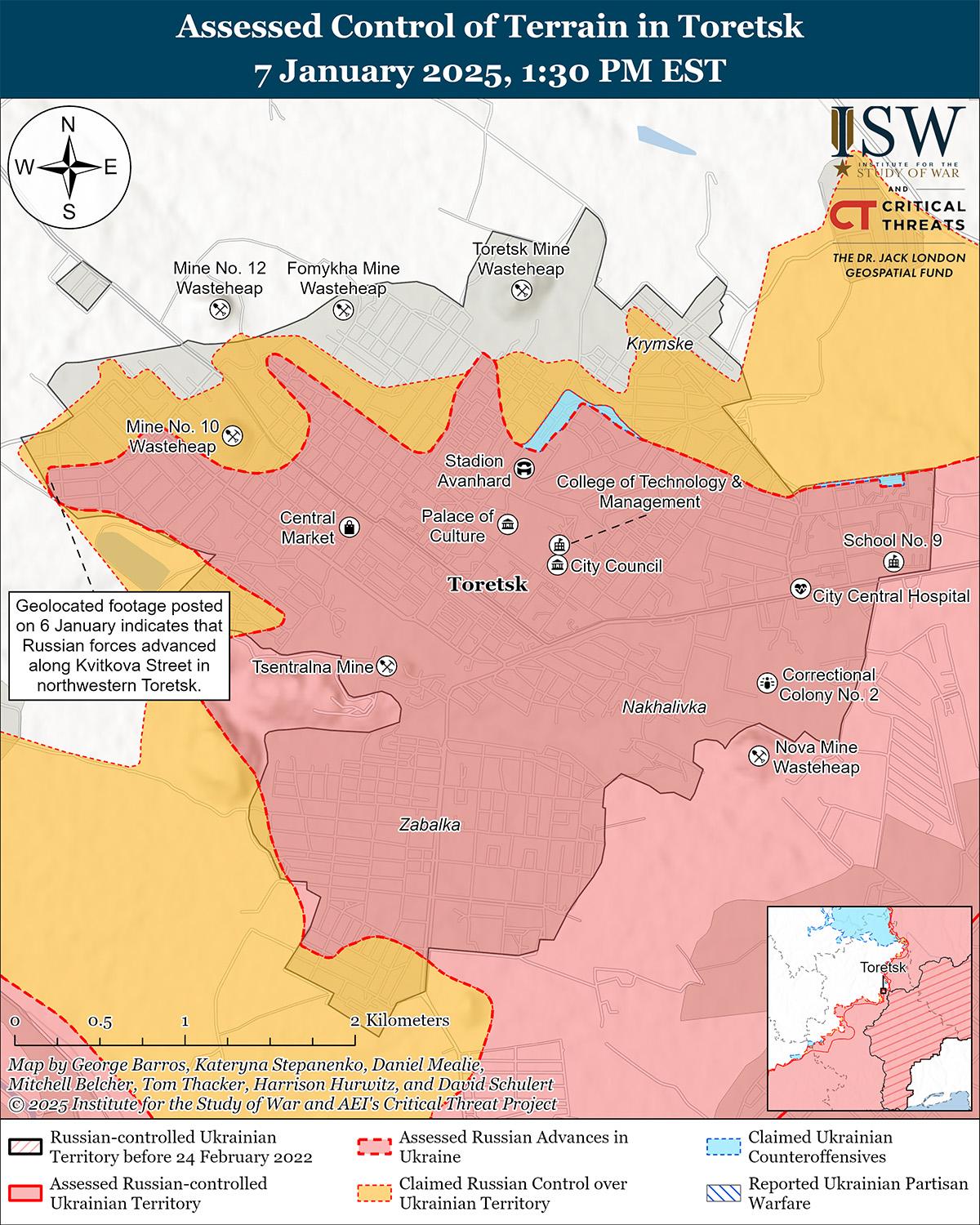 Российские войска недавно продвинулись на северо-западе Торецка после нескольких недель более быстрых наступательных операций и успехов в этом районе. На опубликованных 6 января геолоцированных кадрах указано, что в последнее время российские войска продвинулись вдоль улицы Цветочной и вышли к северо-западной административной границе Торецка. [1] Российский военный блогер заявил, что российские войска продвинулись вдоль улицы Пирогова на севере Торецка, но ISW не обнаружил подтверждения этому заявлению. [2] Другой российский военный блогер утверждал, что российские войска оккупировали примерно 90 процентов Торецка, но ISW изучил только геолоцированные кадры, чтобы оценить, что по состоянию на 7 января российские войска оккупировали около 71 процента населенного пункта. [3] В июне 2024 года российские войска активизировали наступательные действия на Торецком направлении, что, вероятно, должно было уменьшить украинский выступ в этом районе и лишить украинские войска возможности обстреливать тыловые российские районы на направлениях Часов Яр и Покровск, которые в то время были основными усилиями России. [4] В июне 2024 года российские войска использовали ограниченную боевую мощь, включая части 51-й общевойсковой армии (ОА) России (бывший 1-й армейский корпус Донецкой Народной Республики [АК ДНР]), территориальные войска и некоторые подразделения Центрального военного округа (ЦВО), для активизации боевых действий под Торецком. [5] С июня 2024 года российские войска добились ползучих и упорных успехов в Торецке и близлежащих населенных пунктах, но в последние недели активизировали наступательные действия и добились тактических успехов на севере и северо-западе Торецка. [6]