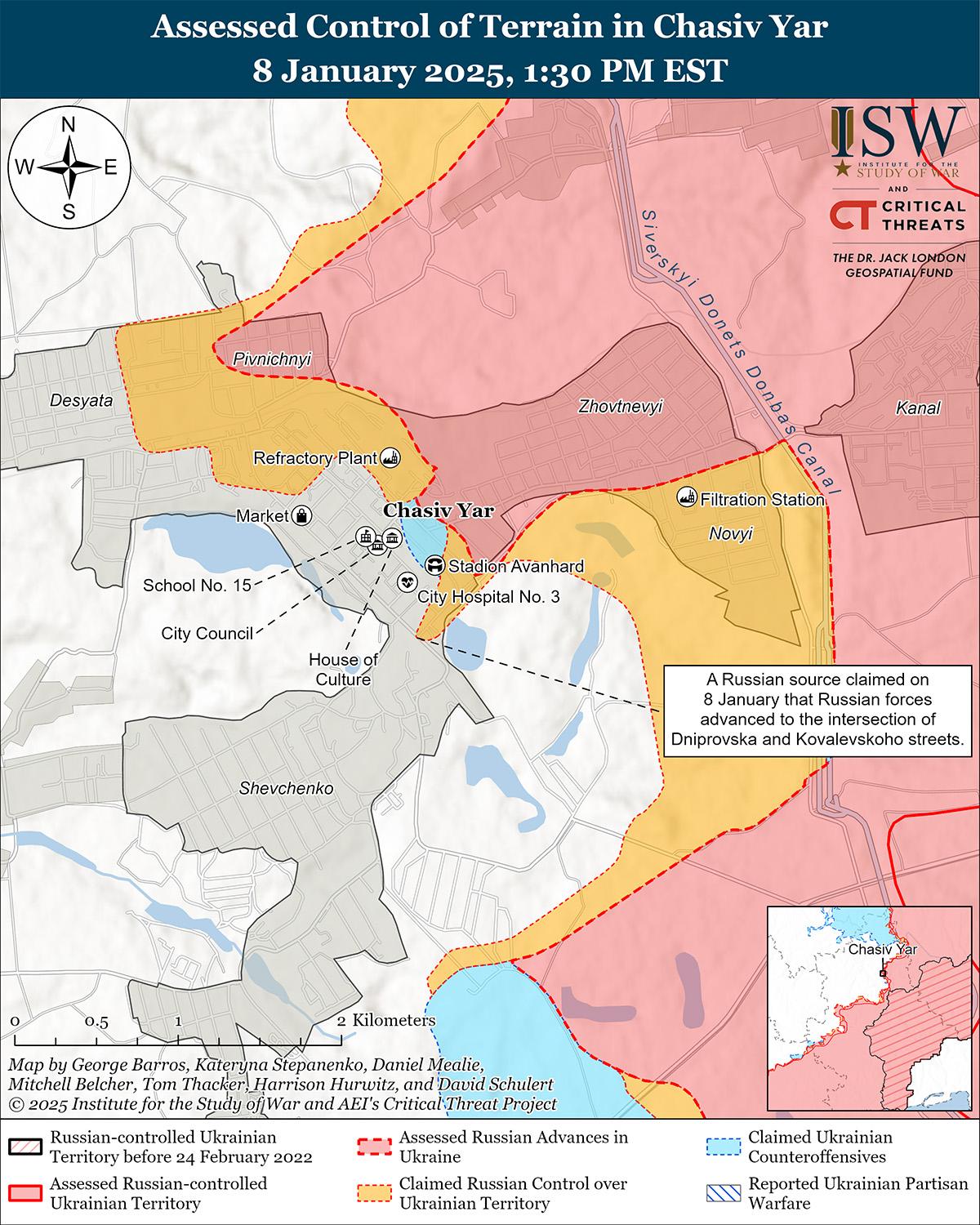 8 января враг продолжил наступательные действия на направлении Часов Яр, но подтвержденных успехов не имел. Российские военные блогеры утверждали, что подразделения российского 217-го воздушно-десантного полка (98-я дивизия ВДВ) продвинулись к пересечению улиц Днепровской и Ковалевского в центре Часова Яра, а российские войска продвинулись к югу от Орехово-Васильевки (к северу от Часов Яра). [29] Однако ISW не обнаружил подтверждения этих заявлений. Враг продолжил наступление в районе Часова Яра; к северо-востоку от Часова Яра в районе Васюковки и Бондарного; и южнее Часова Яра в районе Ступочков и Белой Горы 7 и 8 января. [30] Сообщается, что подразделения российской 200-й мотострелковой бригады (14-й армейский корпус Ленинградского военного округа) и 331-го полка ВДВ (98-я дивизия ВДВ) действуют в районе Огнеупорного завода в центре Часова Яра. [31]