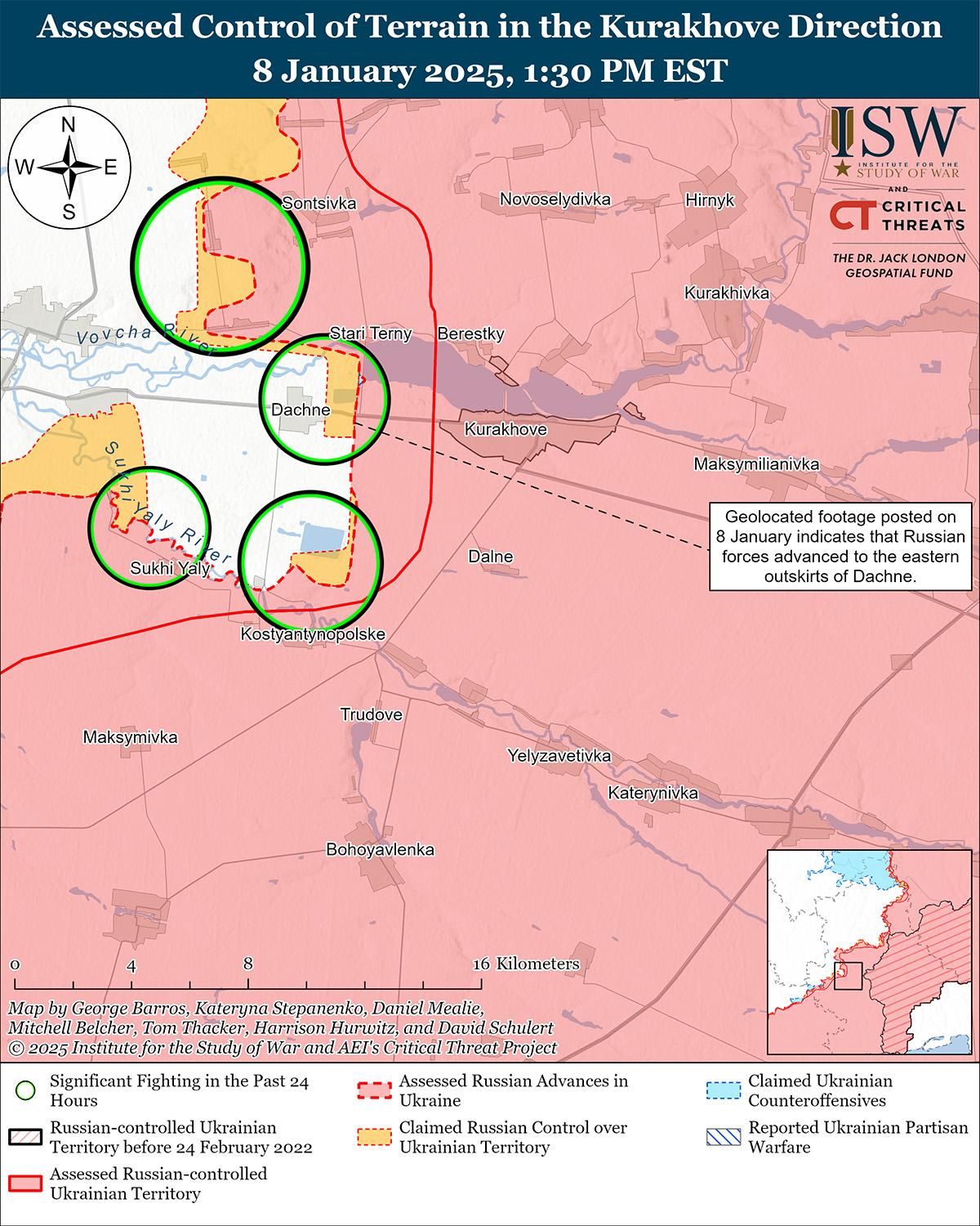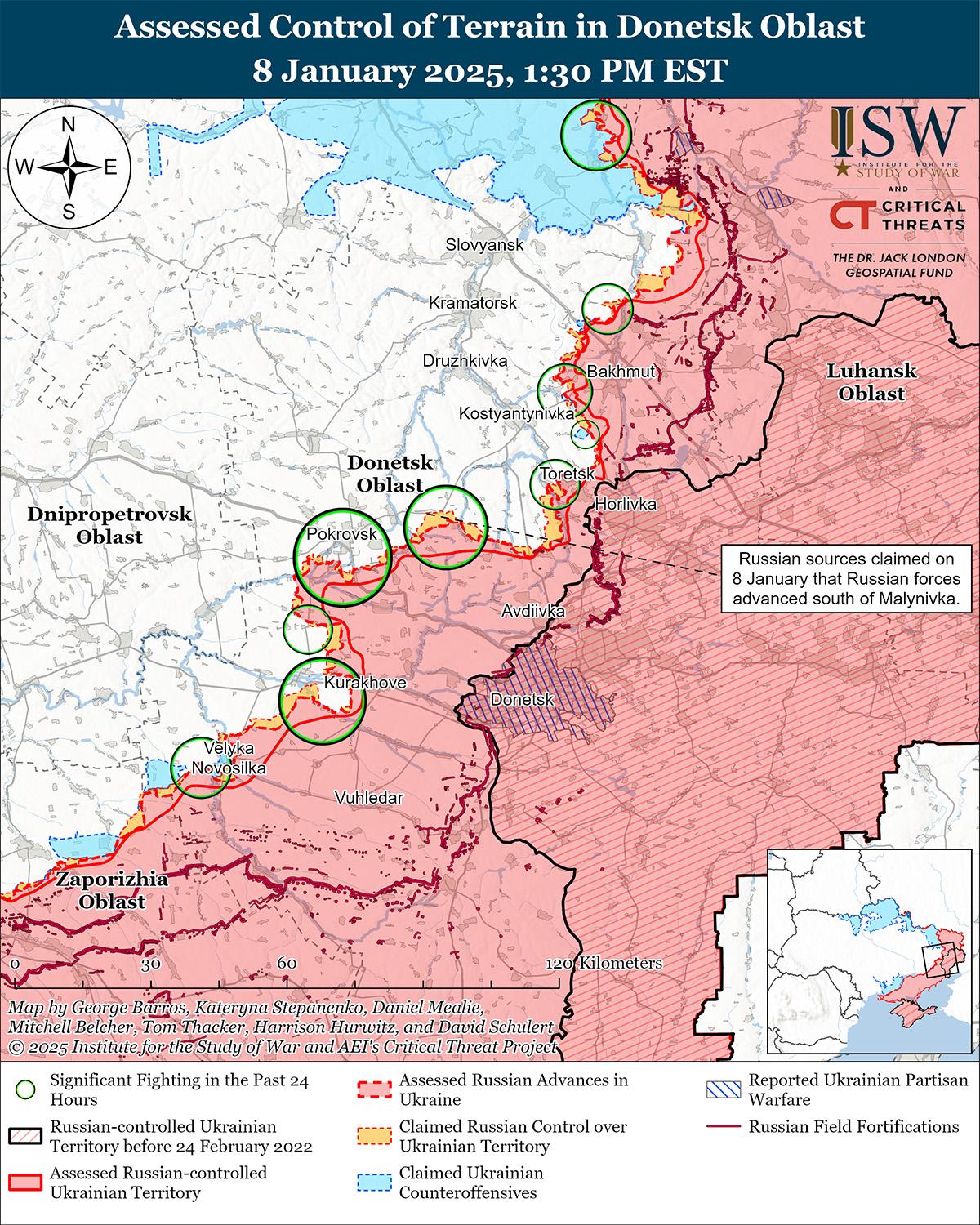 Российские военные блогеры утверждали, что российские войска недавно перехватили трассу Т-0504 Покровск-Константиновка к северо-востоку от Покровска на фоне продолжающихся наступательных действий под Покровском 8 января. Российские военные блогеры утверждали, что 7 января российские войска при поддержке бронетехники и неустановленного российского подразделения воздушно-десантных войск (ВДВ) перекрыли трассу в районе Малиновки (к северо-востоку от Покровска), но ISW не обнаружила подтверждения этому заявлению. [37] Другие российские военные блогеры утверждали, что российские войска продвинулись к северо-западным окраинам Зверево (к югу от Покровска) и что российское военное командование перебросило дополнительные силы для поддержки наступления на Котлино (юго-западнее Покровска), но охарактеризовали российское продвижение в этом районе как «ползучее». [38] Украинский военный обозреватель Константин Машовец заявил, что российское военное командование недавно ввело в бой к югу от Покровска подразделения 55-й, 35-й, 137-й и 74-й мотострелковых бригад (41-я ОА, Центральный военный округ [ЦВО]) под командованием 90-й танковой дивизии (41-я ОА) и 27-й мотострелковой бригады (2-я ОА, ЦВО).[39] Машовец заявил, что российские войска также недавно ввели в бой неуказанный мотострелковый полк в районе Воздвиженки (к востоку от Покровска). Старший сержант украинской бригады, действующей на покровском направлении, заявил, что российские войска недавно активизировали наступательные операции к югу от Мирнограда (чуть восточнее Покровска), перебросили в этот район свежие силы и используют гражданские транспортные средства для перевозки пехоты на передовые позиции для атак.[40] Украинский источник заявил, что российские войска перебрасывают неуказанные подразделения с Кураховского направления в район Мирнограда.[41] Российские войска продолжали наступательные операции в районе самого Покровска; к востоку от Покровска в районе Миролюбовки, Барановки, Елизаветовки, Тарасовки и Водяного Второго; к юго-востоку от Покровска в районе Лысовки и Сухого Яра; к югу от Покровска в районе Зеленого, Нового Труда и Зверево; и к юго-западу от Покровска в районе Котлино, Надеждинки, Нововасильевки и Ясеновое 7 и 8 января.[42] Сообщается, что подразделения российского 506-го мотострелкового полка (27-я мотострелковая дивизия, 2-я ОА, ЦВО) и 907-го разведывательного батальона действуют в районе Покровска.[43]