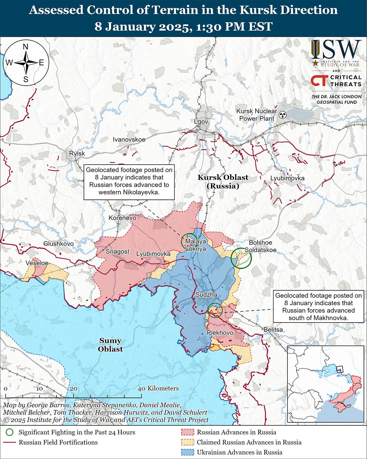 В последнее время российские войска продвинулись в Курской области на фоне продолжающихся наступательных действий в этом районе 8 января. Геолоцированные кадры, опубликованные 8 января, указывают на то, что российские войска продвинулись в западную часть Николаевки (к северо-западу от Суджи) и незначительно продвинулись в Махновке (к юго-востоку от Суджи). [7] 8 января Силы специальных операций (ССО) Украины сообщили, что украинские войска отразили усиленную российскую механизированную атаку численностью до взвода в неуказанном районе Курской области. [8] Российские военные блогеры утверждали, что российские войска продвинулись к северо-западу от Суджи в районе Малой Локни, Николаевки, Старой Сорочины, Орловки и Николаево-Дарьино; северо-восточнее Суджи в районе Русского Поречного и Черкасского Поречного; к востоку от Суджи в районе Бондаревки; и юго-восточнее Суджи в районе Махновки. [9] Российский военный блогер заявил, что российские войска захватили Косицу (к северо-востоку от Суджи) и что подразделения российской 34-й мотострелковой бригады (49-я общевойсковая армия, Южный военный округ) зачищают Погребки (к северо-западу от Суджи). [10] Однако ISW не обнаружил визуального подтверждения ни одного из этих заявлений. Российский военный блогер заявил, что украинские войска контратаковали под Погребками. [11] Сообщается, что подразделения российской 106-й воздушно-десантной дивизии (ВДВ) действуют в направлении Свердликово (северо-западнее Суджи). [12]